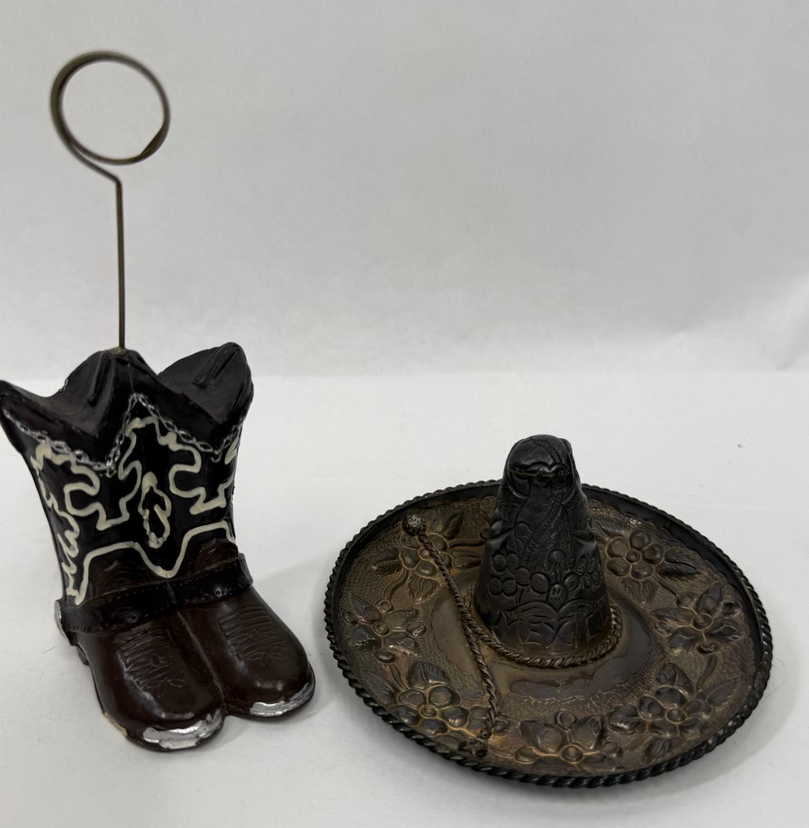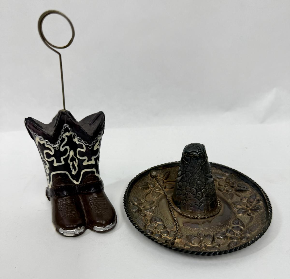 Sombrero marked "MEXICO" but no other markings. Approx. 4.25" across, boots are approx. 5.5" tall at the top of the holder ring. Both are in good condition.