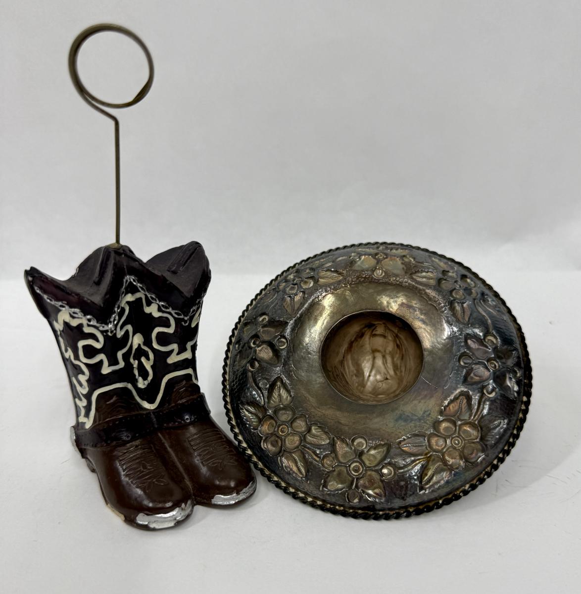 Vintage Mexico Silver Plate Sombrero Hat Snake Eagle Flowers and Cowboy Boots Nametag Holder