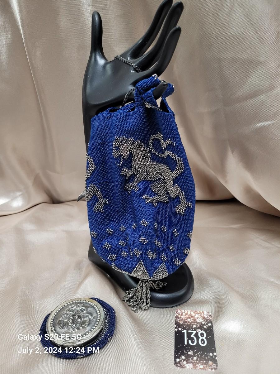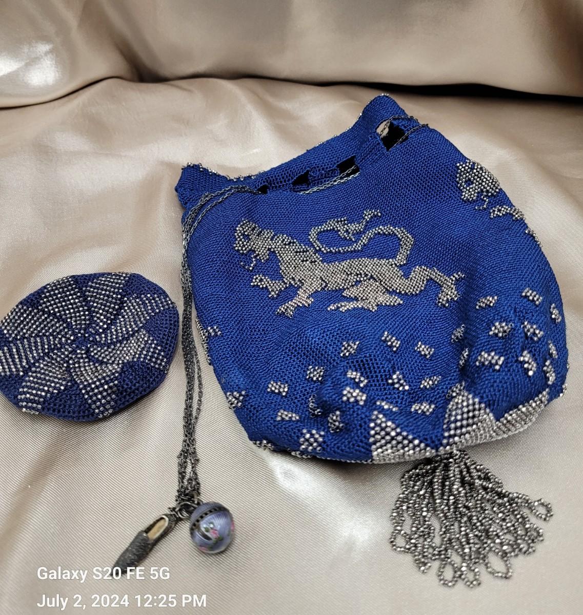 Cobalt blue beading with rampant lion detail, silver star and tassel at the bottom. Drawstring top with chain drawstring, Morraccan slipper charm at the drawstring. Coin purse with embossed silver top and star design on the base. This is an amazing set, a perfect accessory for your special event. Retail is about $300 9 inches long with tassel by 5 inches wide.