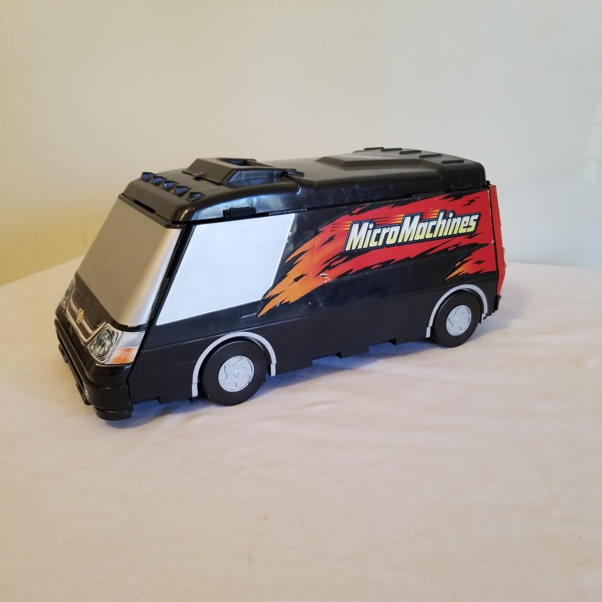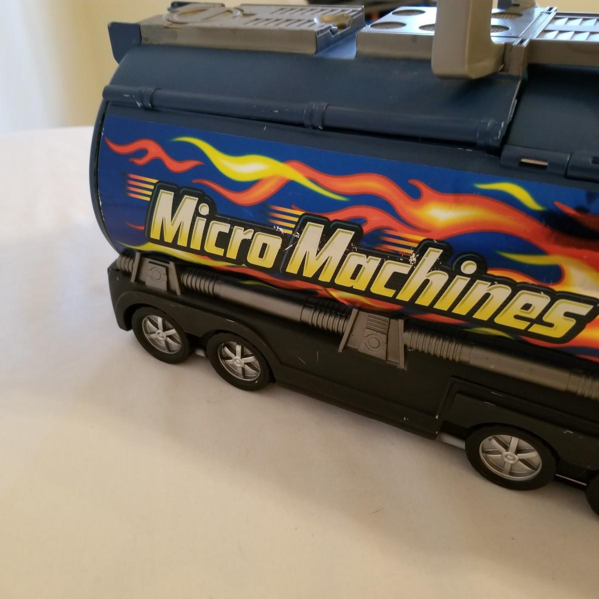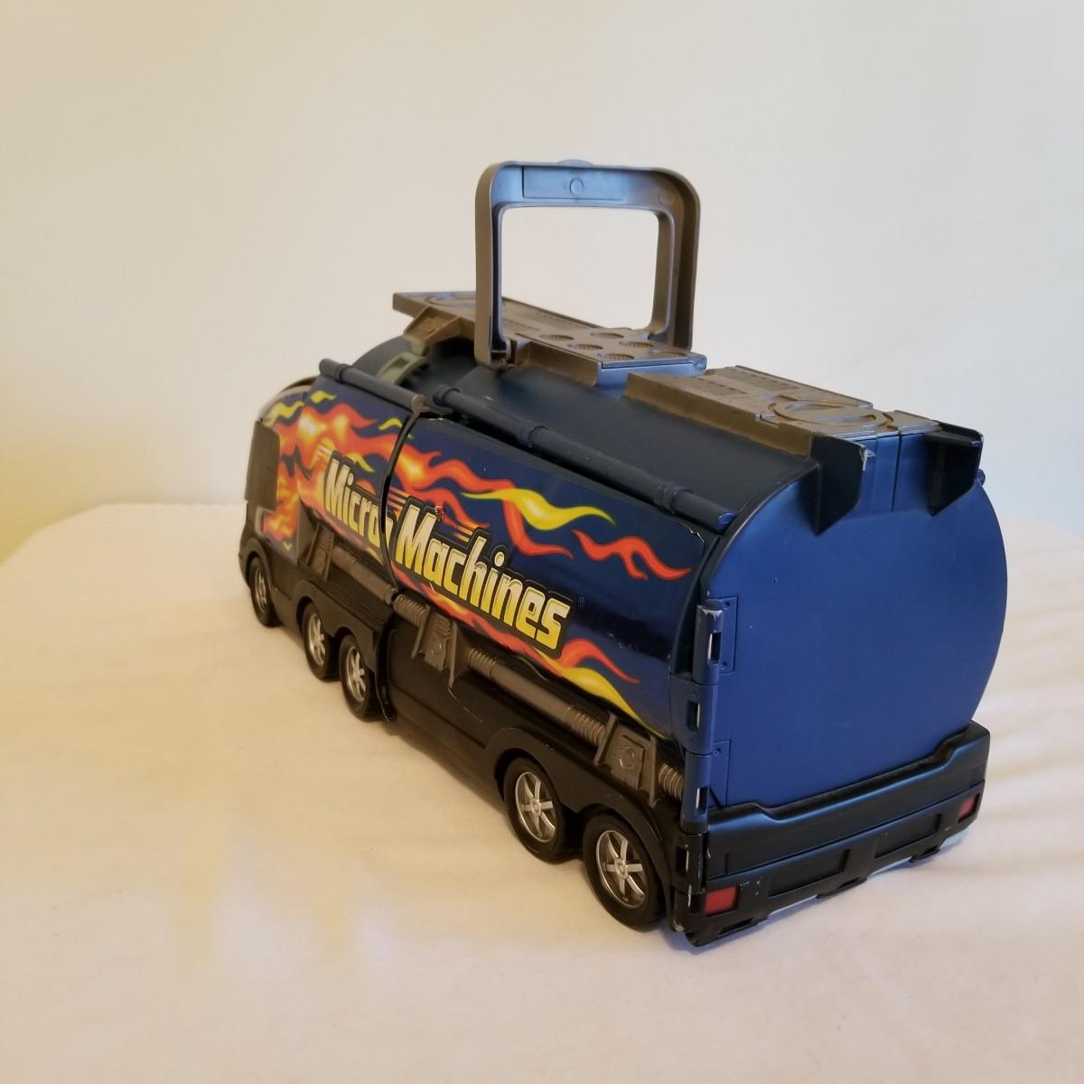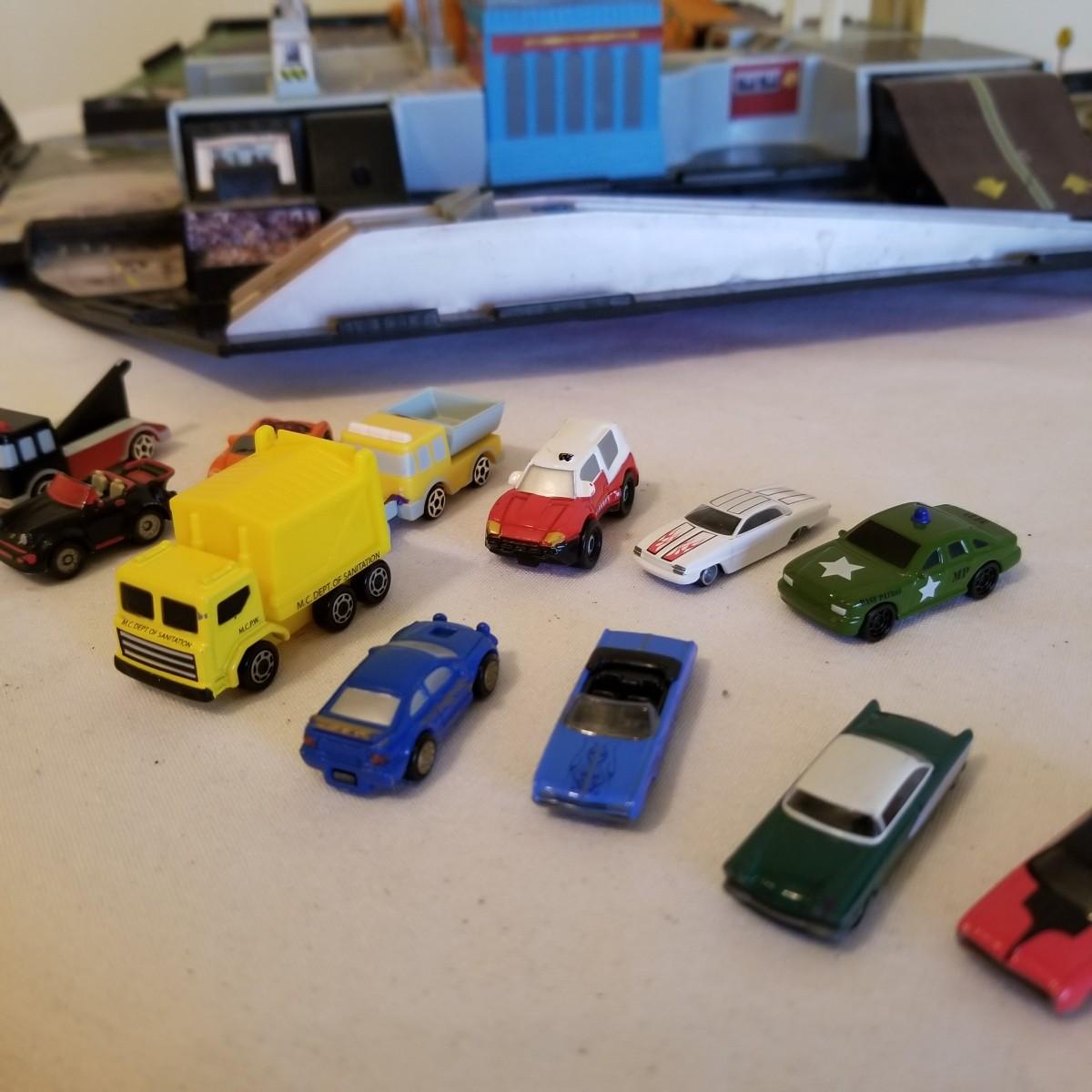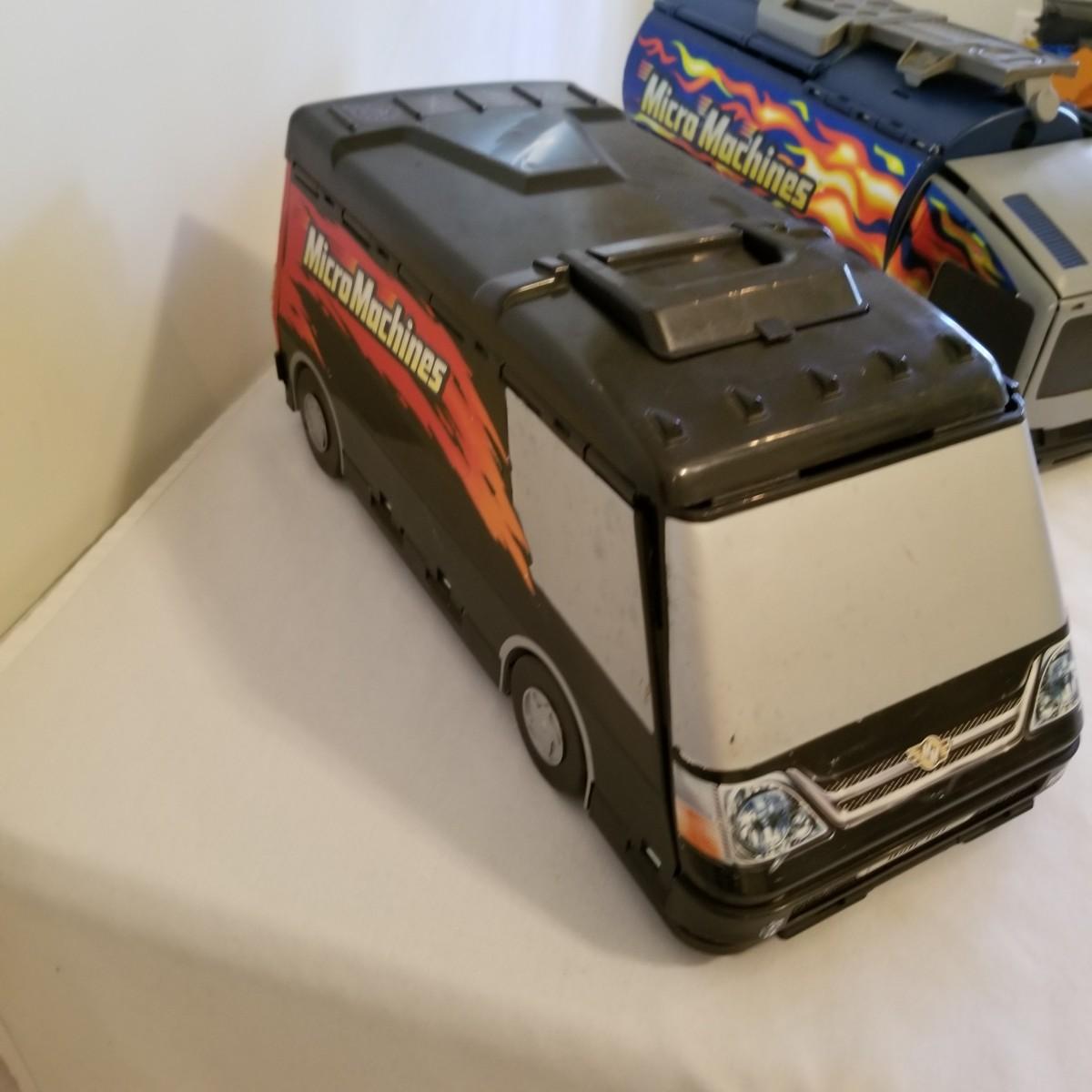 Two Micro Machines car playsets, Super Van City and Super Stunt City Semi Tanker. Both units from the 90's, open to reveal numerous opportunities to play with cars and trucks. Built in scenery, garages, ramps, roads, etc. Sixteen cars total for the two sets. Smaller unit measures 7"16"x7" closed, larger one is 6"x17"x7". Not certain if all original pieces are included. See photos for details. Shipping available.