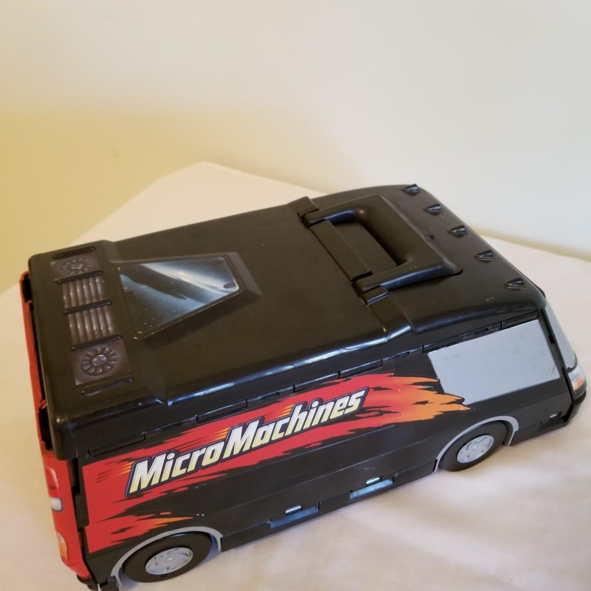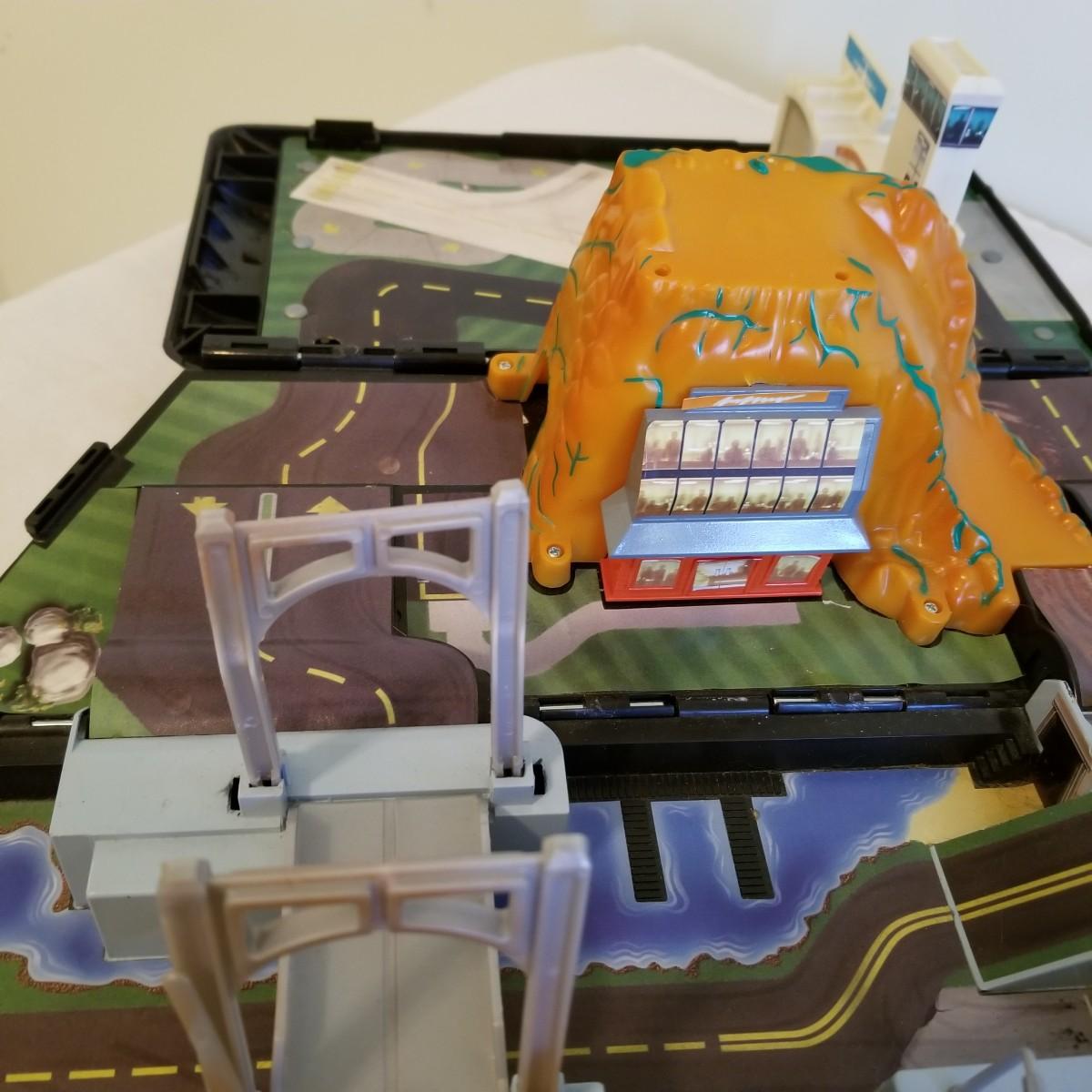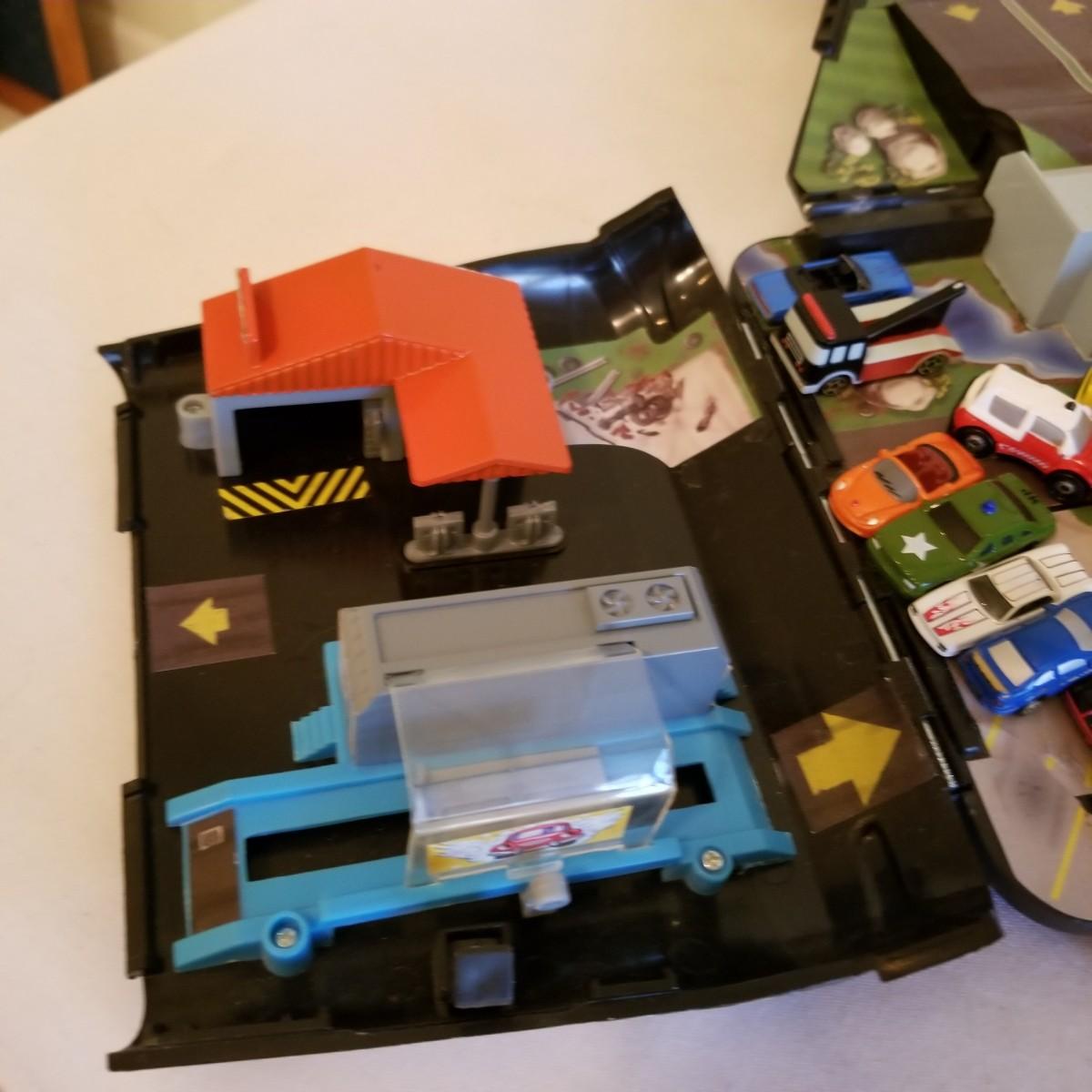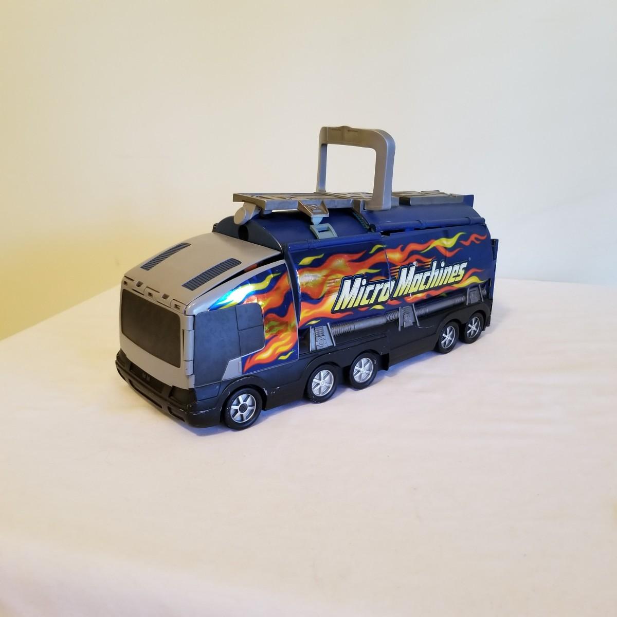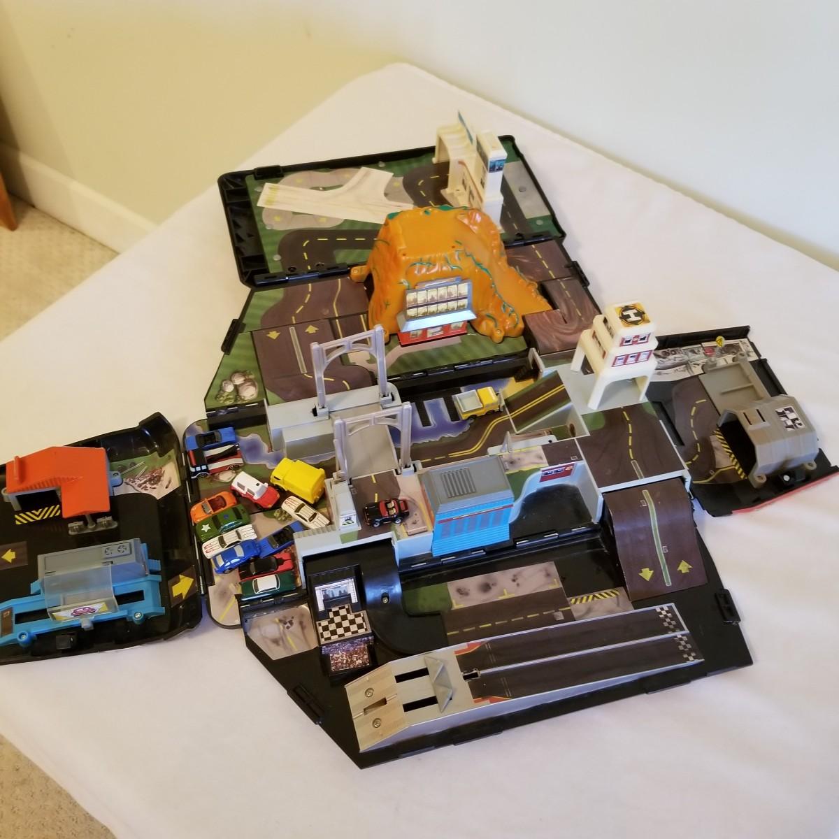 Two Micro Machines car playsets, Super Van City and Super Stunt City Semi Tanker. Both units from the 90's, open to reveal numerous opportunities to play with cars and trucks. Built in scenery, garages, ramps, roads, etc. Sixteen cars total for the two sets. Smaller unit measures 7"16"x7" closed, larger one is 6"x17"x7". Not certain if all original pieces are included. See photos for details. Shipping available.