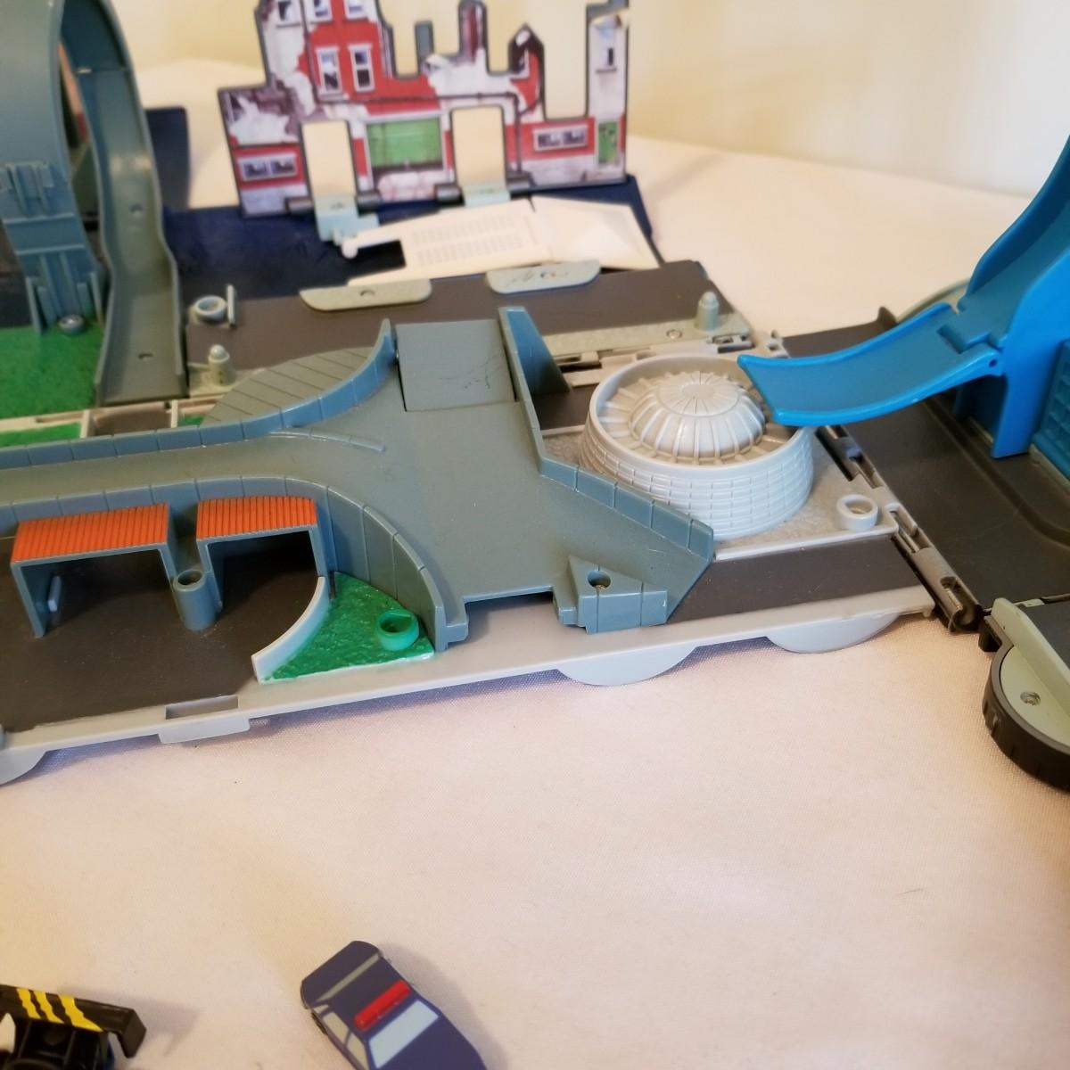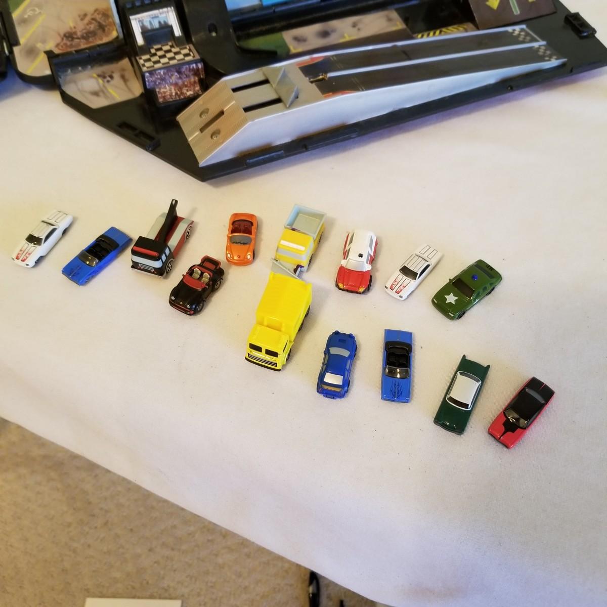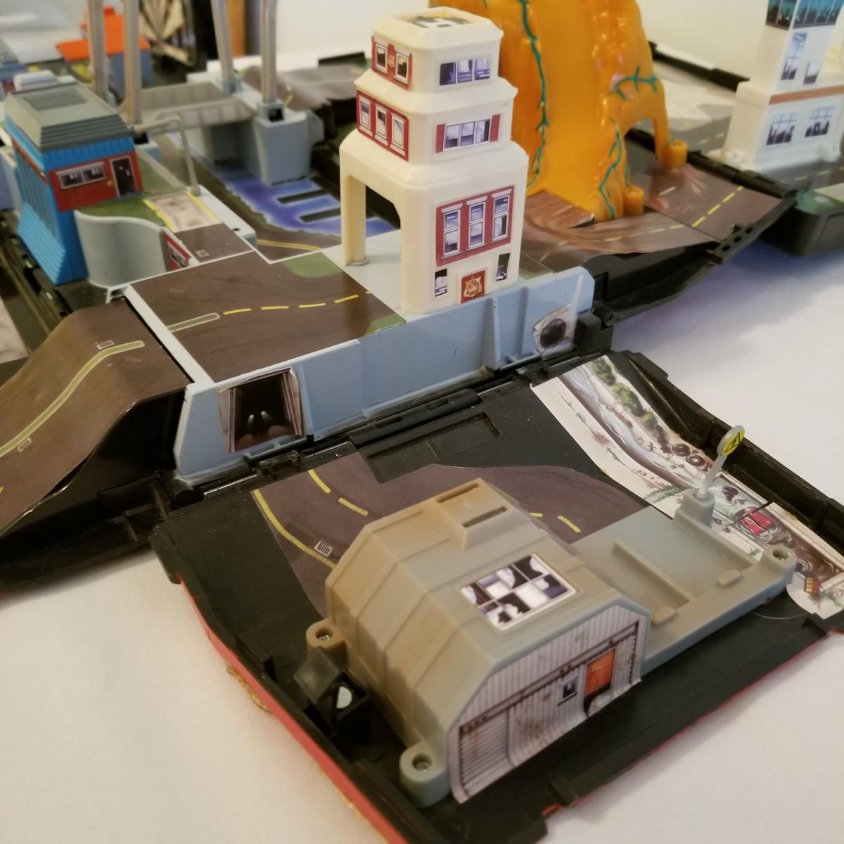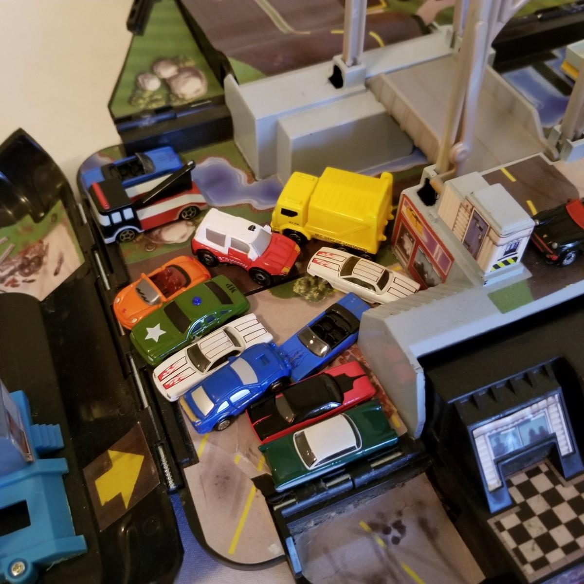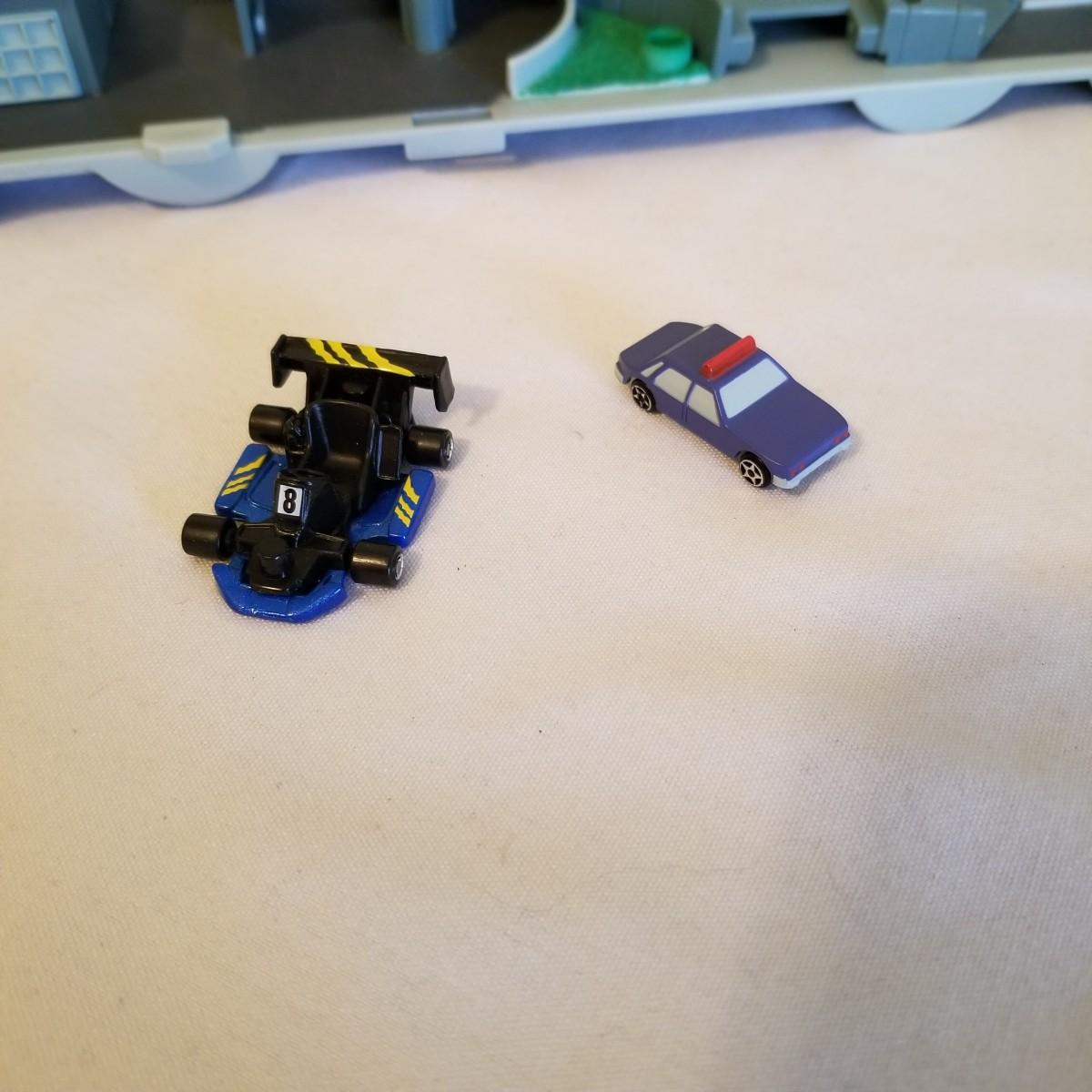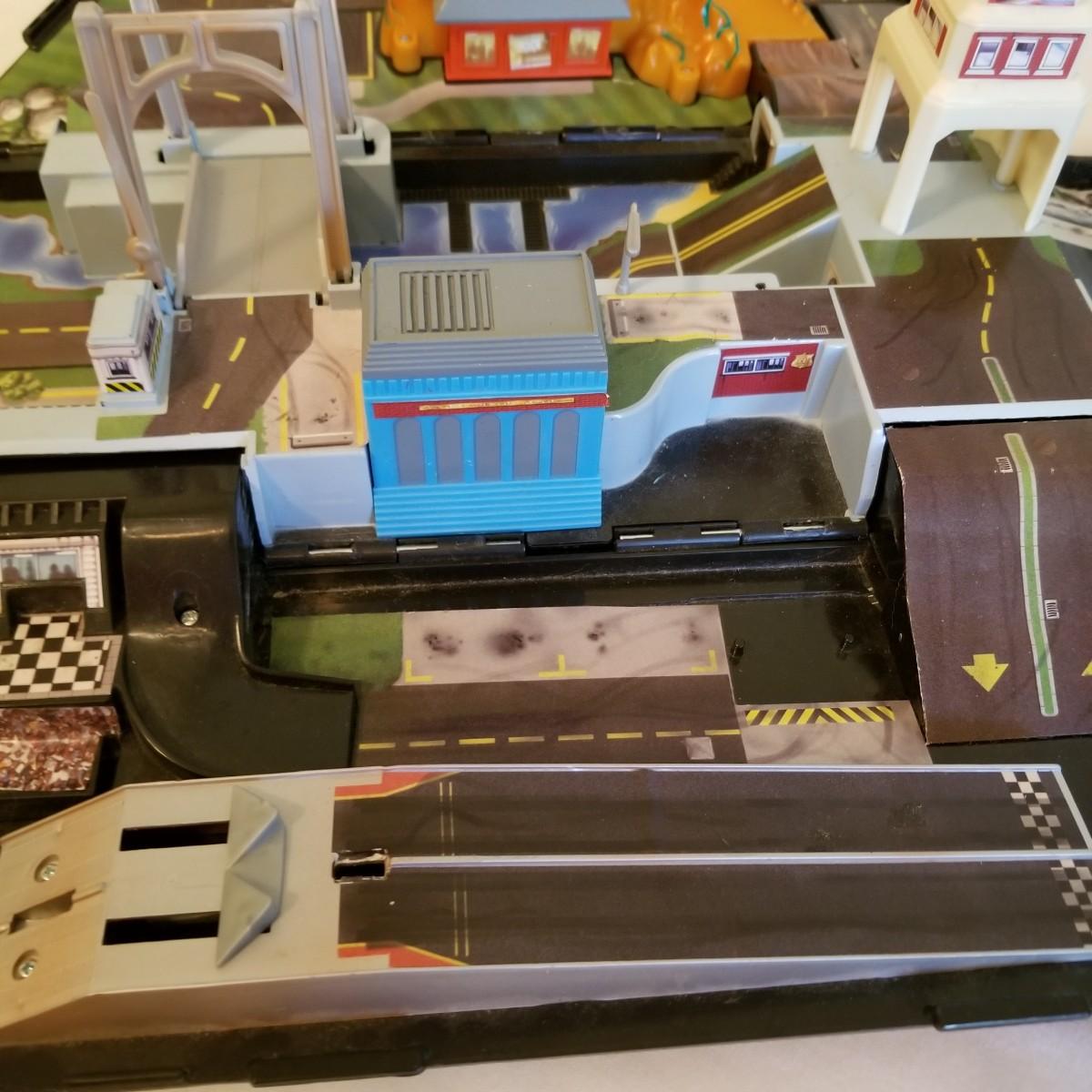 Two Micro Machines car playsets, Super Van City and Super Stunt City Semi Tanker. Both units from the 90's, open to reveal numerous opportunities to play with cars and trucks. Built in scenery, garages, ramps, roads, etc. Sixteen cars total for the two sets. Smaller unit measures 7"16"x7" closed, larger one is 6"x17"x7". Not certain if all original pieces are included. See photos for details. Shipping available.