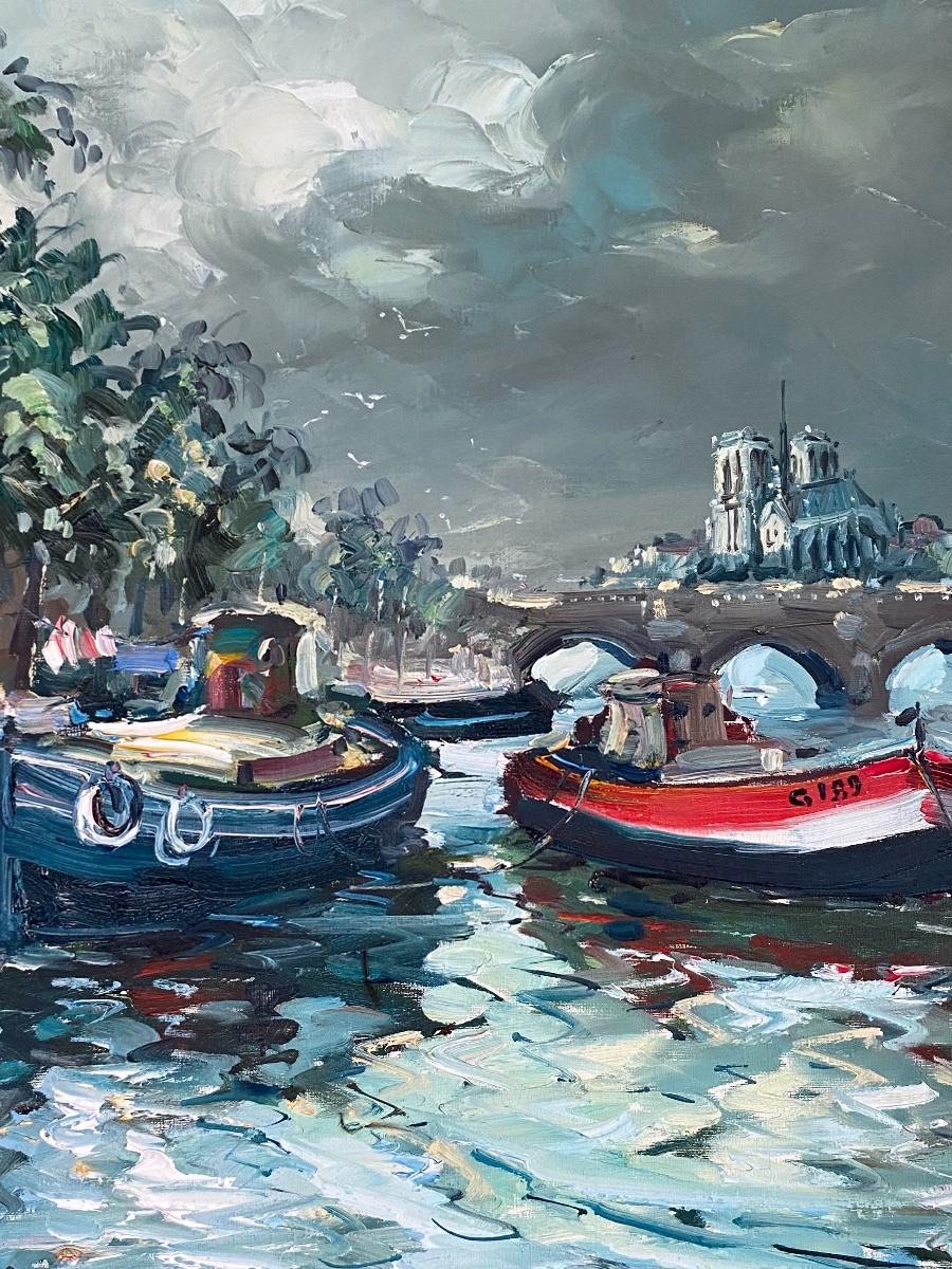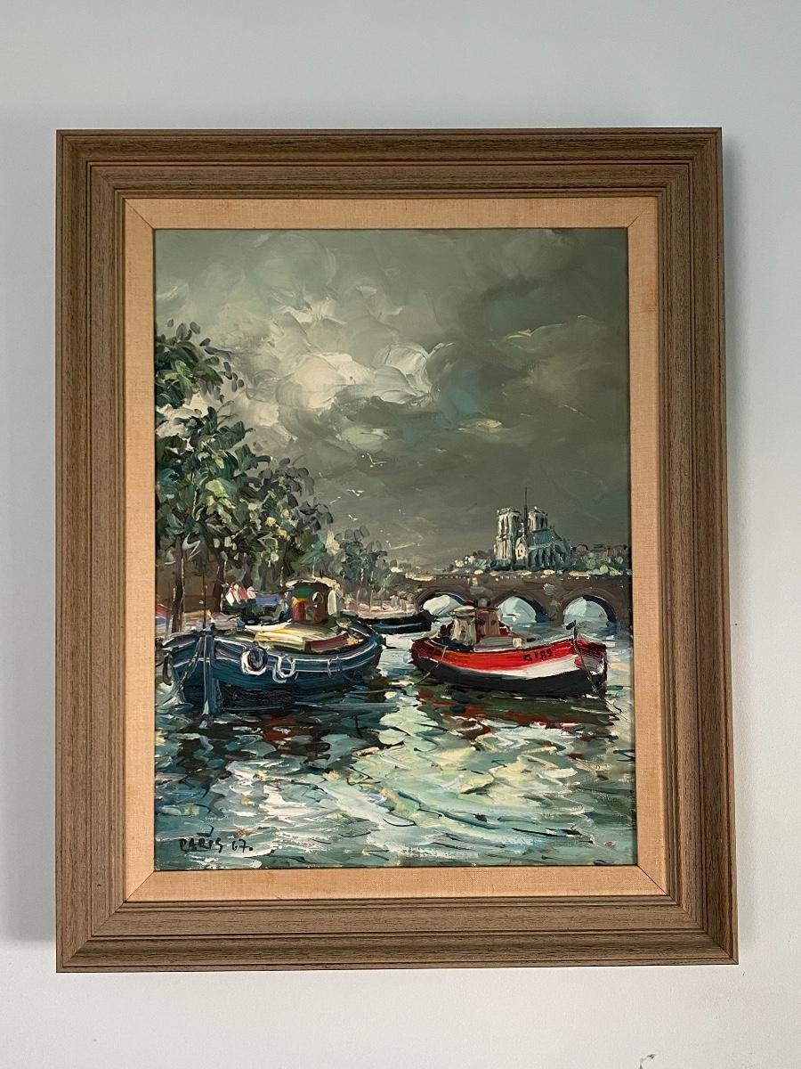 Vintage mid century impressionist oil painting. Signed Paris 67 in lower left corner. Features a pair of boats in the canal, Notre Dame in the background. Measures about 24"x30".