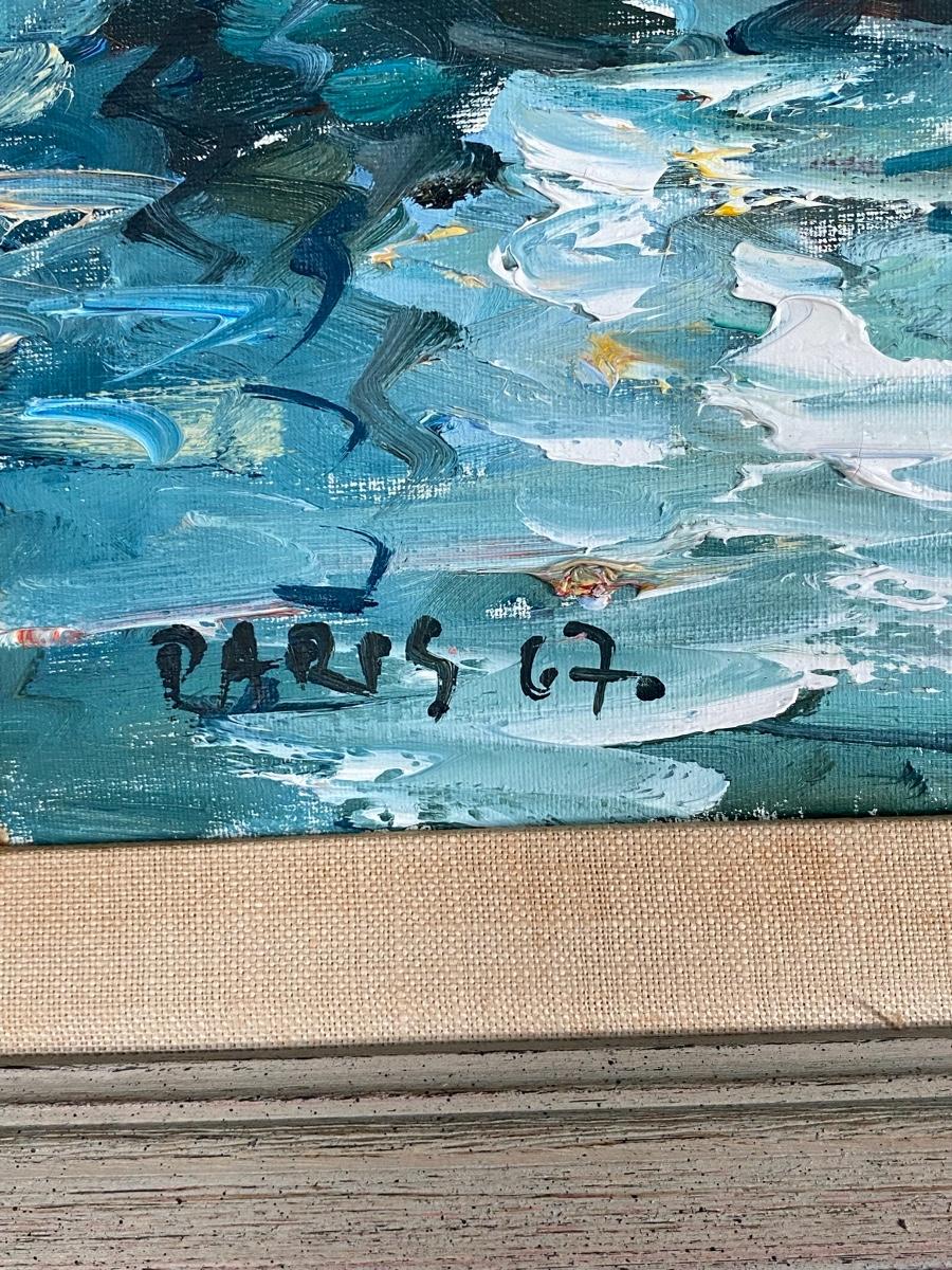 Vintage Mid Century Impressionist Framed Oil Painting Boats in Canal Paris Notre Dame Signed 1967