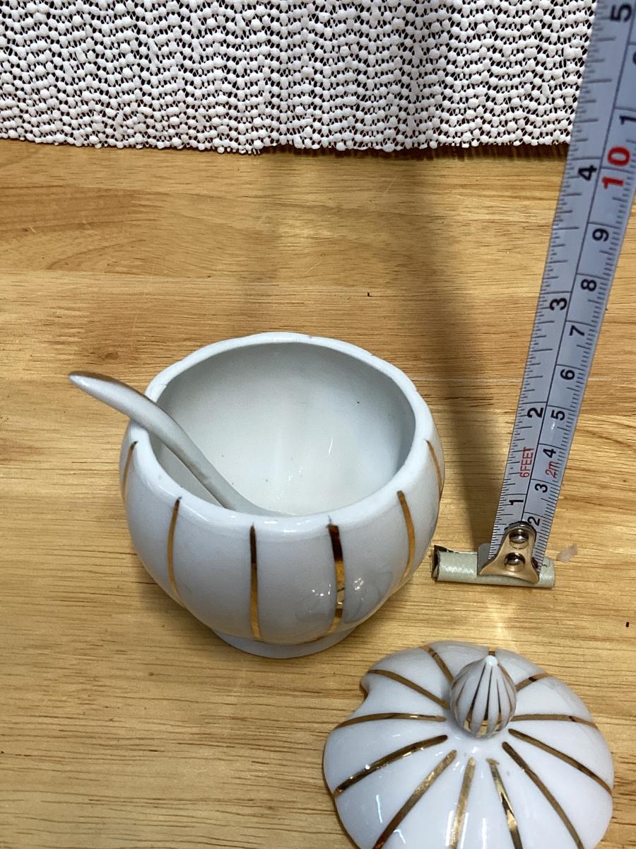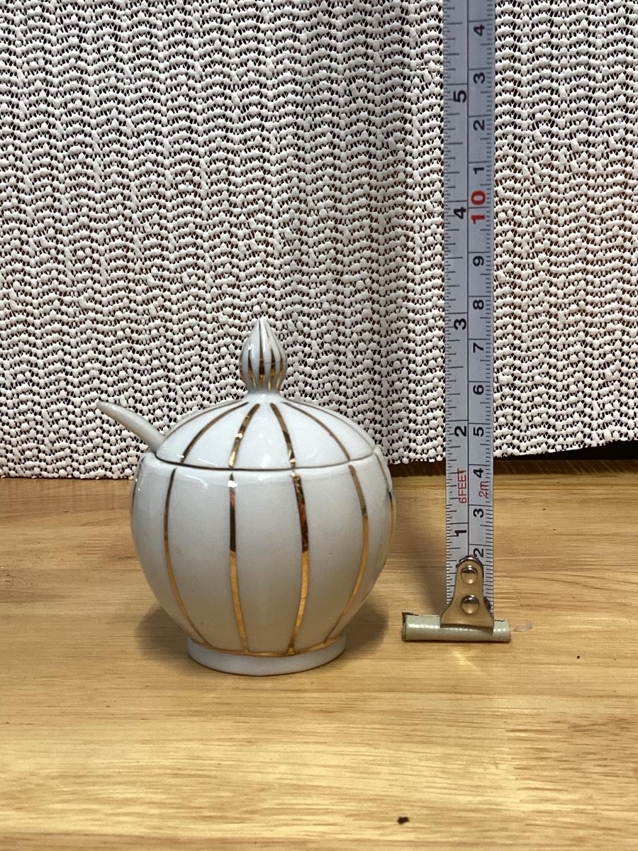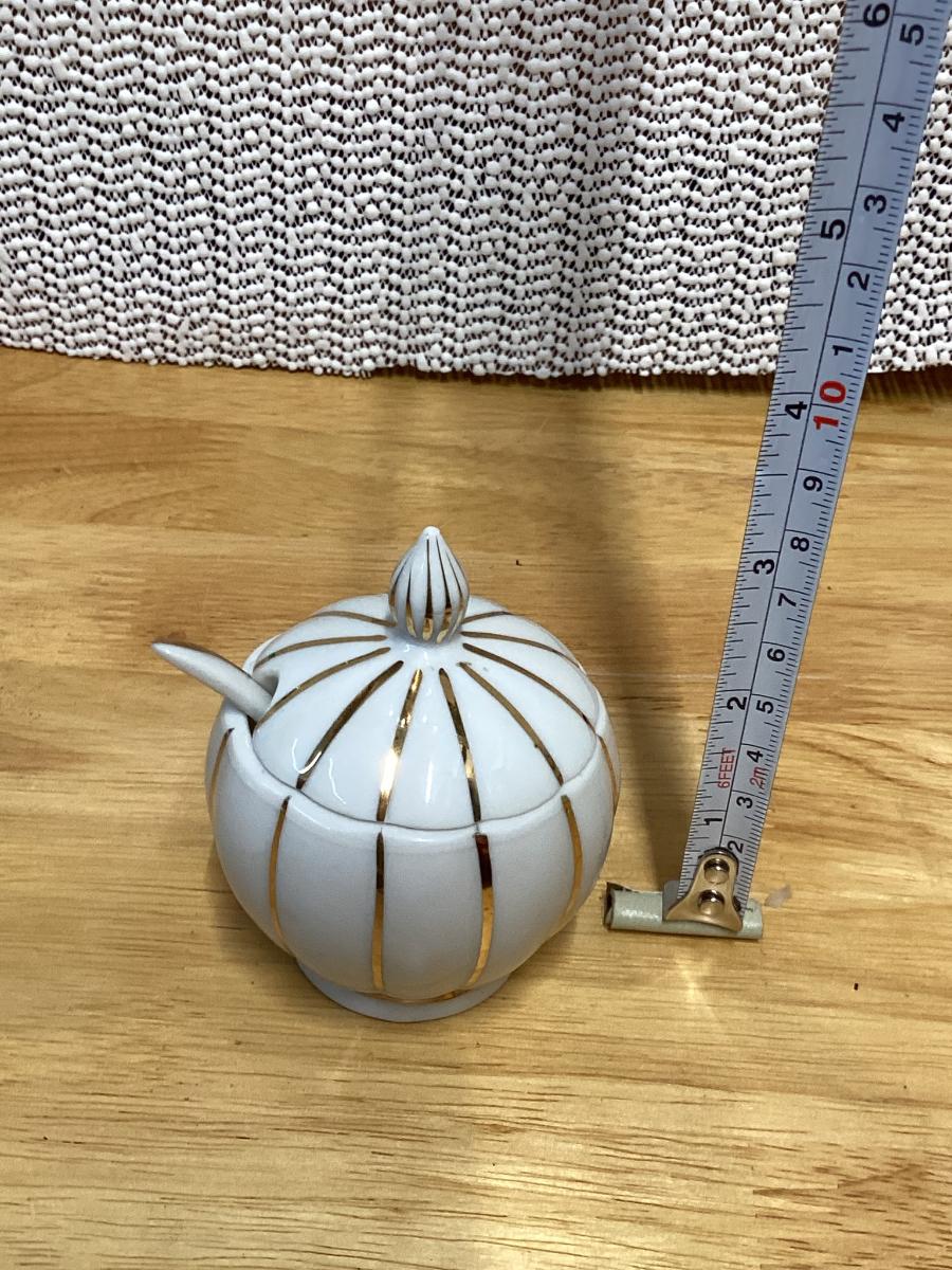 Vintage Mid Century Lidded Condiment Bowl Jar Product Small Porcelain sugar bowl with a spoon