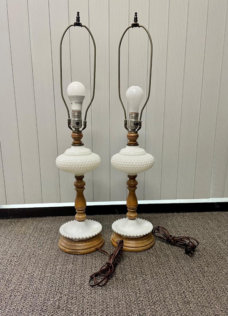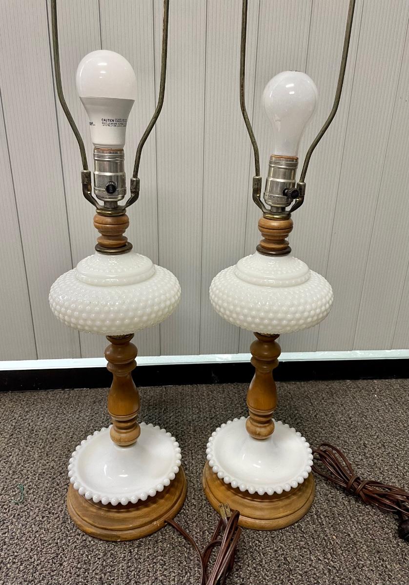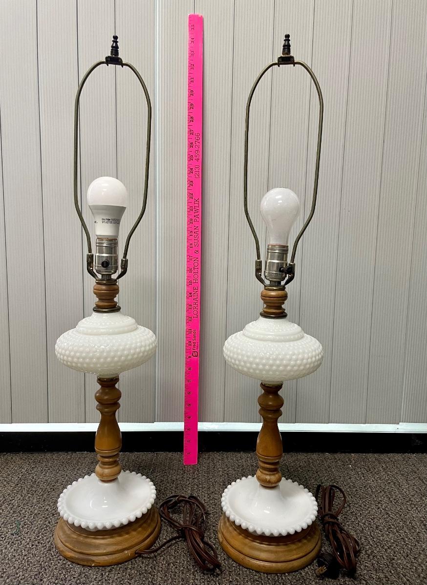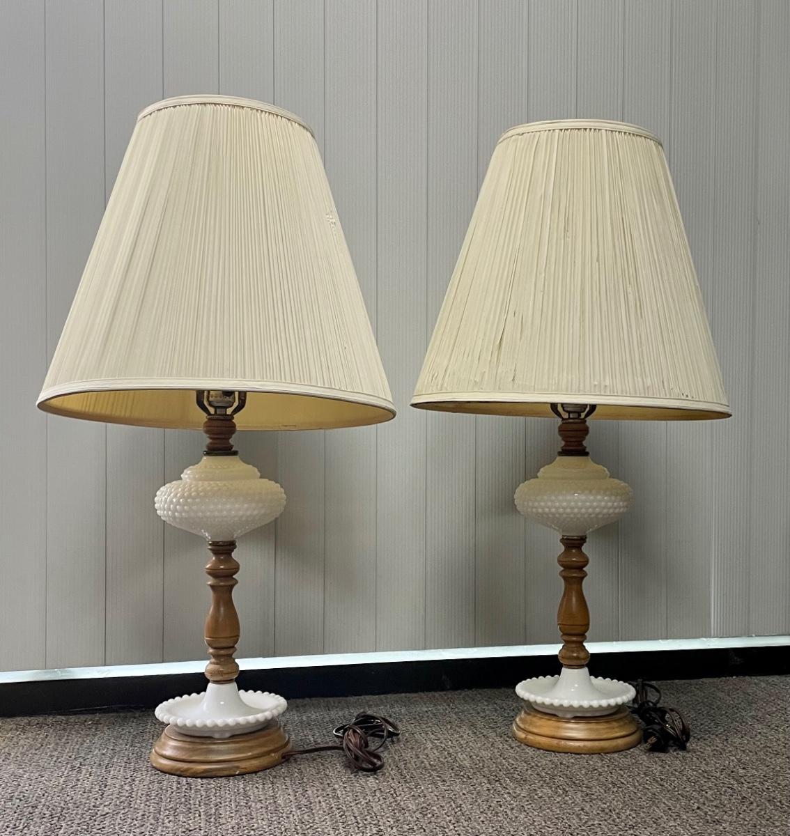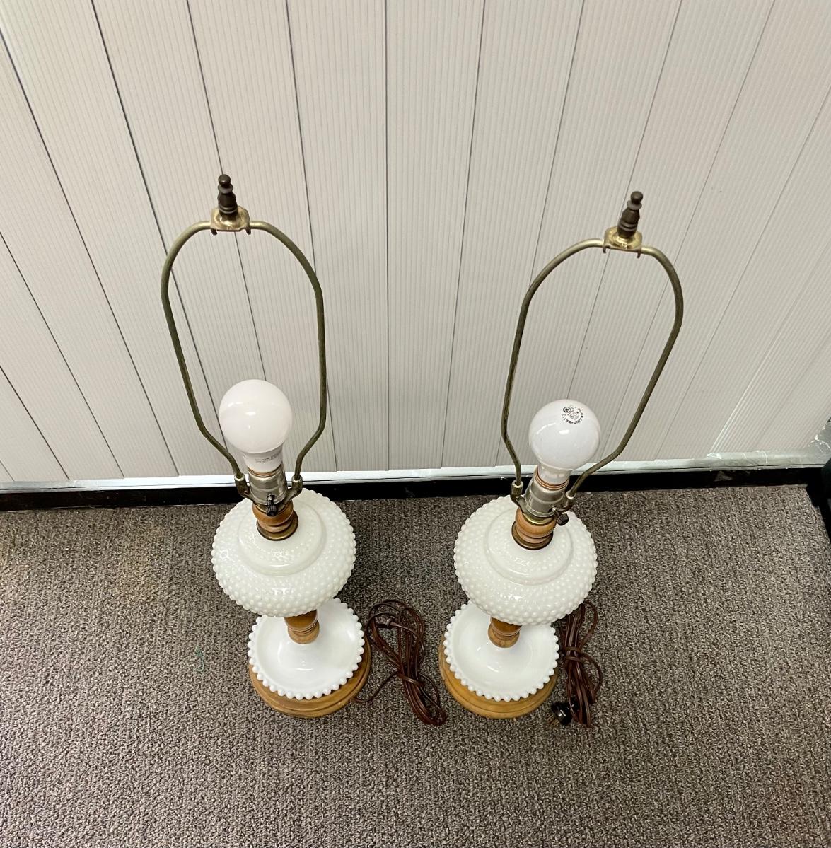 Pair of Vintage Mid Century Textured Hobnail Style Milk Glass Lamps