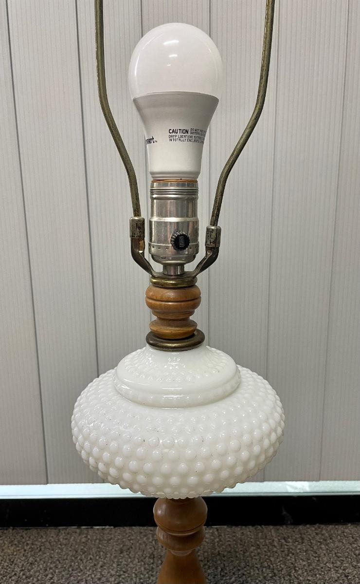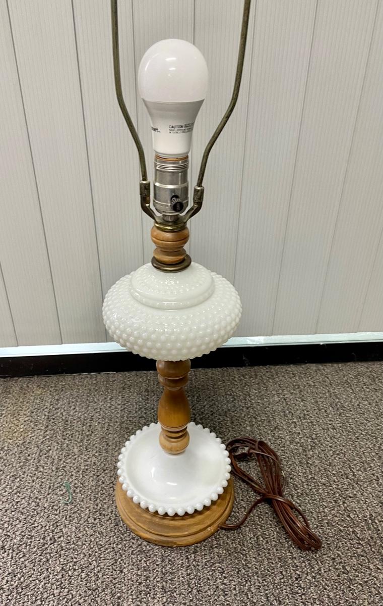 Main lamp base and body are made from wood. Has a hobnail-style milk glass scalloped tray at the base and a spinning-top style milk glass insert just below the bulb socket. Includes matching shades.