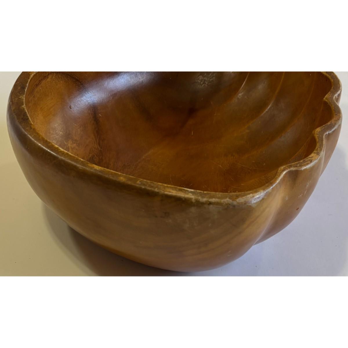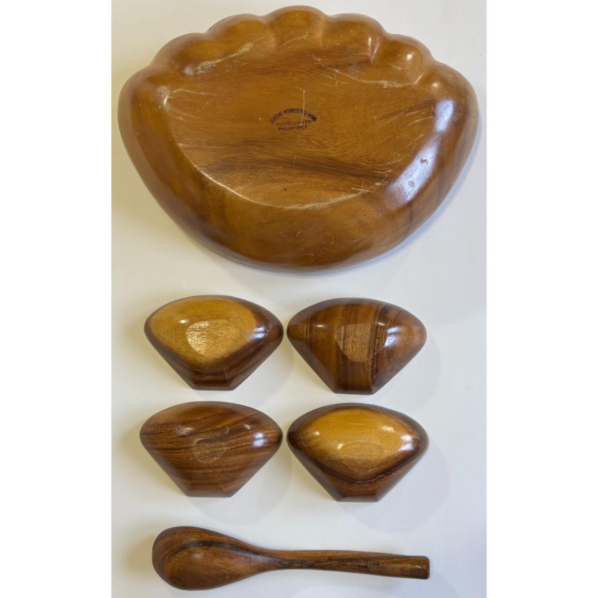 Vintage Mid Century Modern 6 Piece Monkey Pod Wooden Clamshell Bowl & Spoon Set