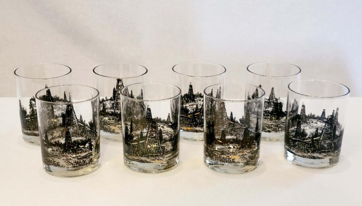 Vintage, Mid Century Modern, Set of 8, Black & Gold Oil Rig Derrick Glasses