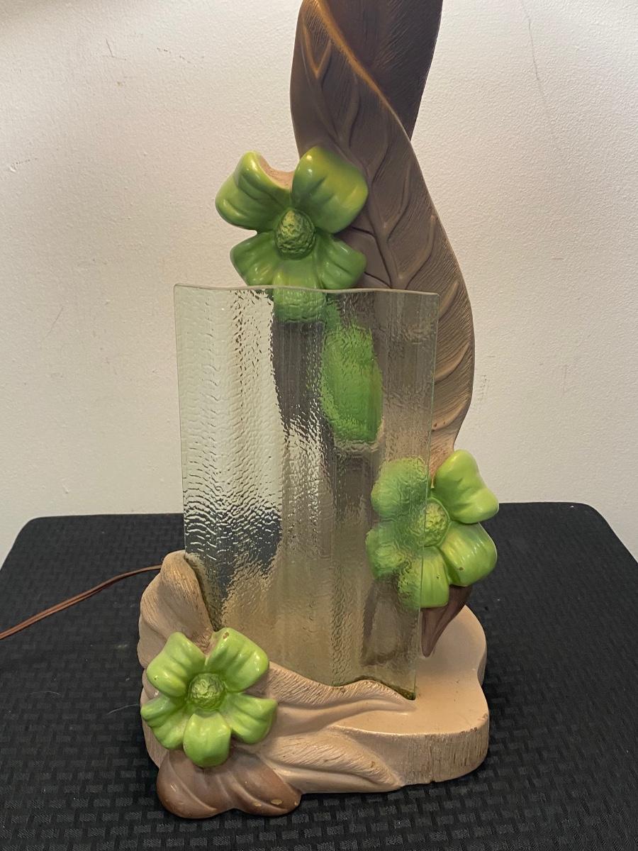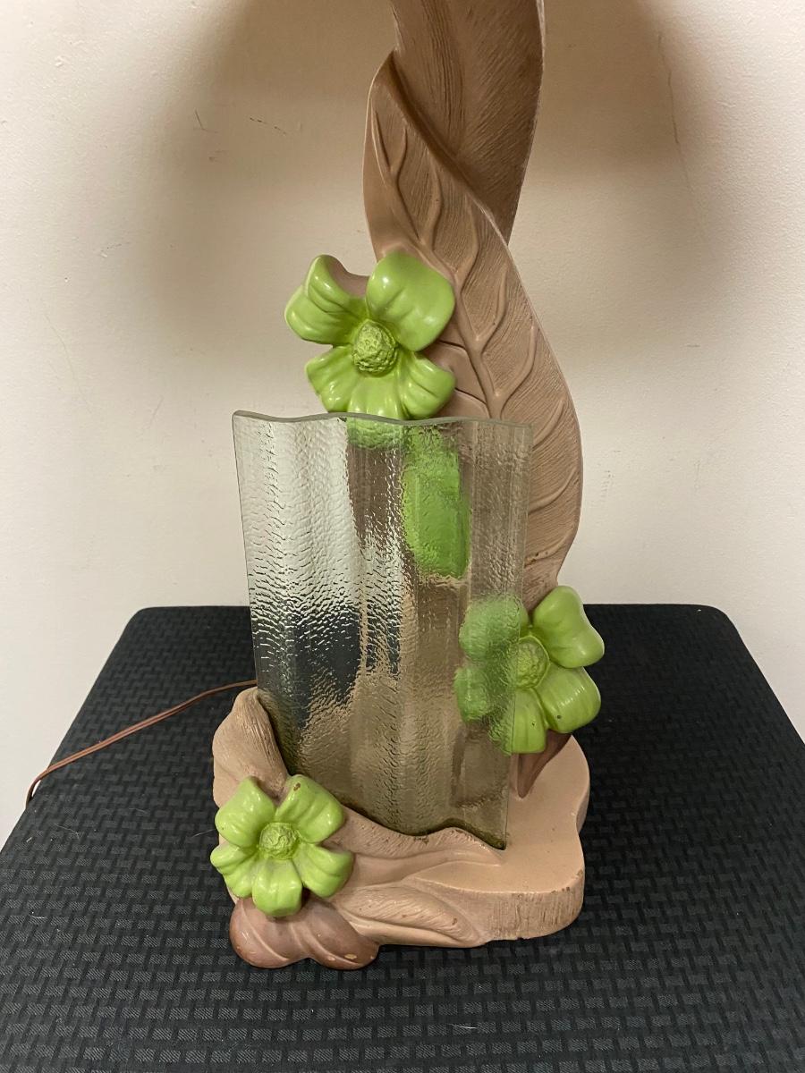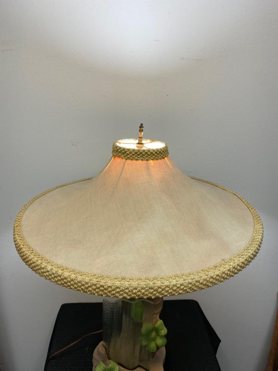 Vintage MCM chalkware table lamp from Reglor of California. Interesting mix of pottery and textured glass. Cool wide brim shade. Lamp works, has a three-way bulb in it right now. Shade has some discolor, from age and dust, on the outside. There are some tears to the fabric lining the inside of shade but none on the outside. Minor paint chipping but no major noticeable damage. About 34" total height. Signed on the back at the bottom.