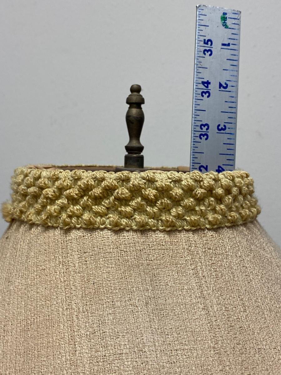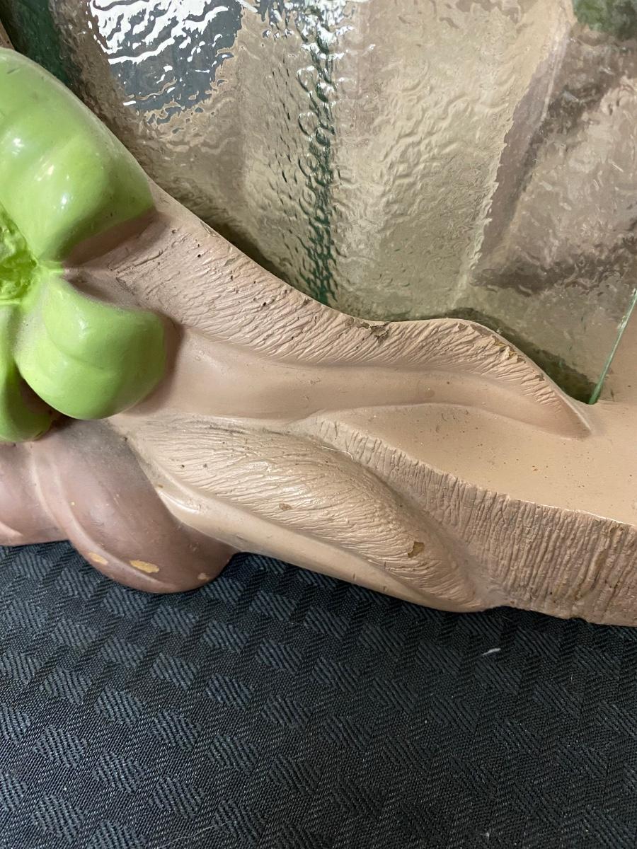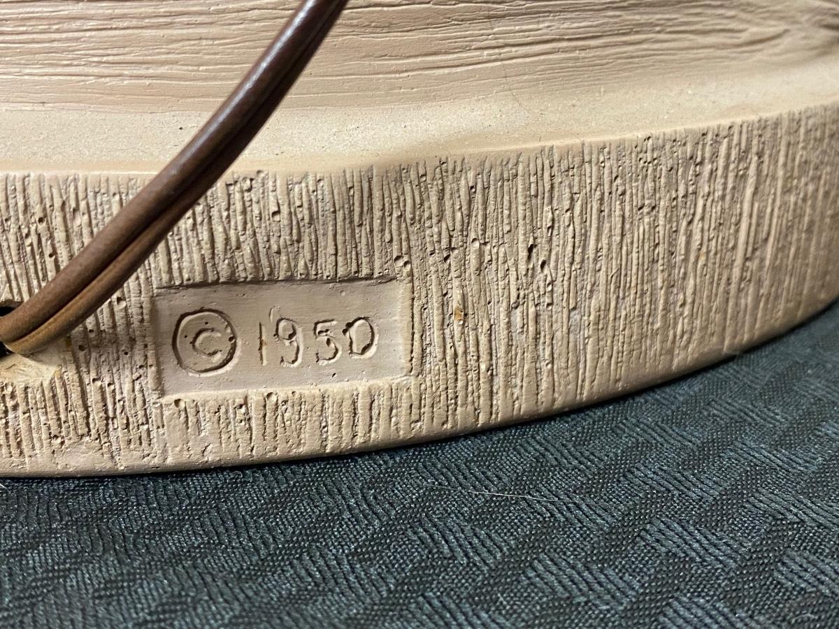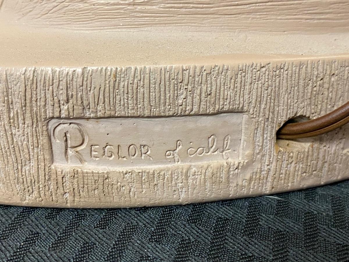 Vintage MCM chalkware table lamp from Reglor of California. Interesting mix of pottery and textured glass. Cool wide brim shade. Lamp works, has a three-way bulb in it right now. Shade has some discolor, from age and dust, on the outside. There are some tears to the fabric lining the inside of shade but none on the outside. Minor paint chipping but no major noticeable damage. About 34" total height. Signed on the back at the bottom.