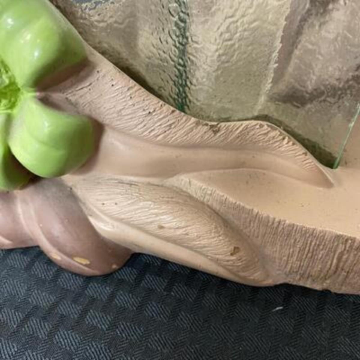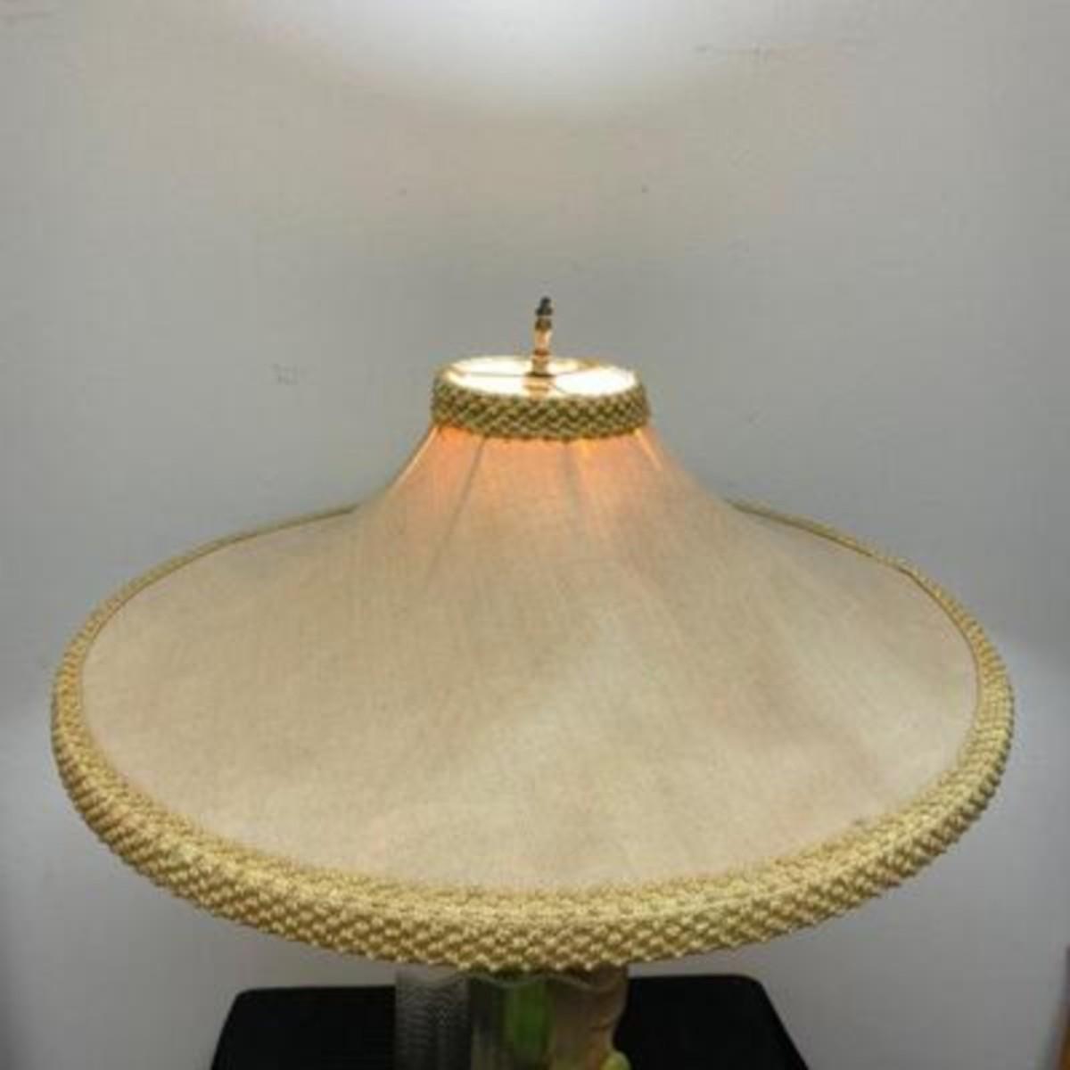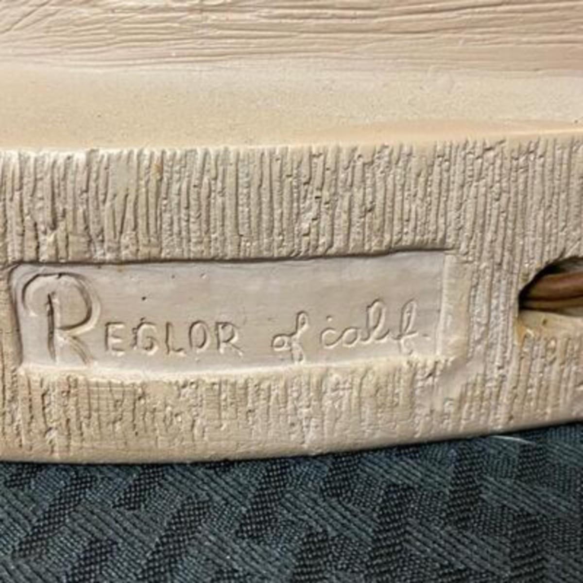 Vintage MCM chalkware table lamp from Reglor of California. Interesting mix of pottery and textured glass. Cool wide brim shade. Lamp works, has a three-way bulb in it right now. Shade has some discolor, from age and dust, on the outside. There are some tears to the fabric lining the inside of shade but none on the outside. Minor paint chipping but no major noticeable damage. About 34" total height. Signed on the back at the bottom.