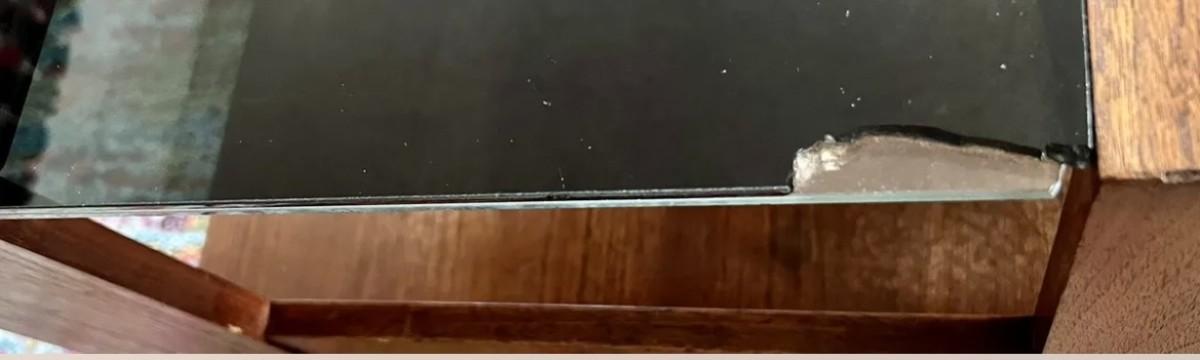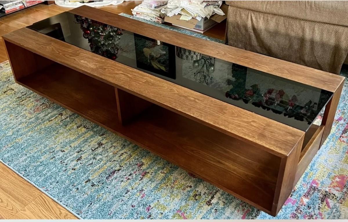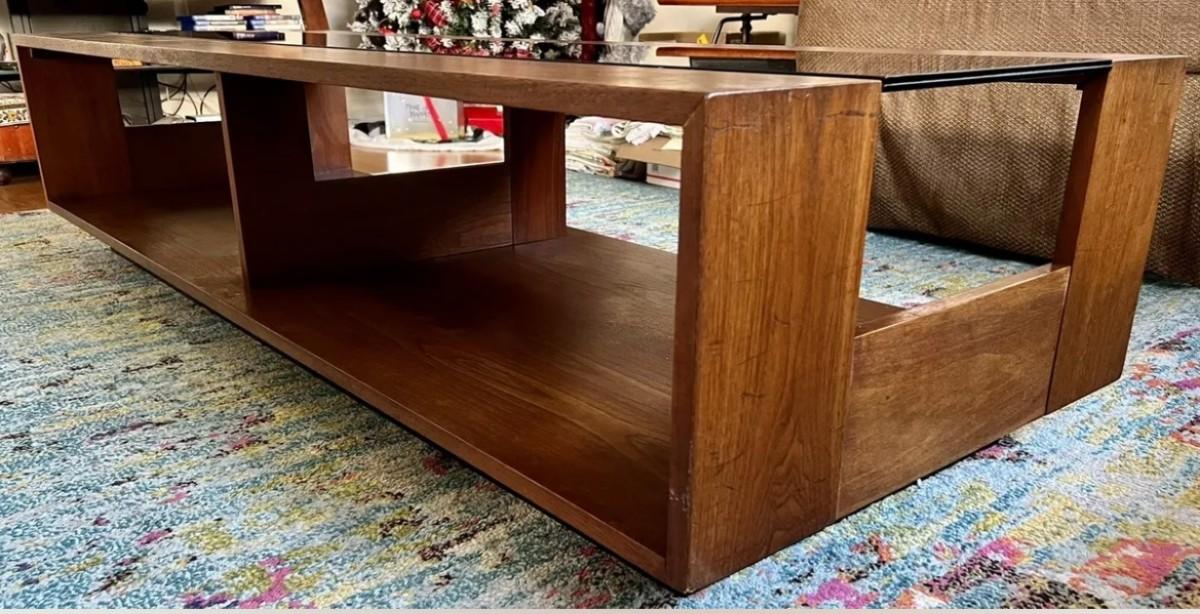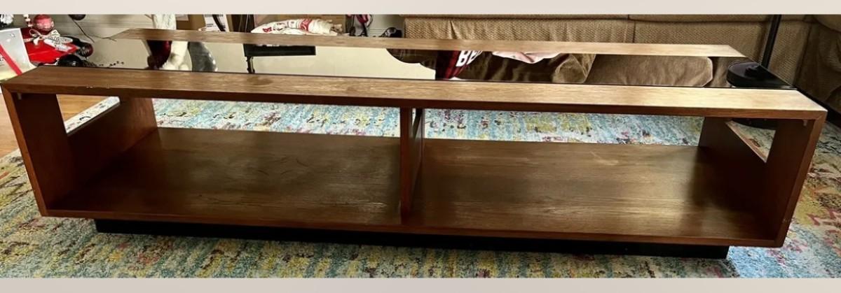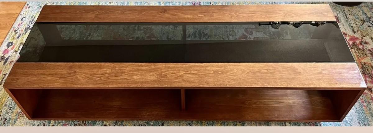 Made in the 1960's with lower shelf and middle glass insert. Dark layer of glass is broken off in one of the corners (pictured).