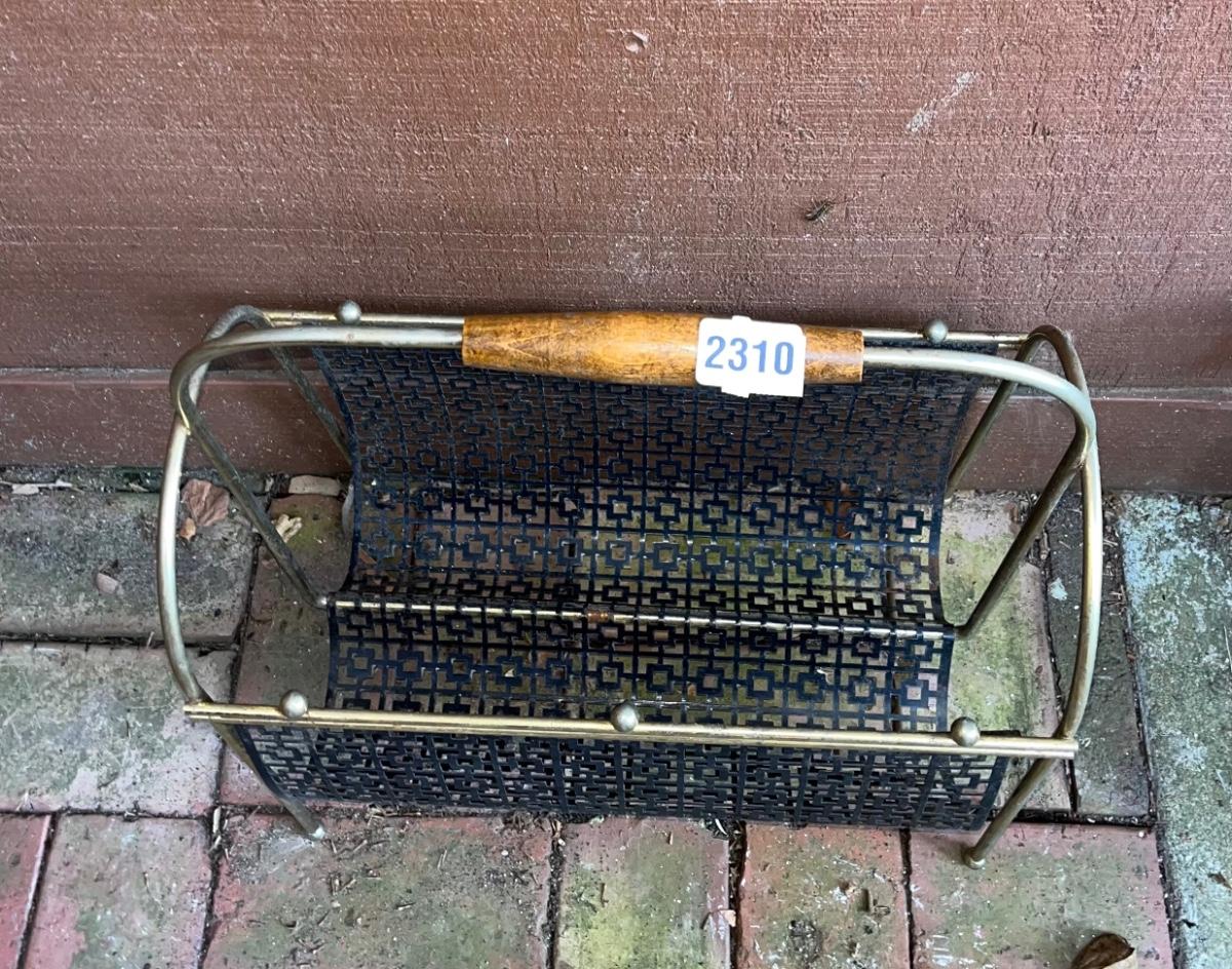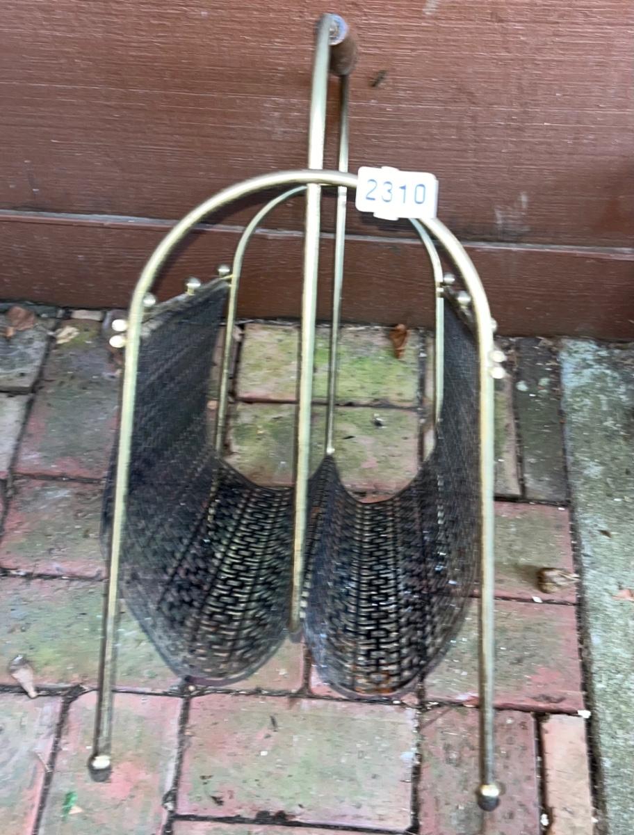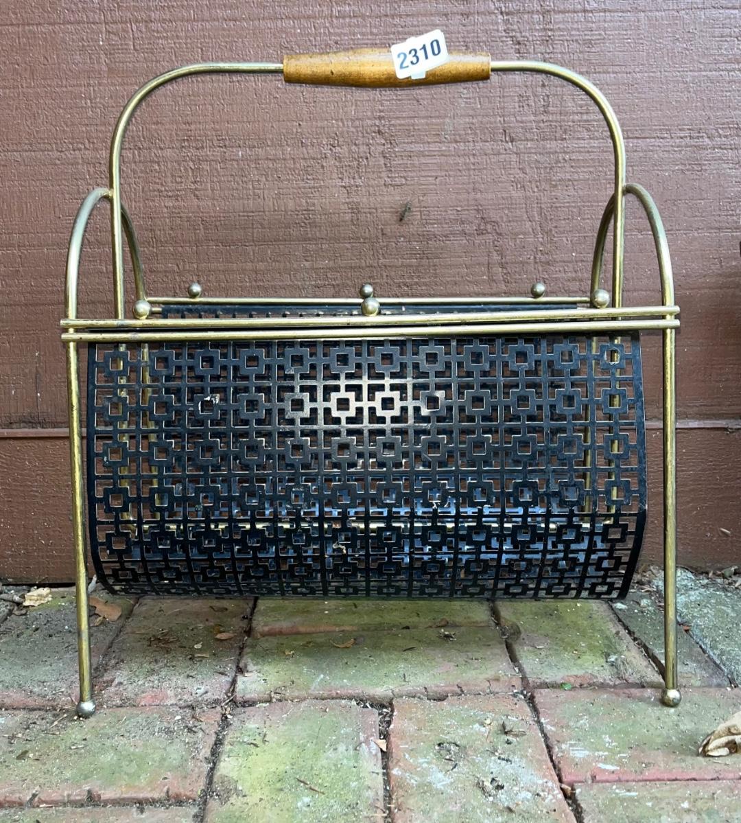 Vintage mid century modern atomic mesh metal magazine rack holder gold/wood handle