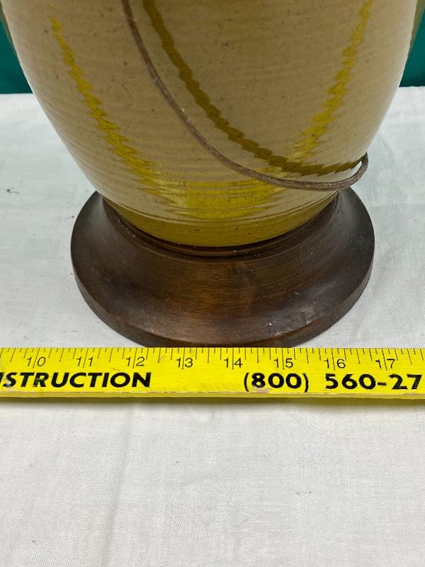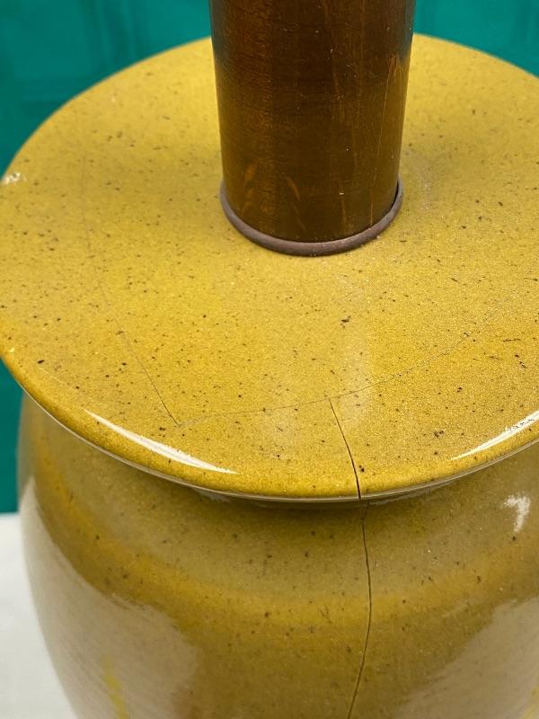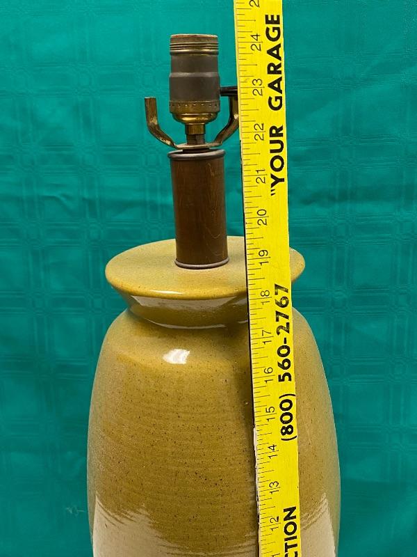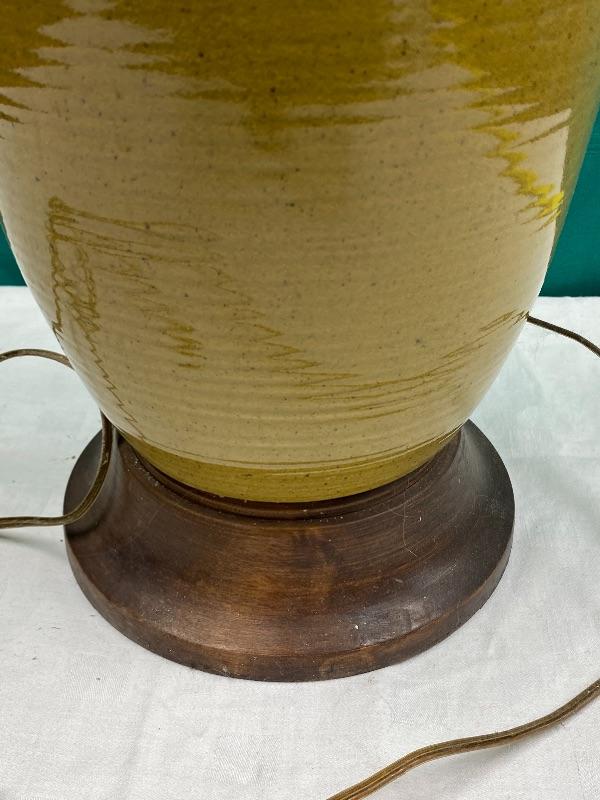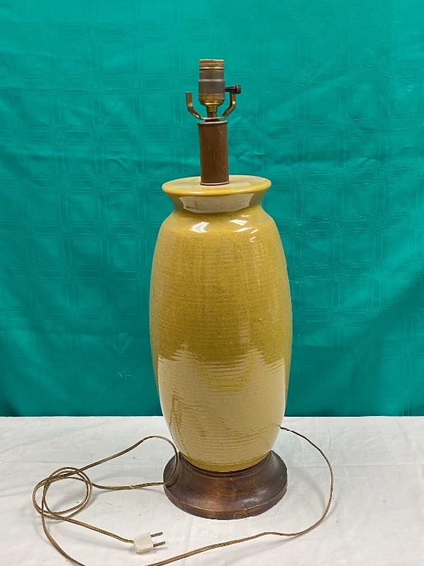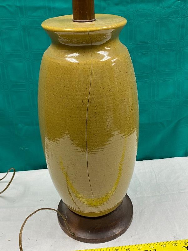 Vintage Mid Century mustard yellow speckled pottery lamp. Wood base and light stem. Stands about 24" at top of light socket. Unfortunately there is a crack down the back side of the lamp (photo). If you stuck this lamp in a corner, you would not see the crack.
