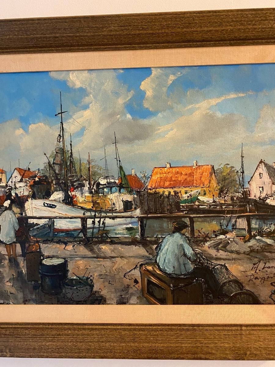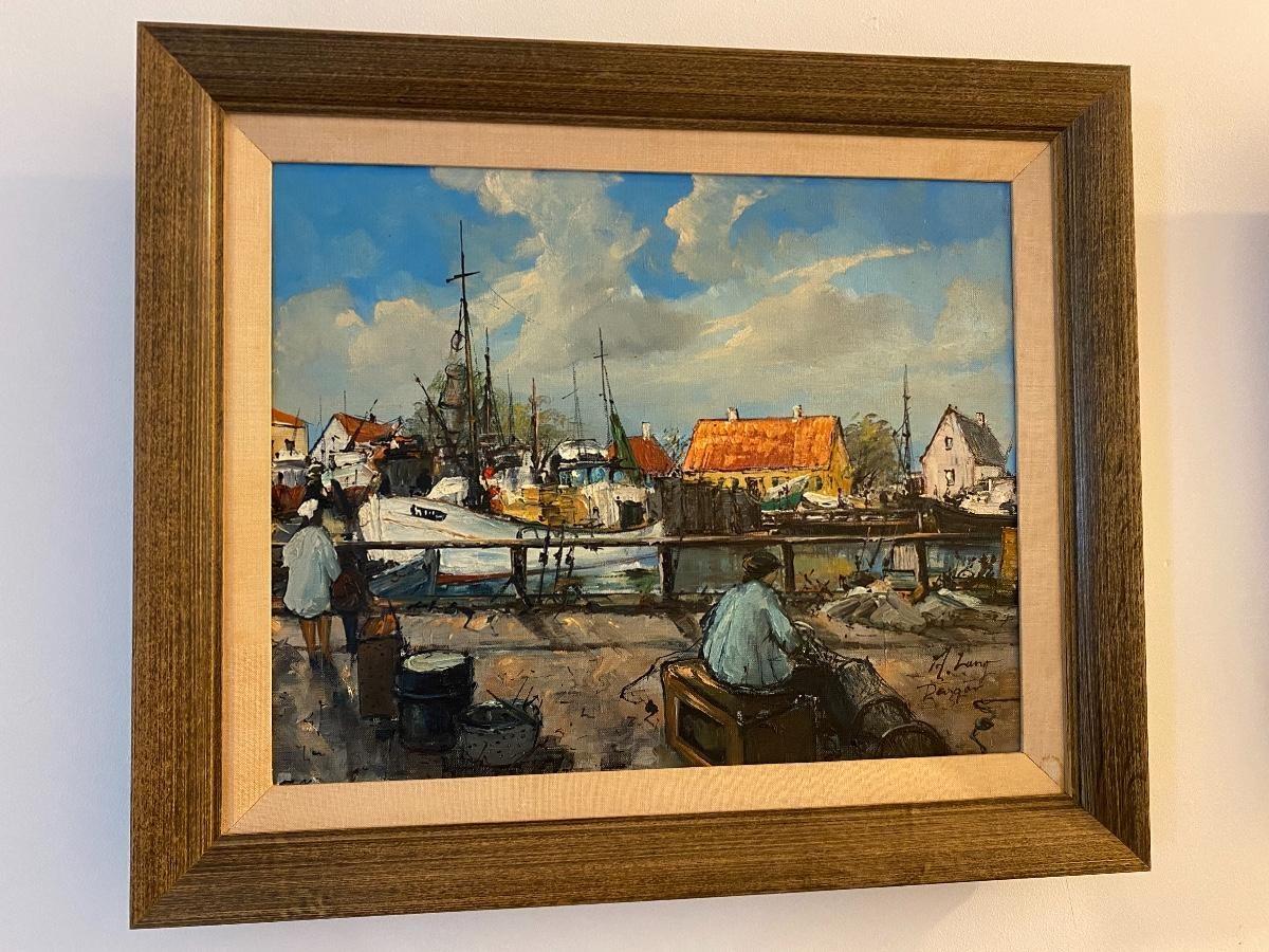 Vintage mid century nautical seaside fishing village oil painting. Colorful, nicely done. Signed in the lower right corner. Measures roughly 25"x21" outside of frame.