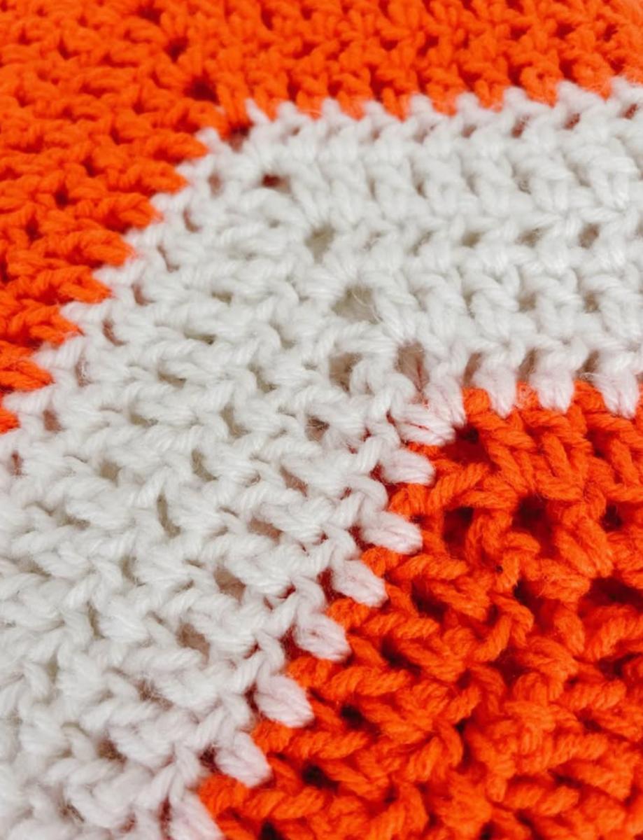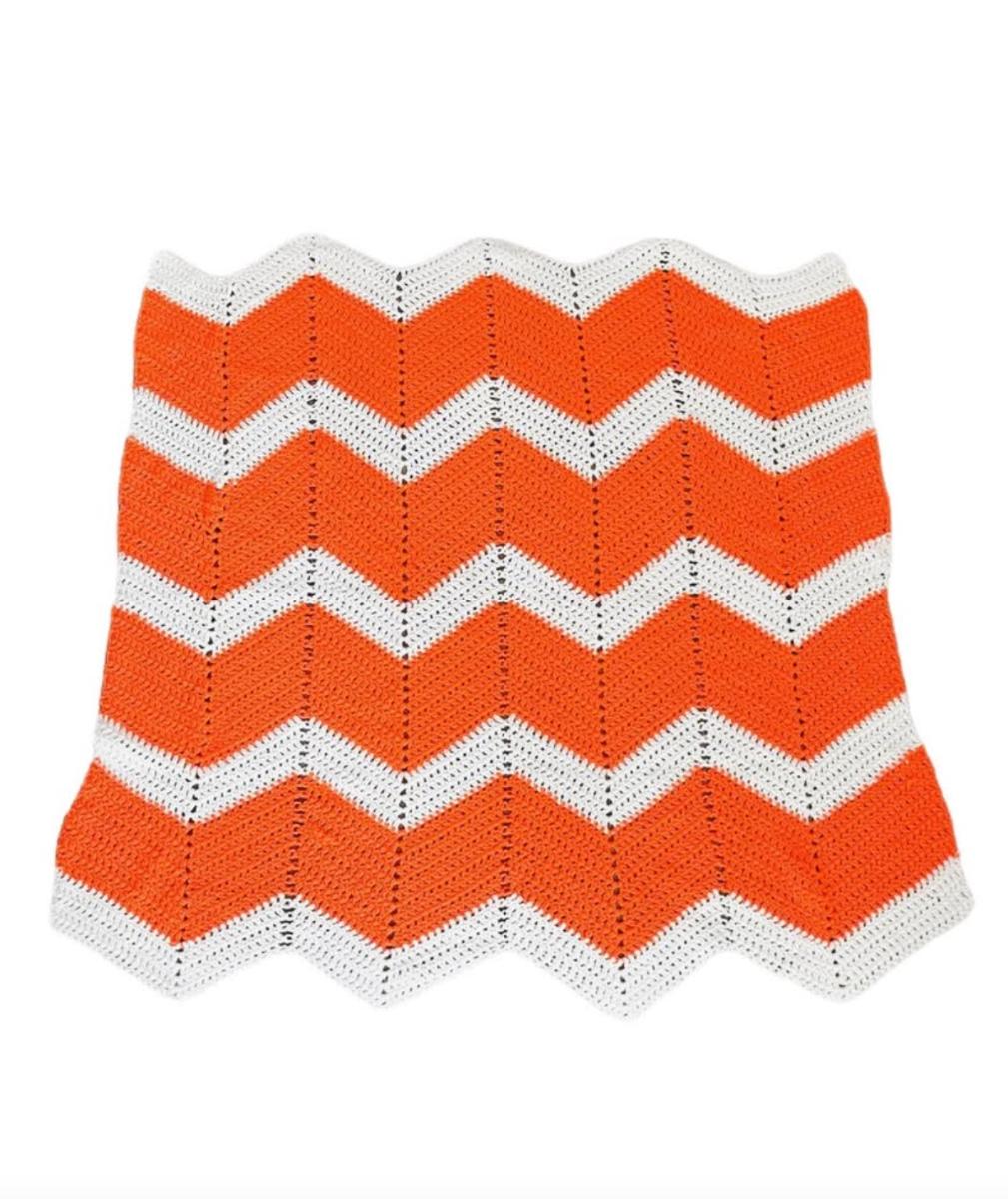 Vintage Mid Century Neon Orange & White Chevron Stripe Hand Crochet Knitted Throw Blanket