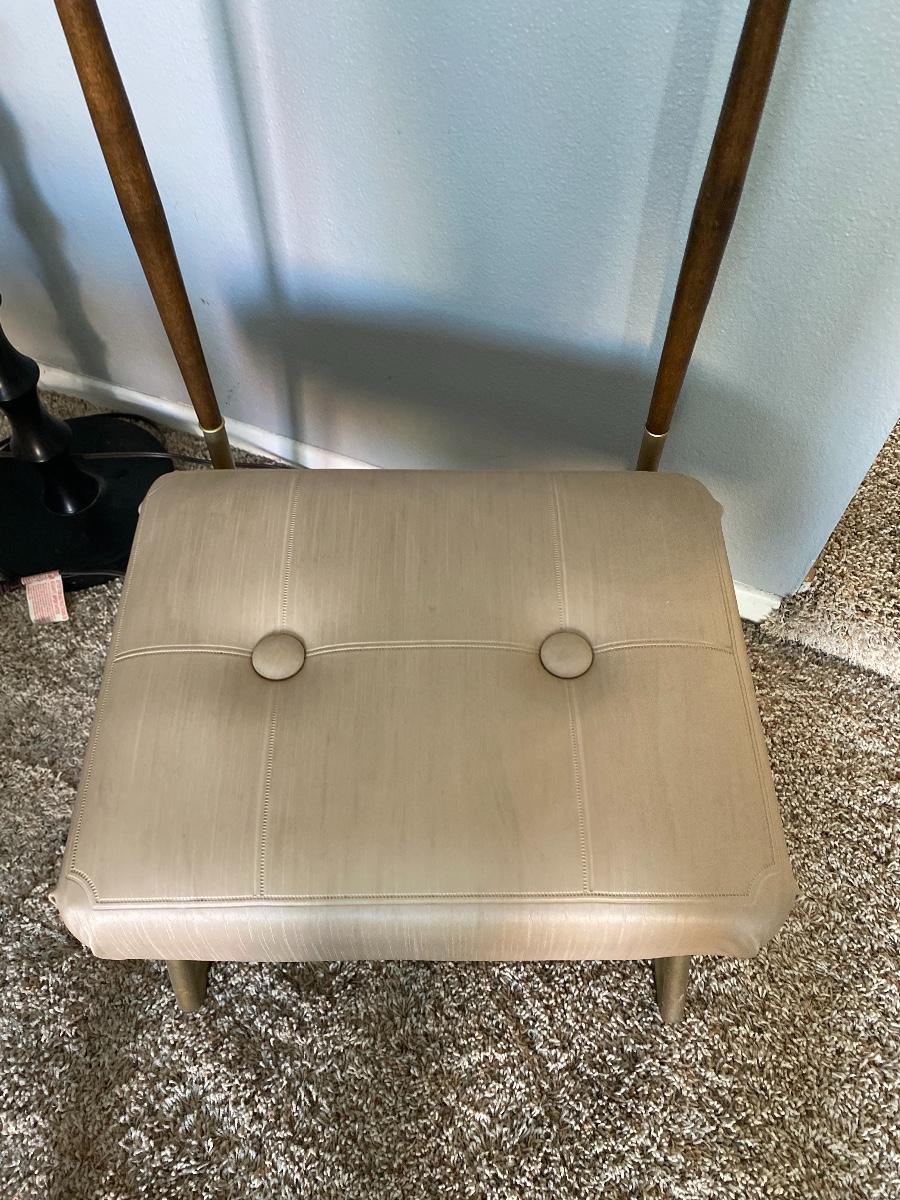Vintage mid century Pearl Wick dressing room valet chair. In excellent vintage condition. Measures roughly 47”x20”x20”. Brushed brass tone metal finish, Wood spacer poles and wood tray. Light ivory beige seat. All original, even the company logo under the tray is in good condition.