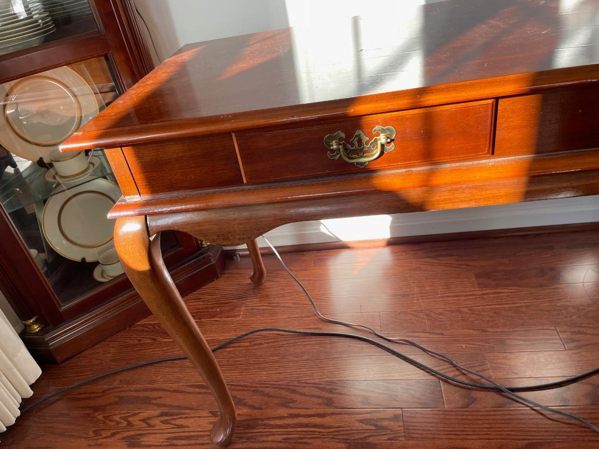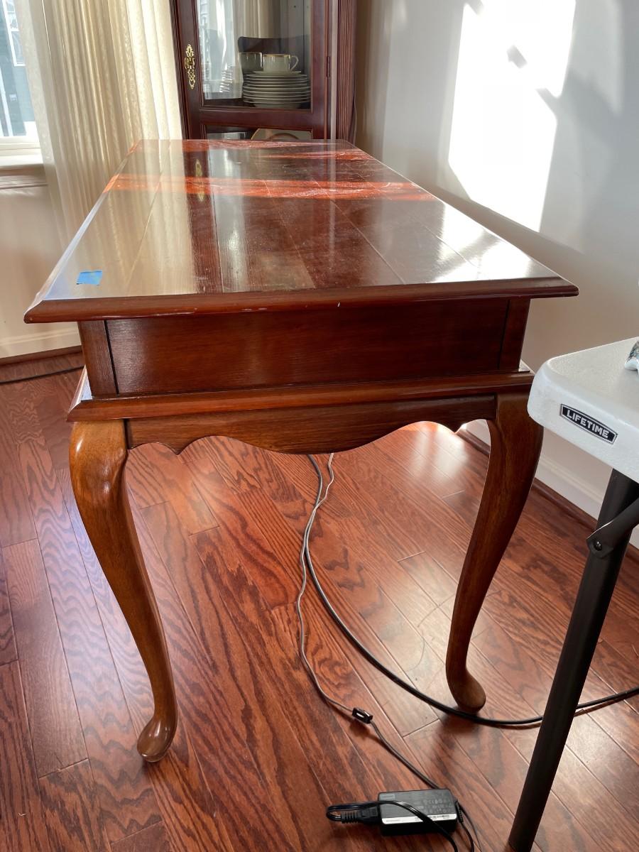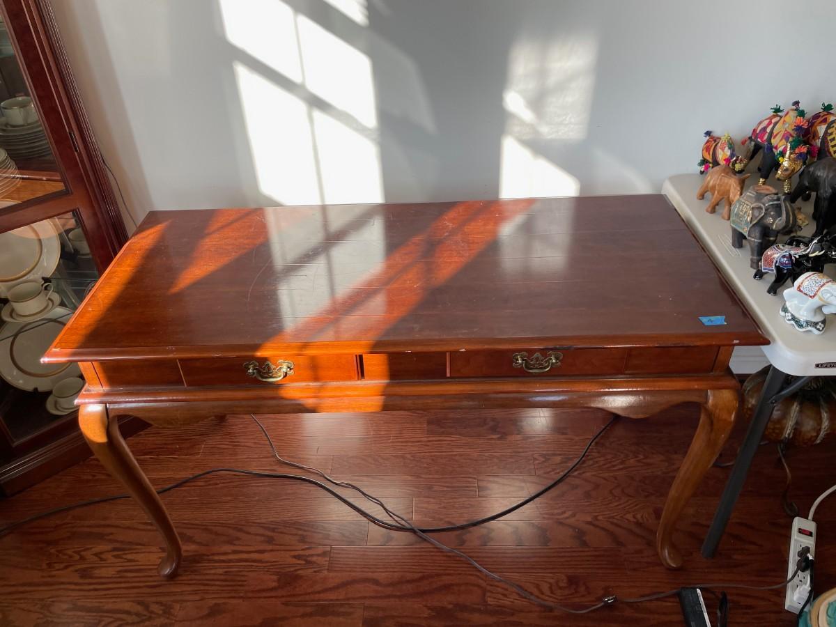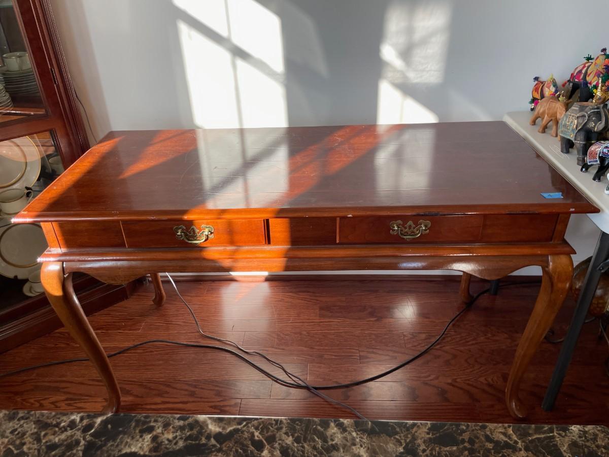 Desk has 2 drawers with metal handles. Slight wearing in the from edges aside from that it is in great condition. Desk measures 52"L x 23"D x 30"H. Drawers measure 12" x 13" from the inside.
