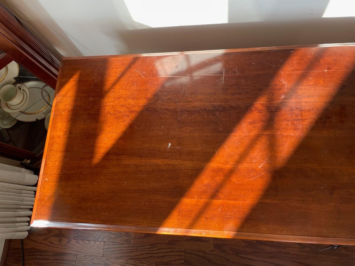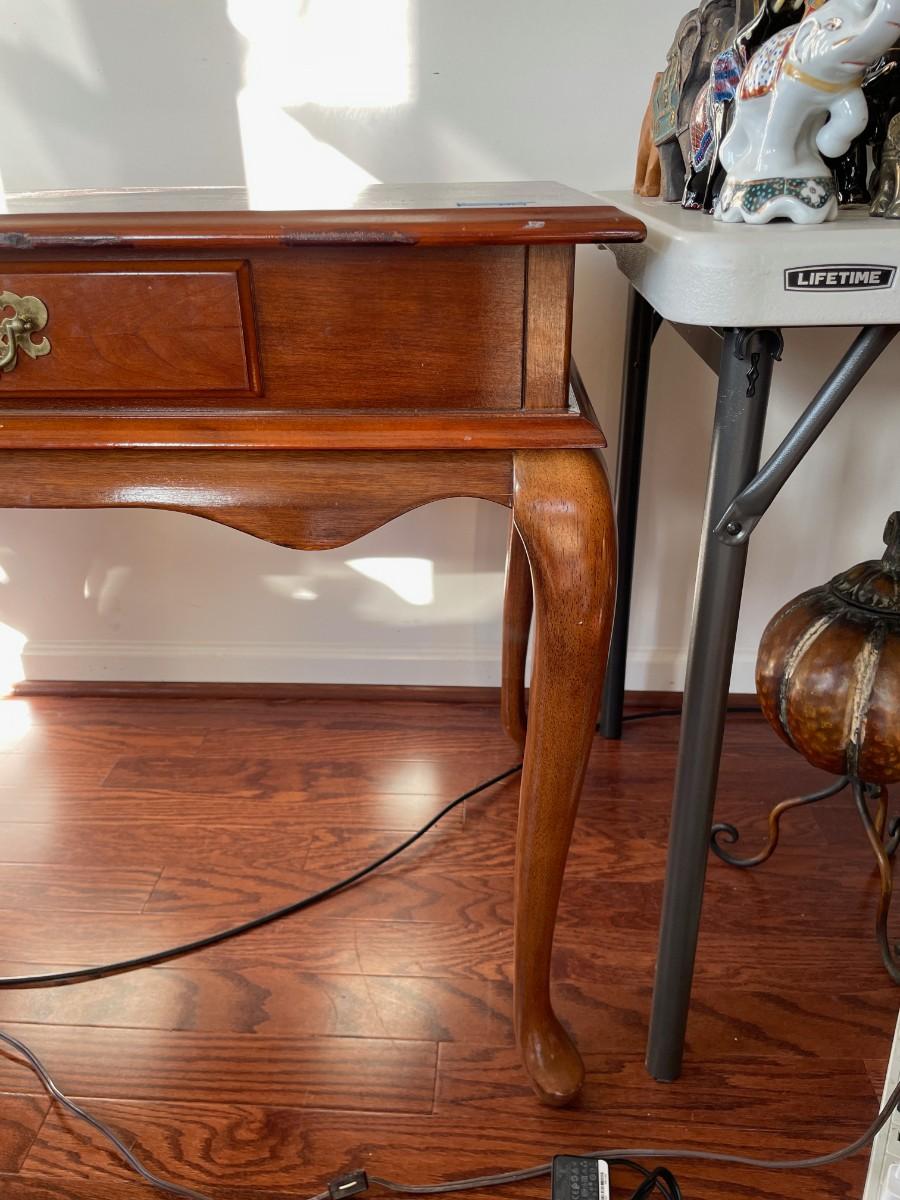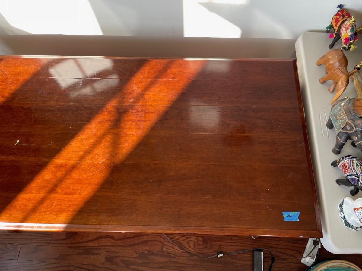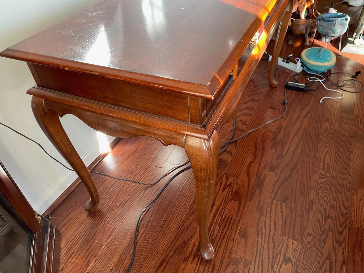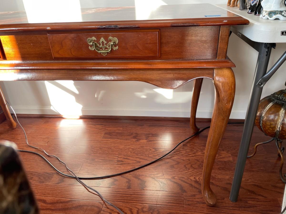 Desk has 2 drawers with metal handles. Slight wearing in the from edges aside from that it is in great condition. Desk measures 52"L x 23"D x 30"H. Drawers measure 12" x 13" from the inside.