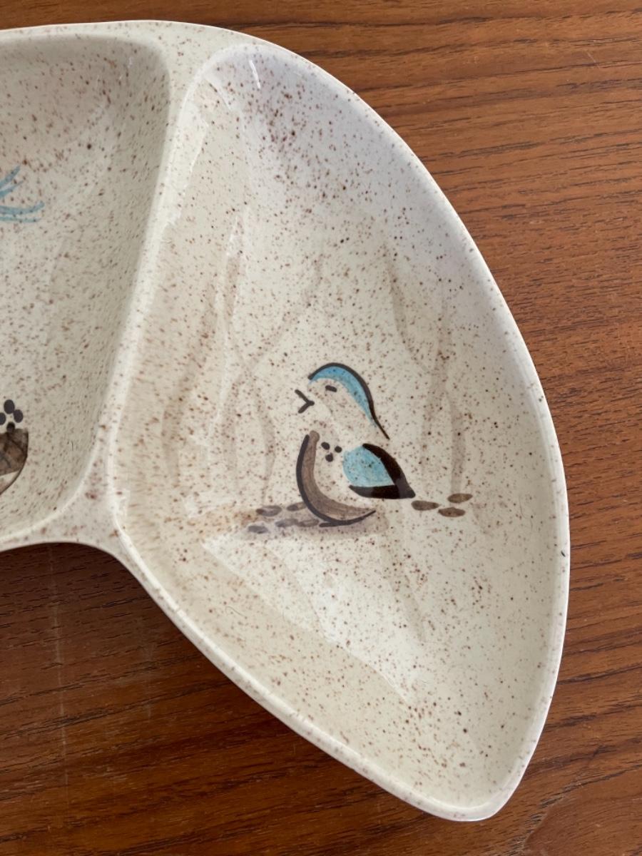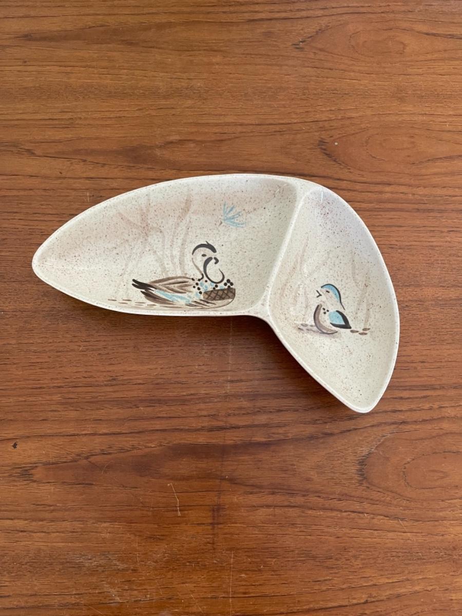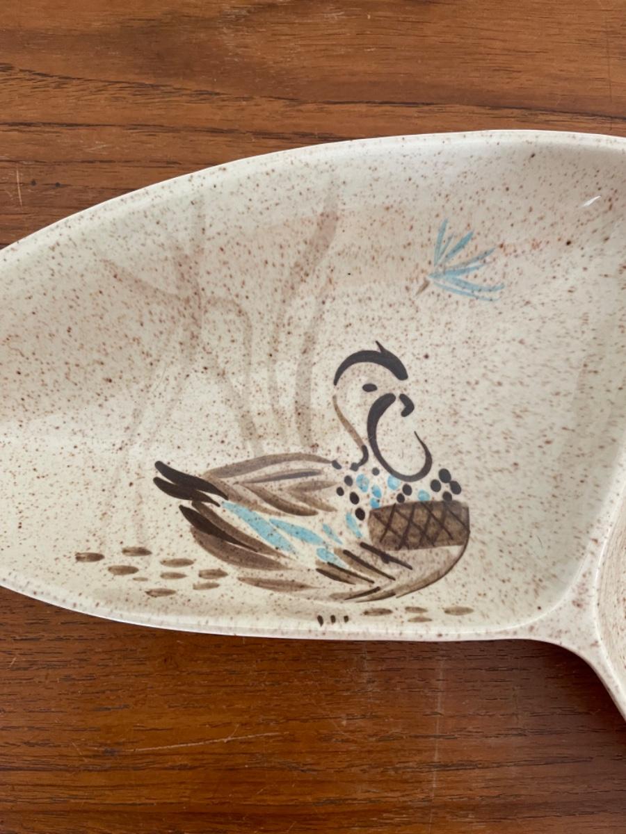 Red Wing Pottery Bob White divided serving dish with hand painted quail. Excellent condition. 14” across. Shipping available.