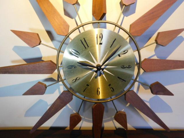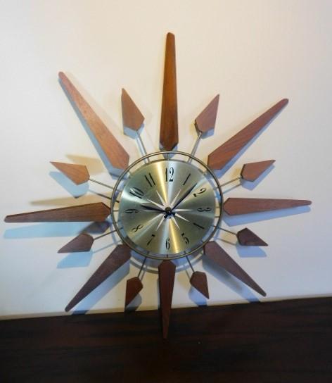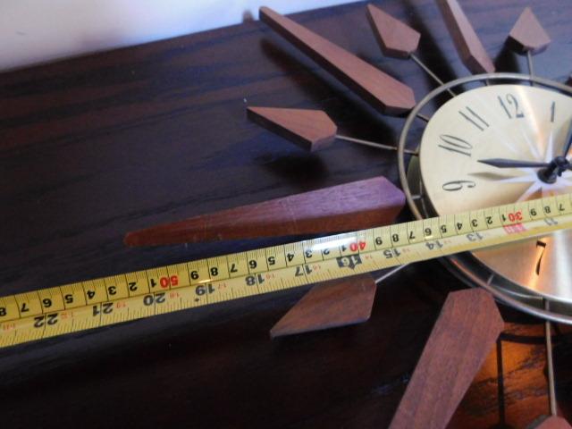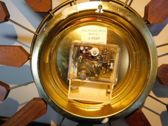 Vintage Mid Century Sears and Roebuck Oak Wood Sun Burst and Brass Face Clock 21" not tested. Appears to be in good condition otherwise