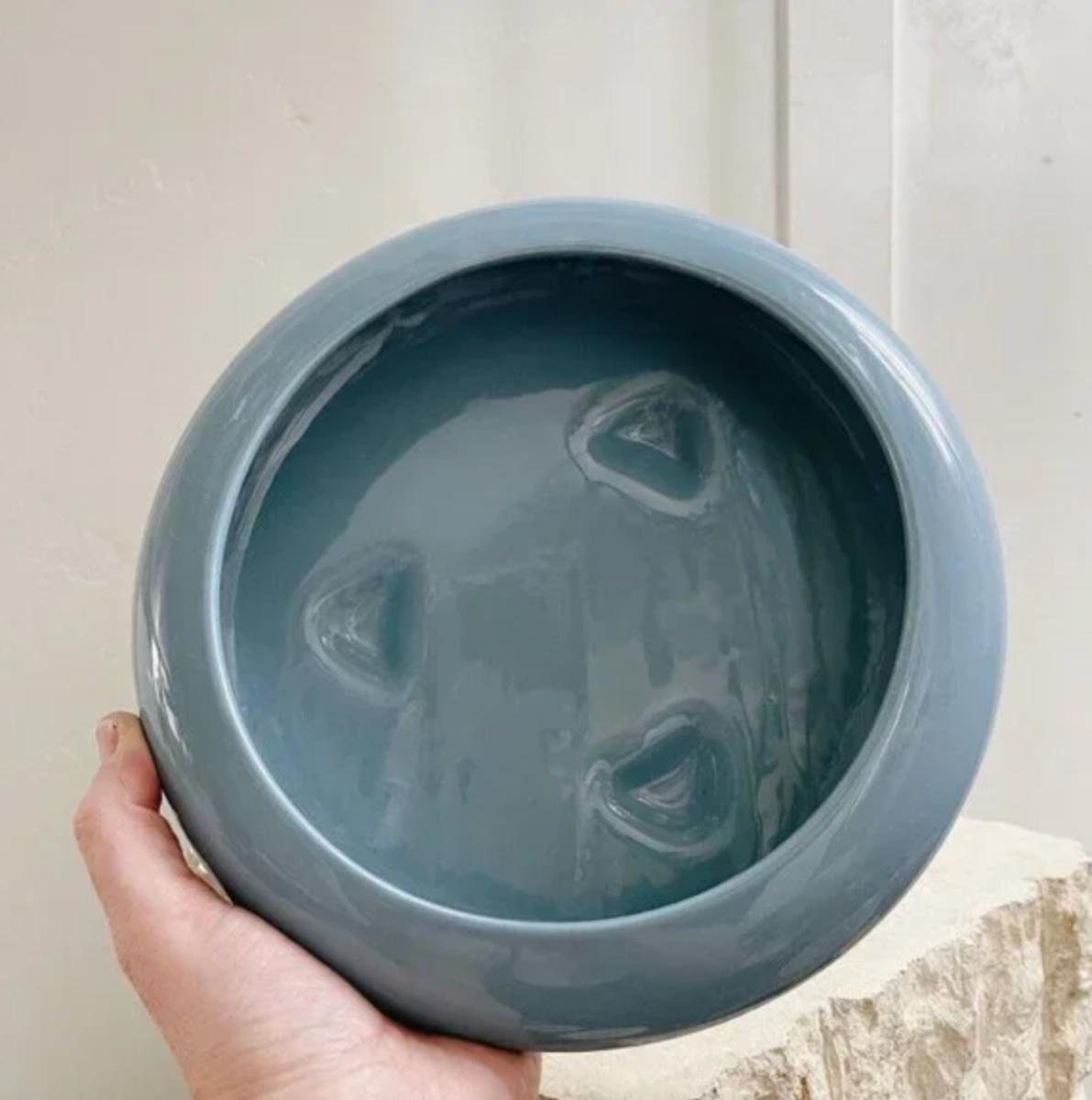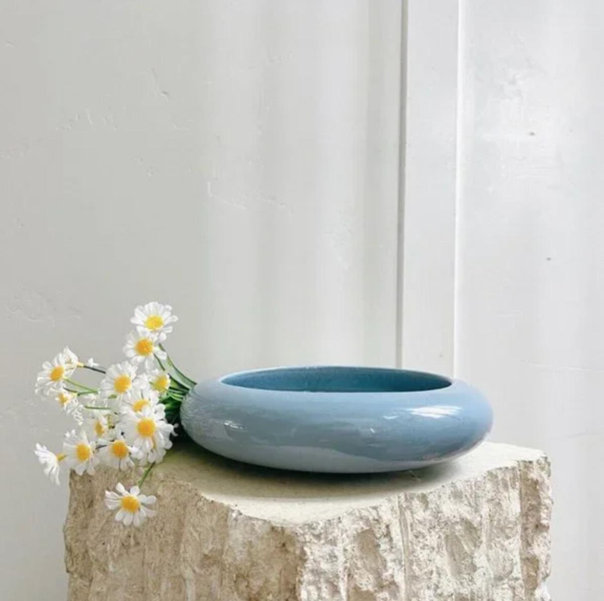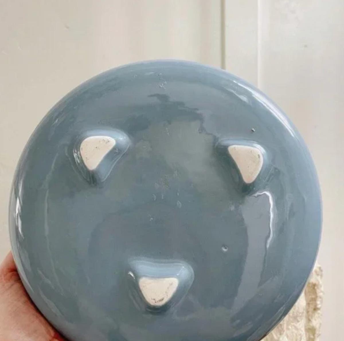 Vintage Mid Century Steel Blue Ceramic Glazed Flat Bowl Planter Vase Catch All