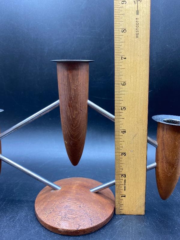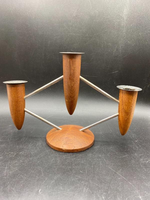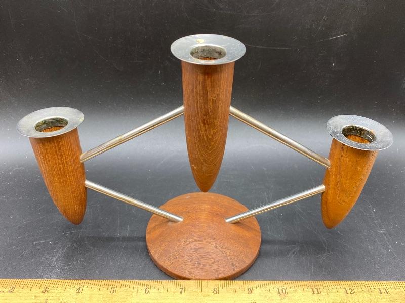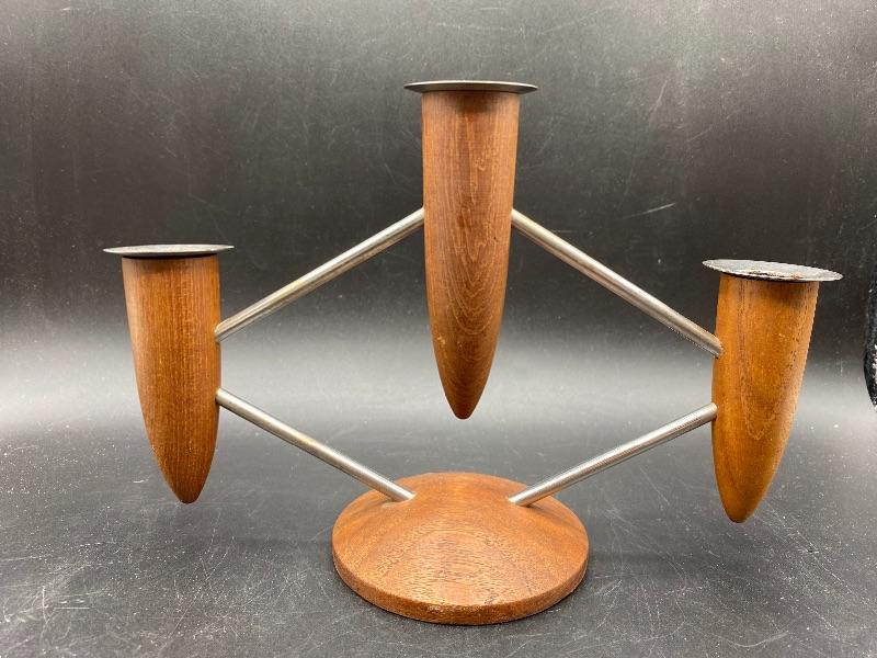 Vintage MidCentury teak wood candelabra. Holds 3 taper candles. About 10" wide and 7" tall. Felted bottom. Stainless metal needs to be cleaned up a little but looks great as is. Displays nicely.