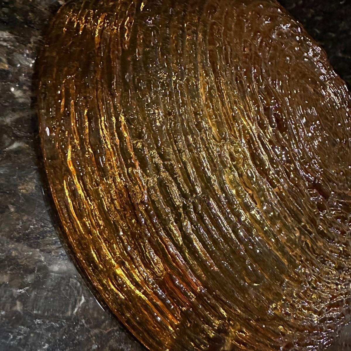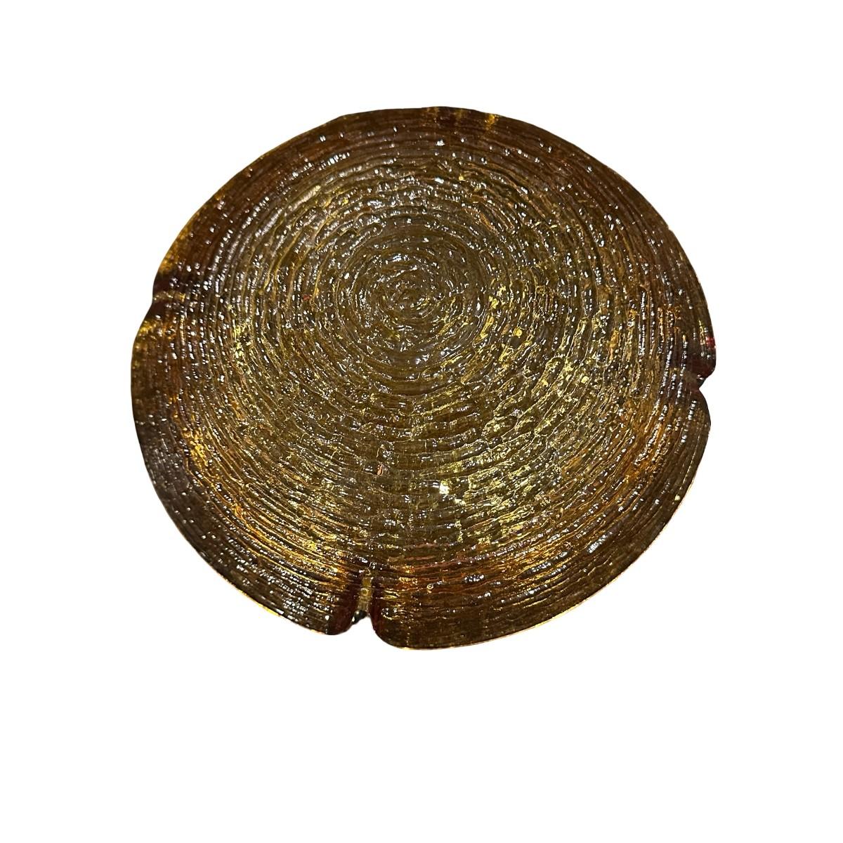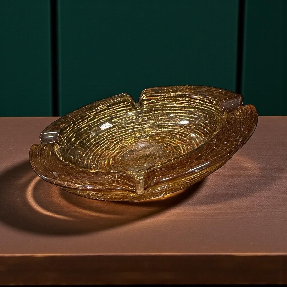 Vintage Mid-Century Amber Art Glass Ashtray, 4 cigarette rests, heavy, solid piece with a warm honey-gold tone. No chips. No markings.