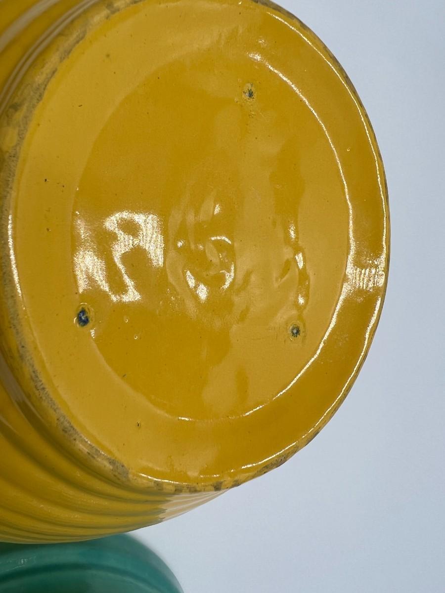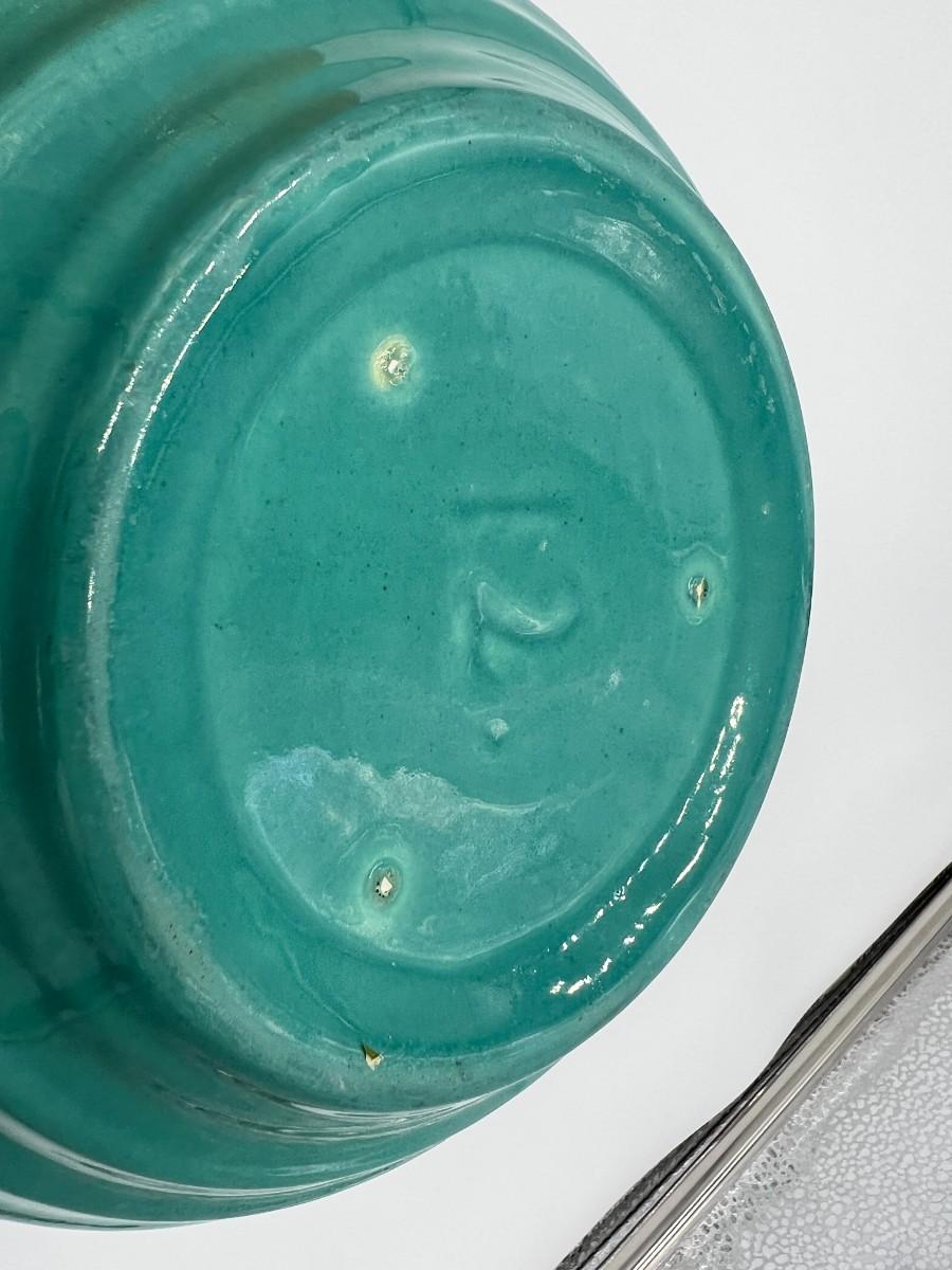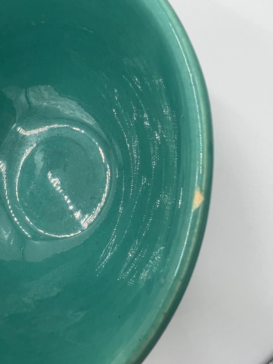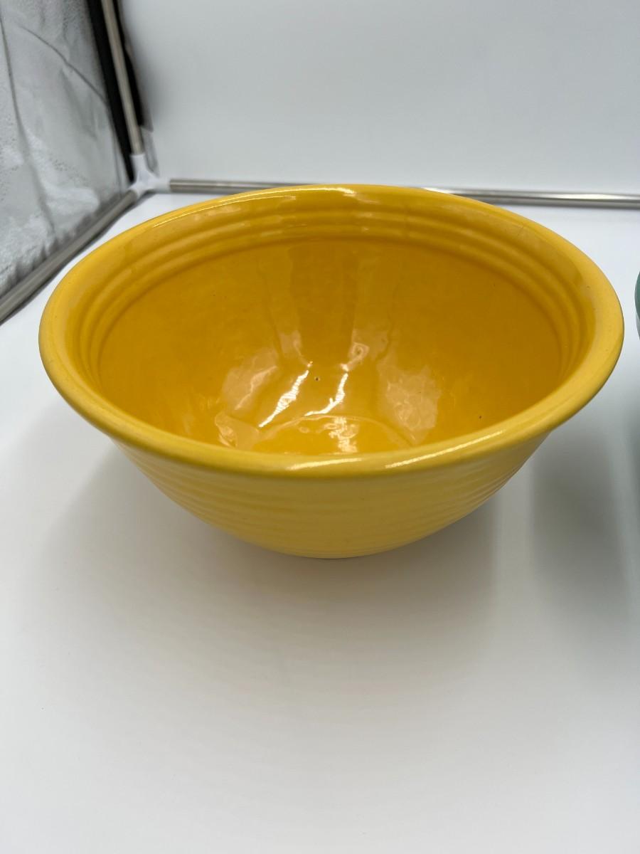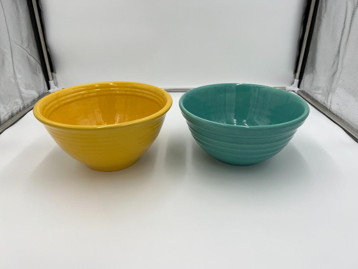 Lovely lot of 2 vintage mid century Bauer bowls, with #12 on bottom. Good condition, as shown, with one small chip on the rim of the blue bowl.