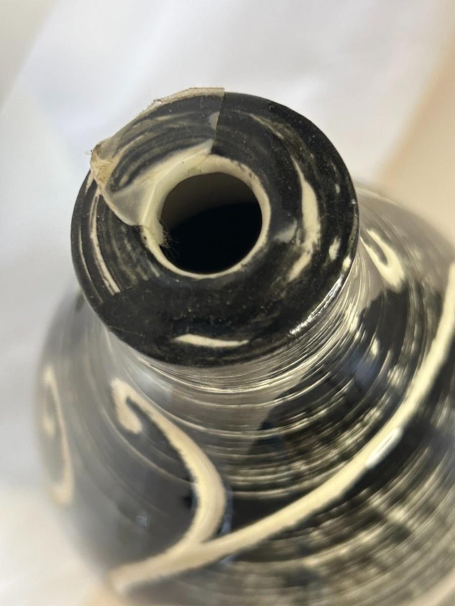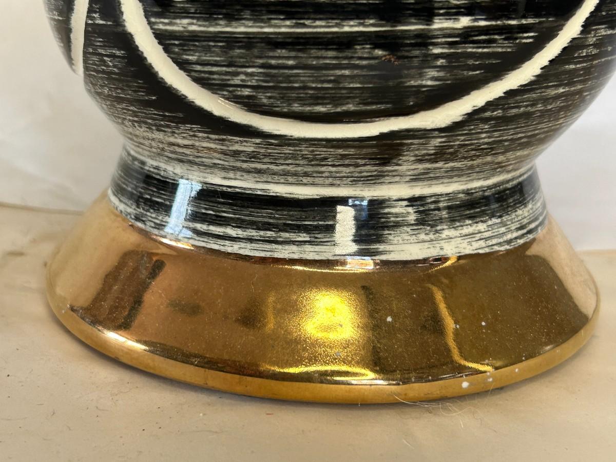 Ceramic black with white vines details. Brass base.