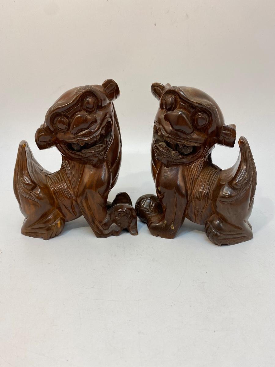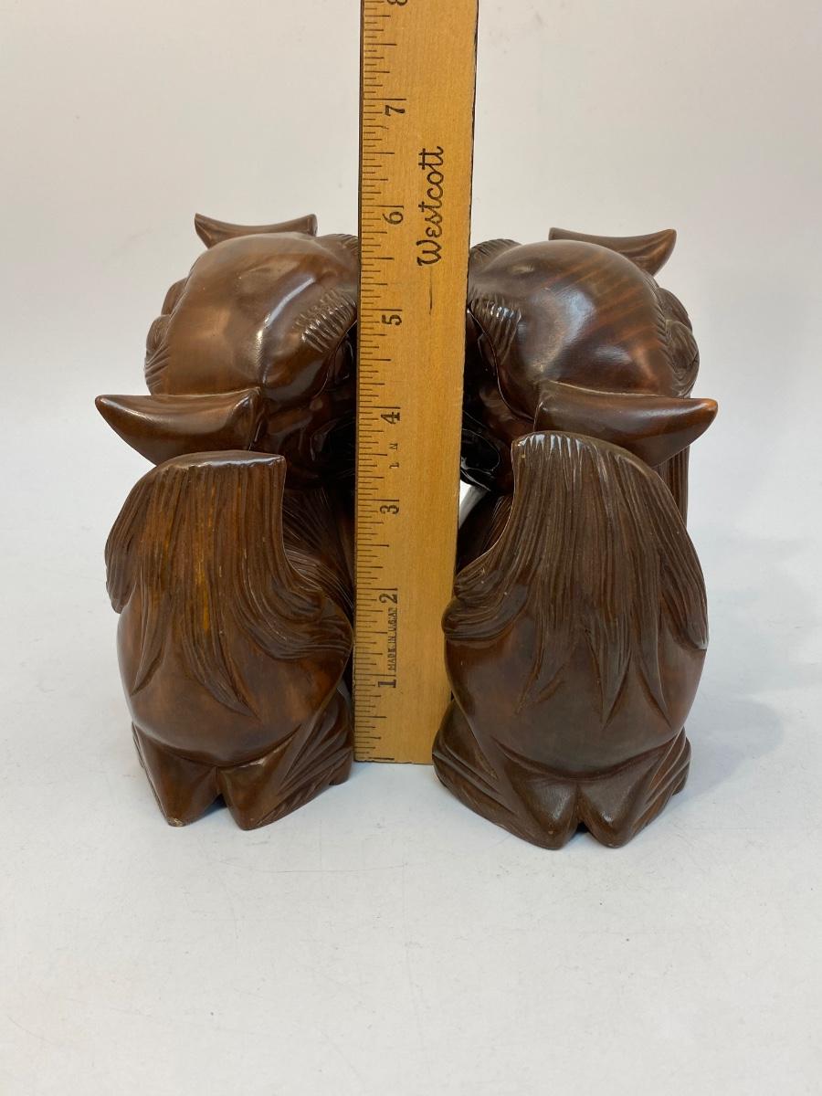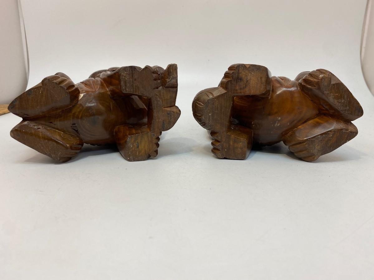 Vintage Midcentury Carved Wood Foo Dogs Bookends Figurines. Display great. Small spots of damage on backsides. About 6" height.