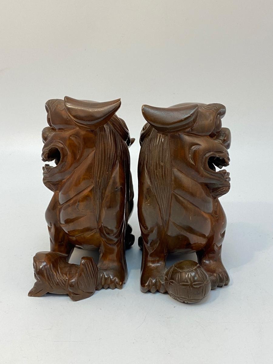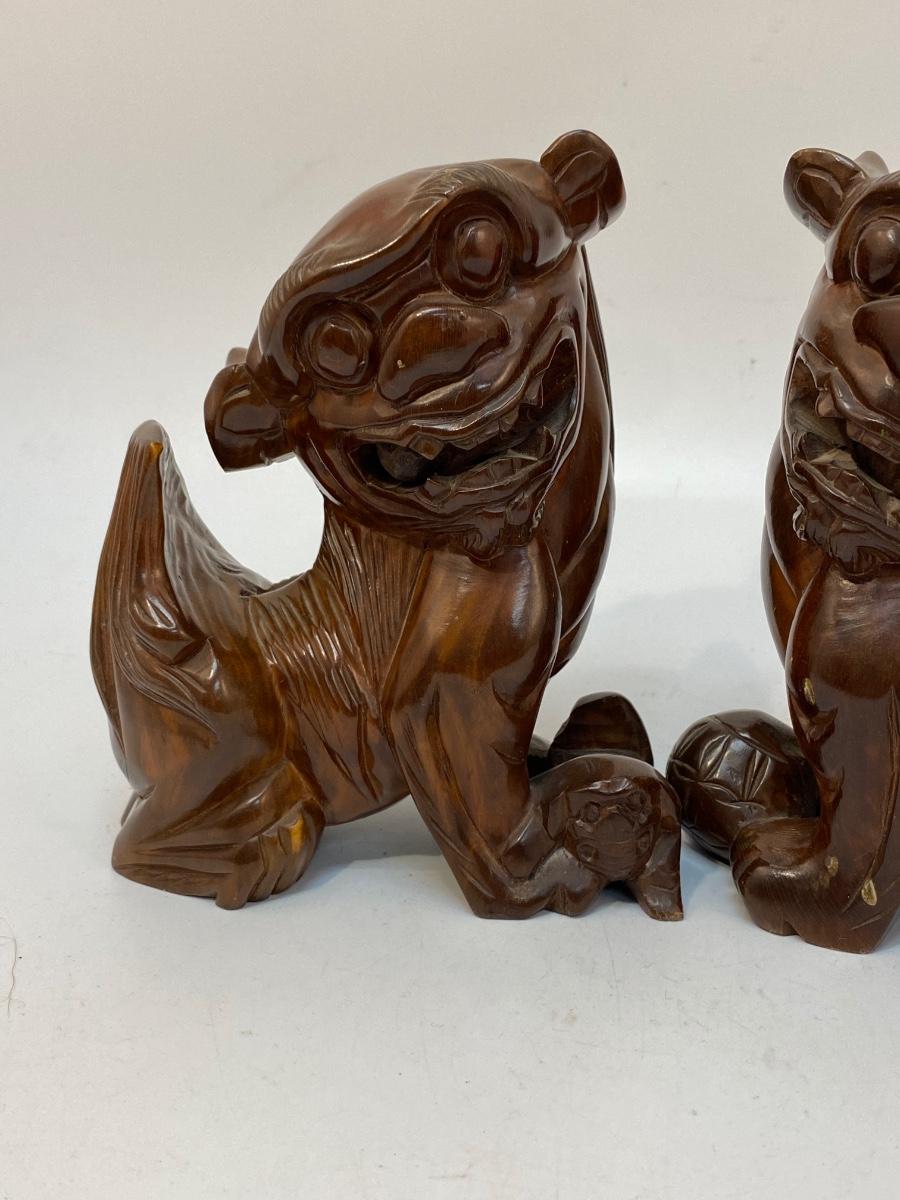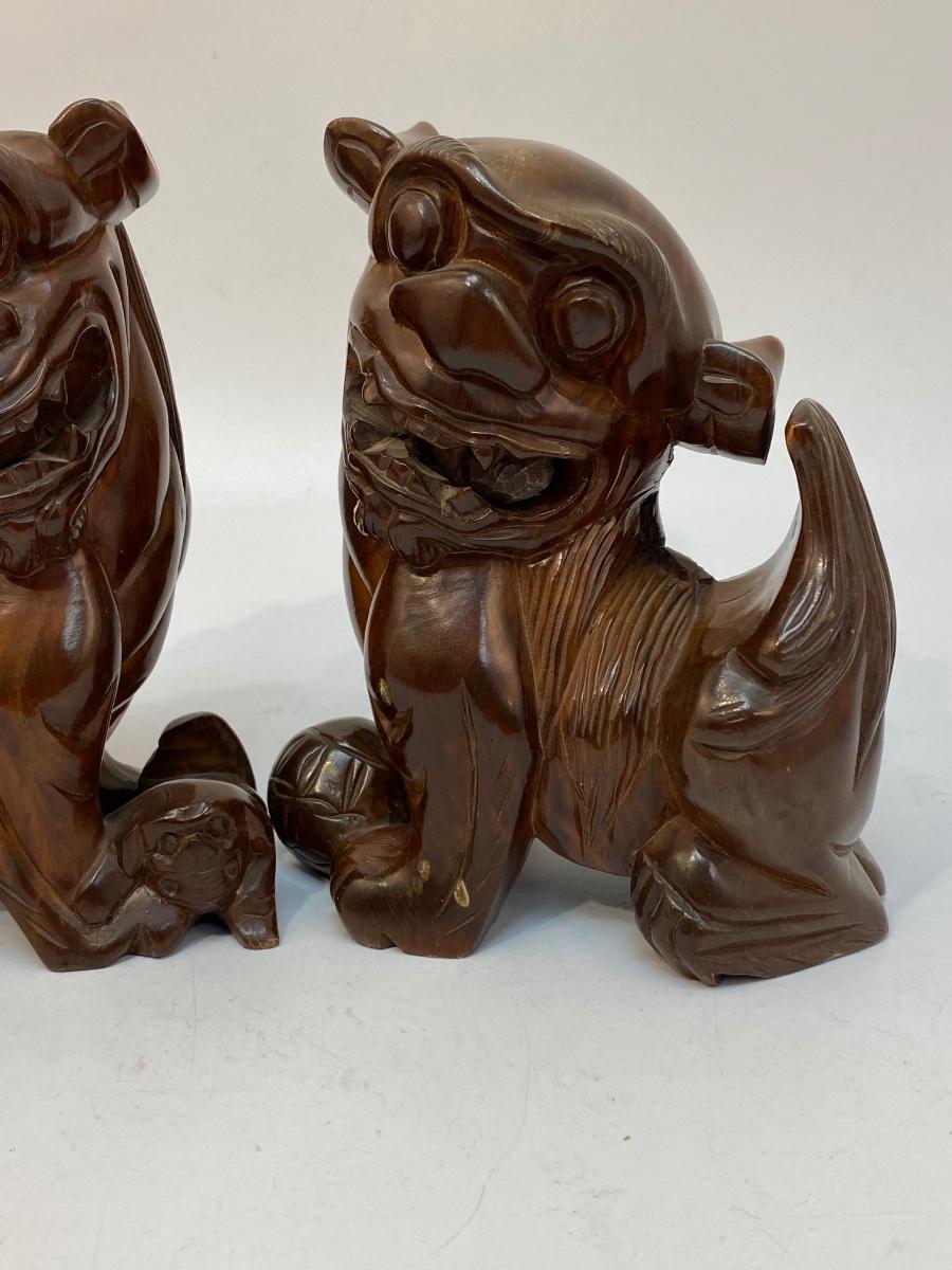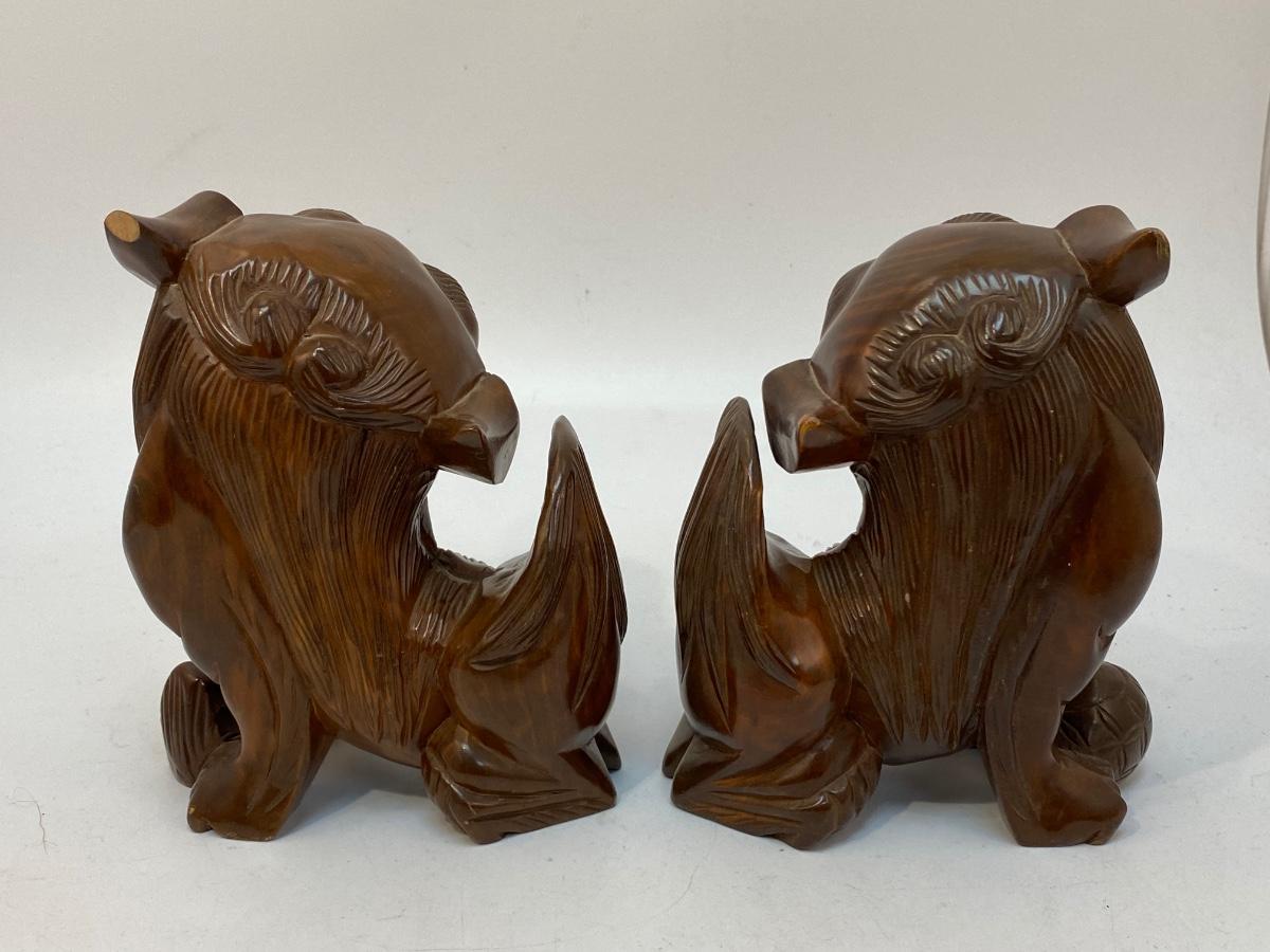 Vintage Midcentury Carved Wood Foo Dogs Bookends Figurines. Display great. Small spots of damage on backsides. About 6" height.