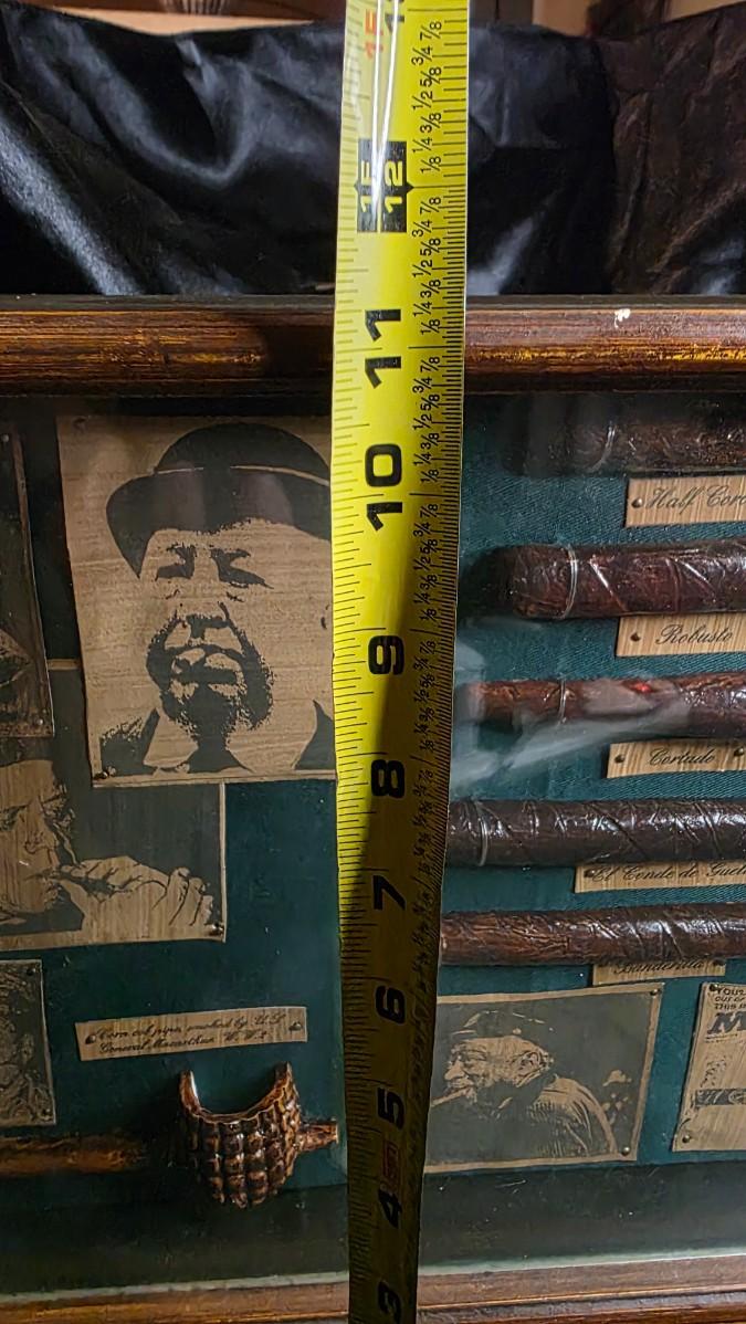 In the dim hush of a leather-bound study, where the air hangs thick with the ghosts of forgotten afternoons, a gentleman's ritual unfolds—not with haste, but with the slow reverence of a man who savors the pause between the world’s clamor and quiet reflection. This shadow box, a mid-century shrine to that lost art, captures it all: seven vintage cigars—Half Corona, Robusto, Cordoba beauties—wrapped in wrappers that whisper of Havana's humid nights, their cedar bands labeled in elegant script like invitations to a bygone salon.