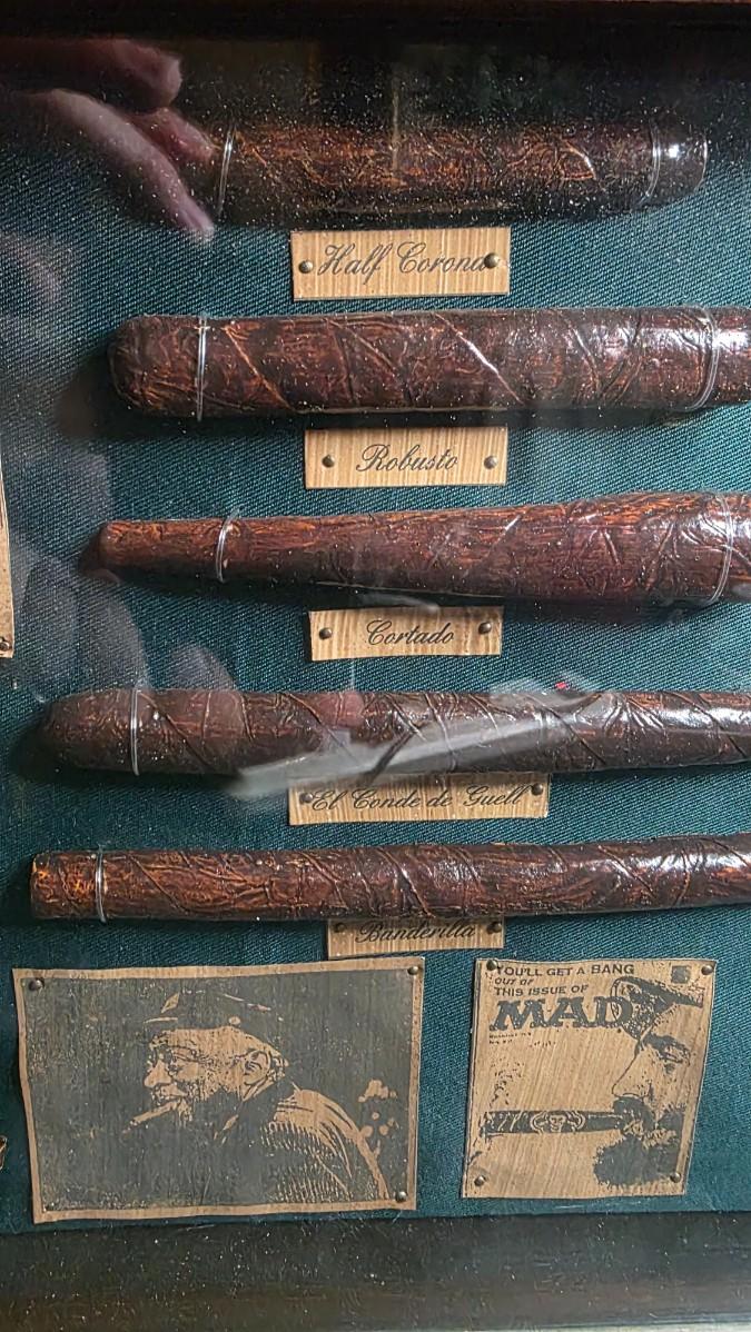 Beside them, a curved briar pipe rests like a faithful companion, its amber stem arched in eternal contemplation, while a hand-carved corn cob holder—knobbed and sturdy, straight from the fields of General Cigar lore—stands sentinel, evoking frontier tales of self-made kings puffing thoughtfully under wide skies. And scattered like pressed leaves from an old journal: brass-edged labels bearing Sherlock Holmes' profile, the detective's pipe clenched in that iconic squint, alongside ephemera from the golden age of smoke—yellowed ads for "MAD" magazine's irreverent nods to tobacco, portraits of stern-faced smokers, and brass plaques etched with the poetry of indulgence: "Made with the greatest care by hand, without a machine."