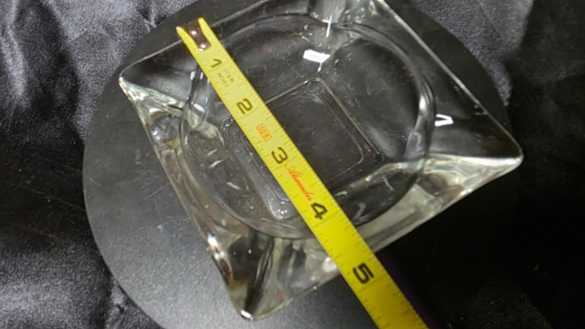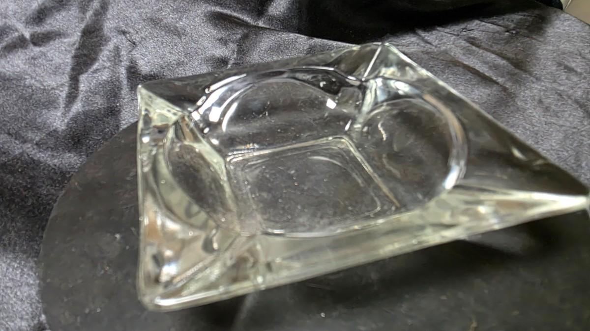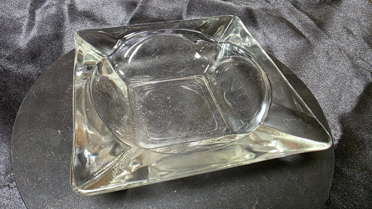 This mid-century pressed glass ashtray captures the clean geometry and understated confidence that defined postwar design. Its square form, weighty construction, and softly faceted edges give it a grounded presence, while the clear glass allows light to move through the piece with quiet elegance. It feels intentional, architectural, and unmistakably of its era.
