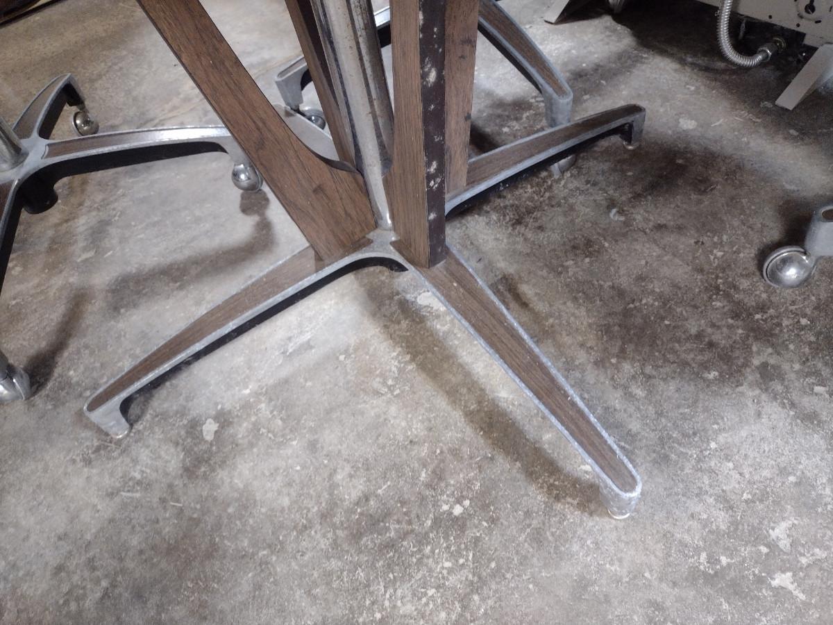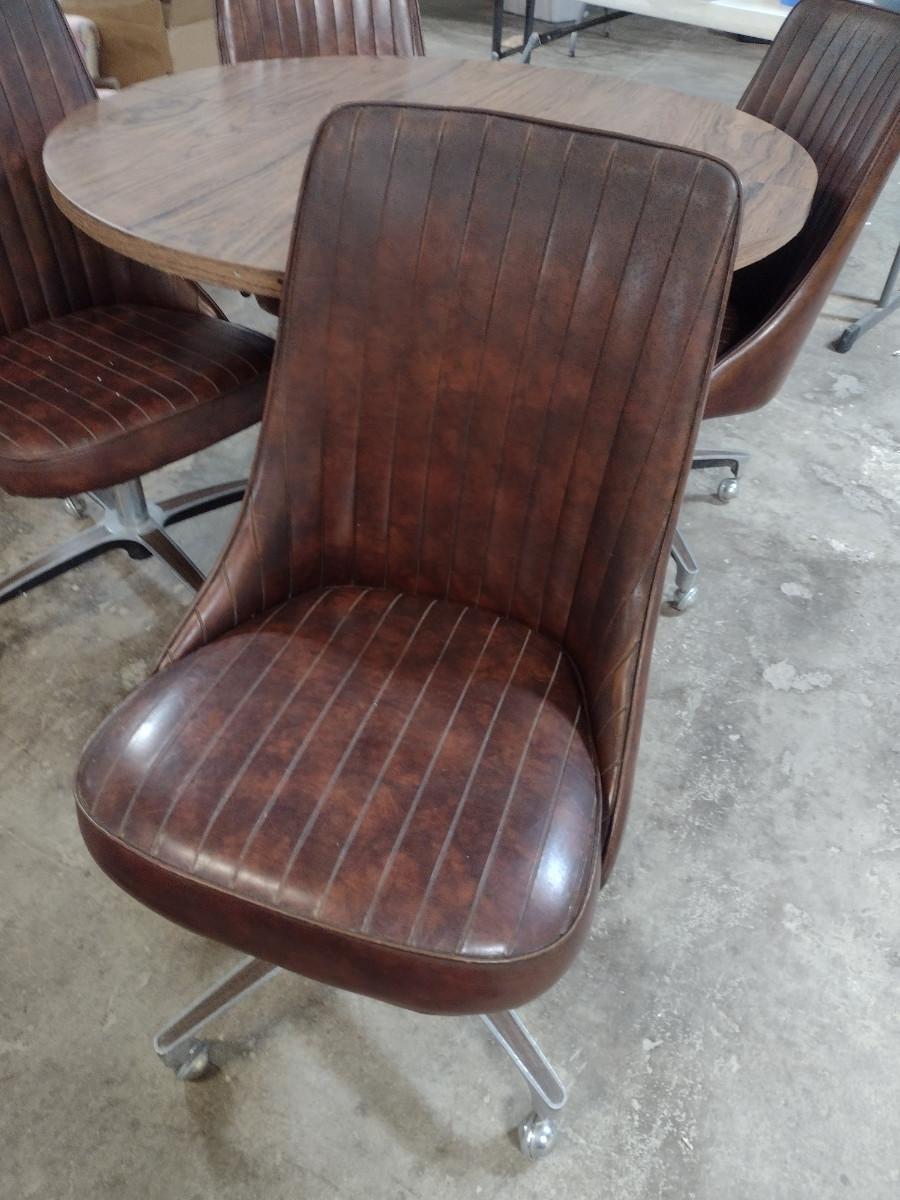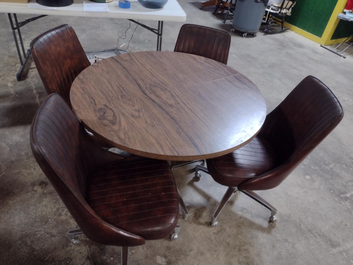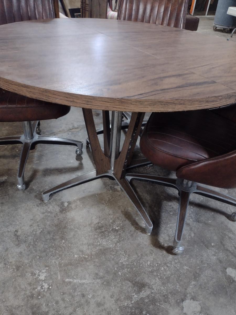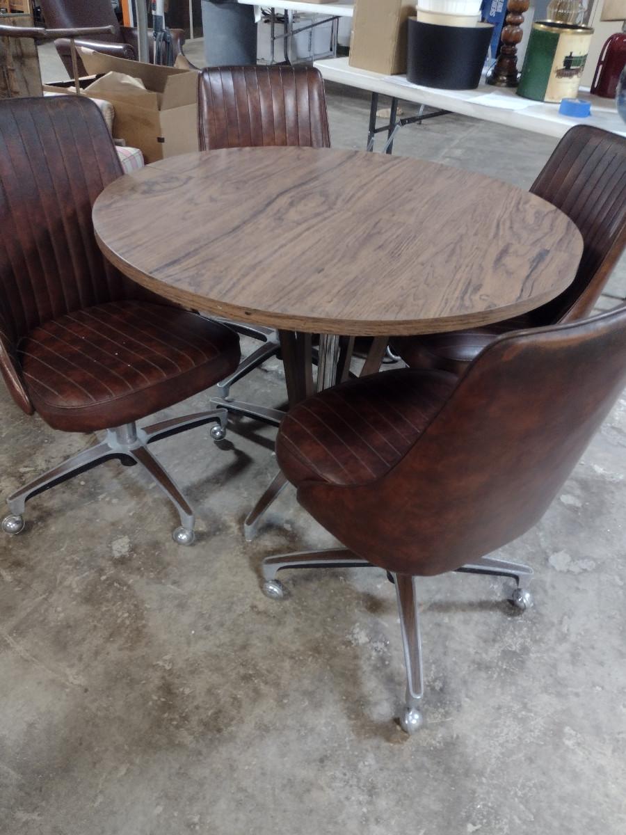 Vintage Mid-Century Laminate Wood Grain Finish Table with Four Rolling Chairs. Made by Chromcraft Corp. Table is approx 42" in diameter.