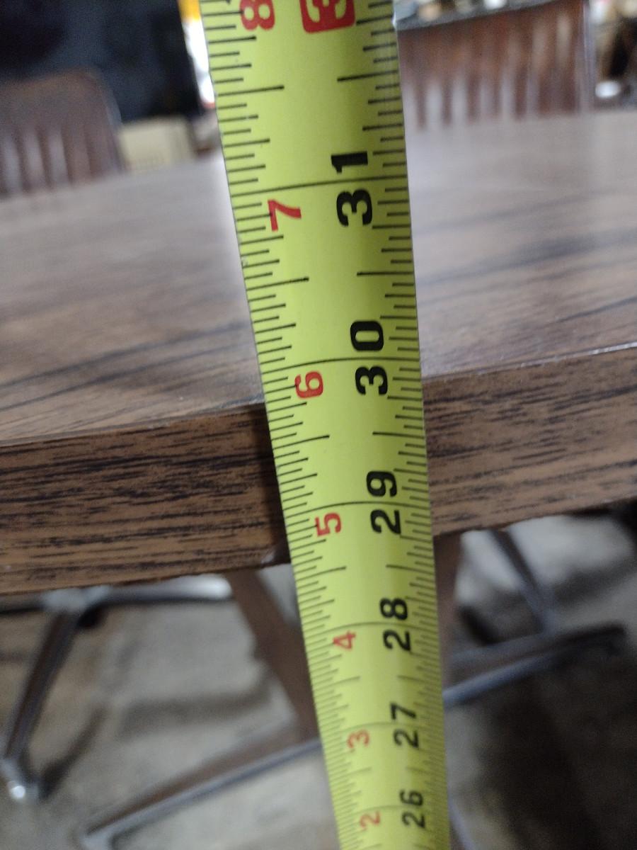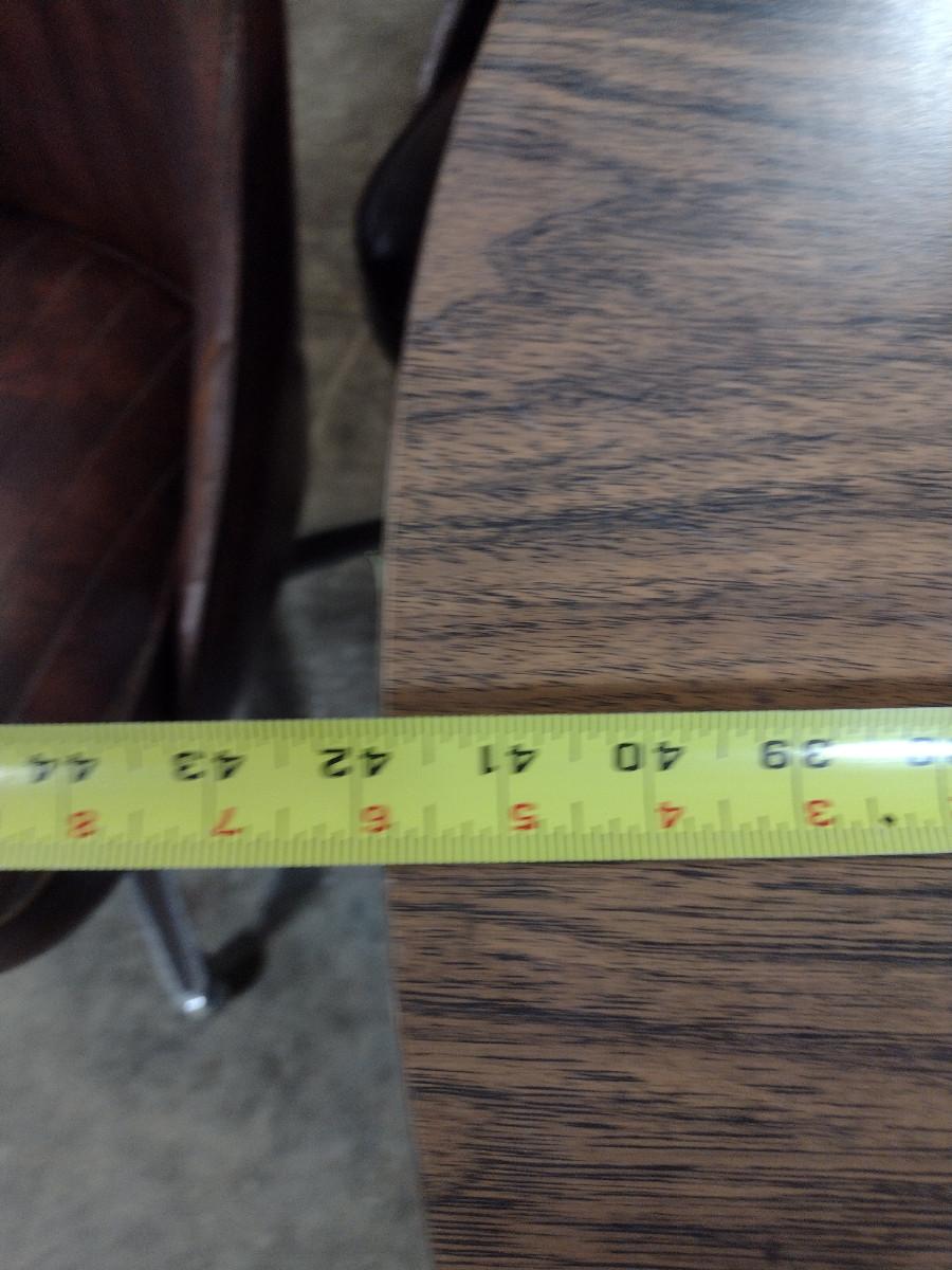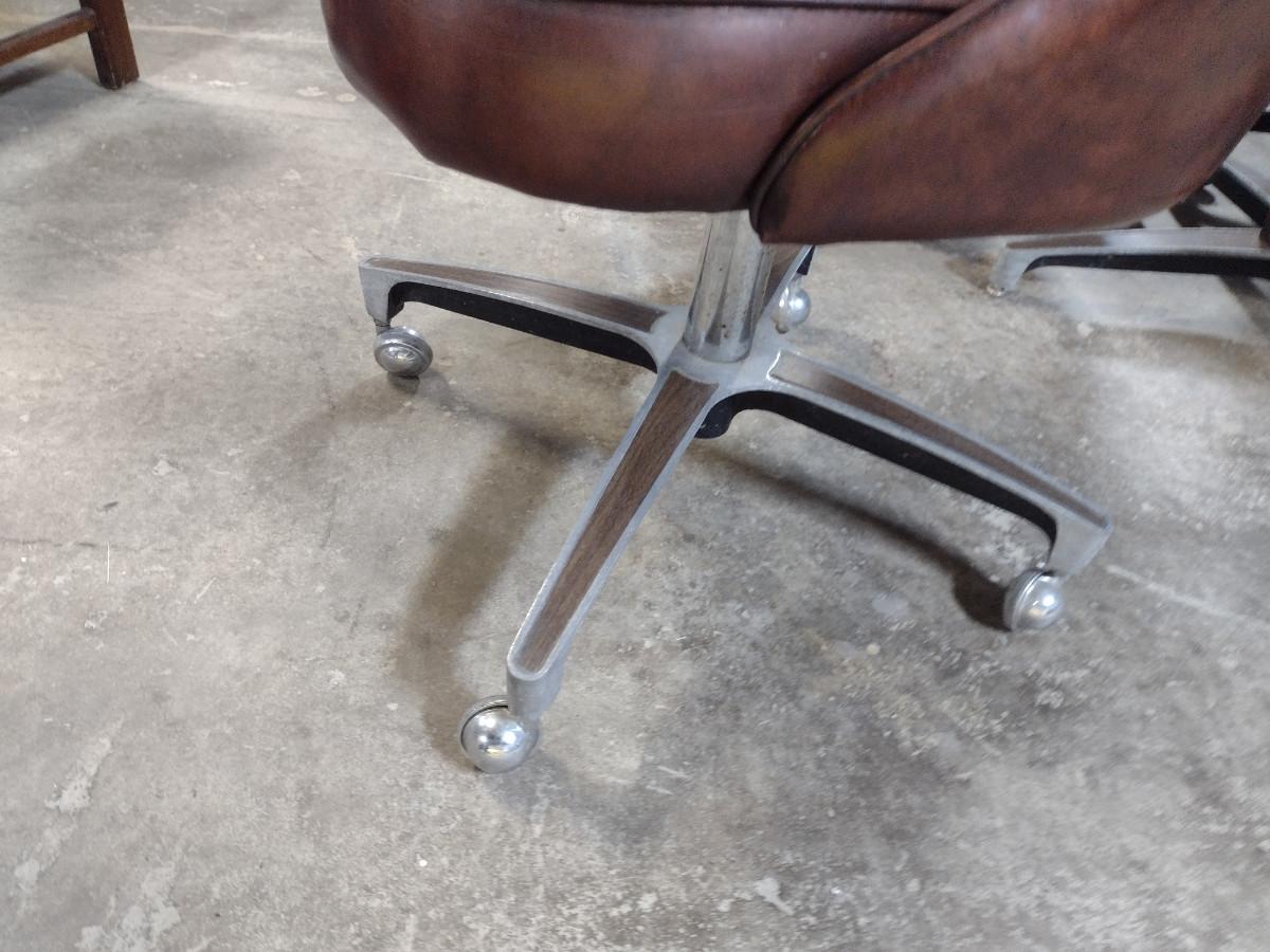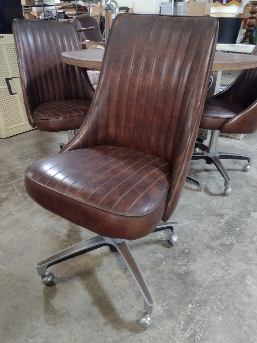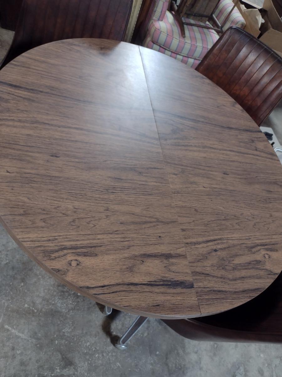 Vintage Mid-Century Laminate Wood Grain Finish Table with Four Rolling Chairs. Made by Chromcraft Corp. Table is approx 42" in diameter.
