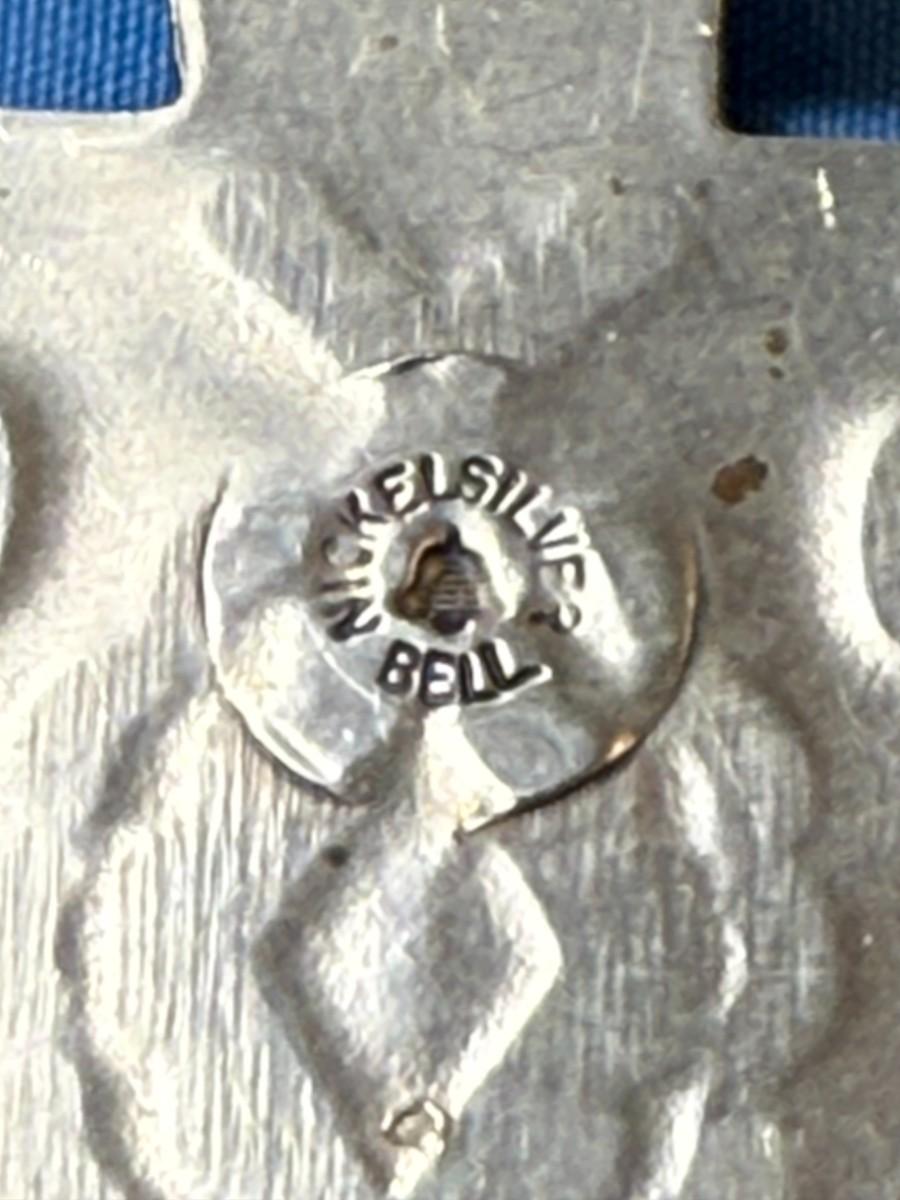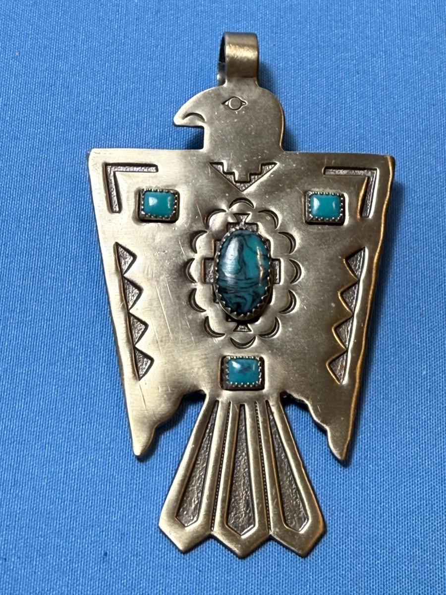 Vintage Mid-Century Nickel/Silver BELL TRADING POST Thunderbird Pendant 3" Tall w/Turquoise Accents as Pictured.