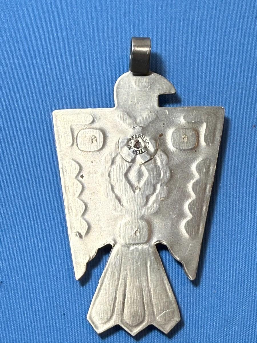 Vintage Mid-Century Nickel/Silver BELL TRADING POST Thunderbird Pendant 3" Tall w/Turquoise Accents as Pictured. $5 DOMESTIC SHIPPING.