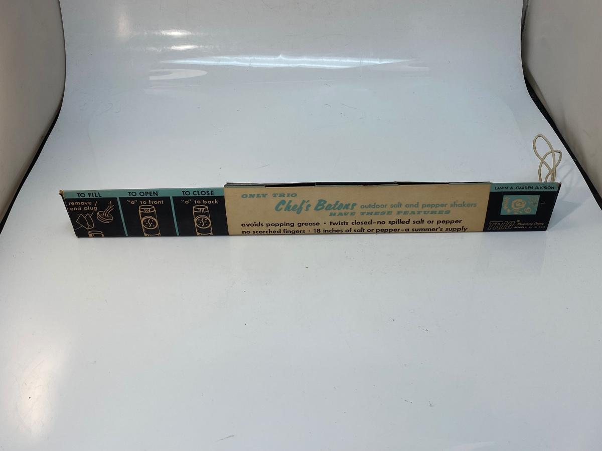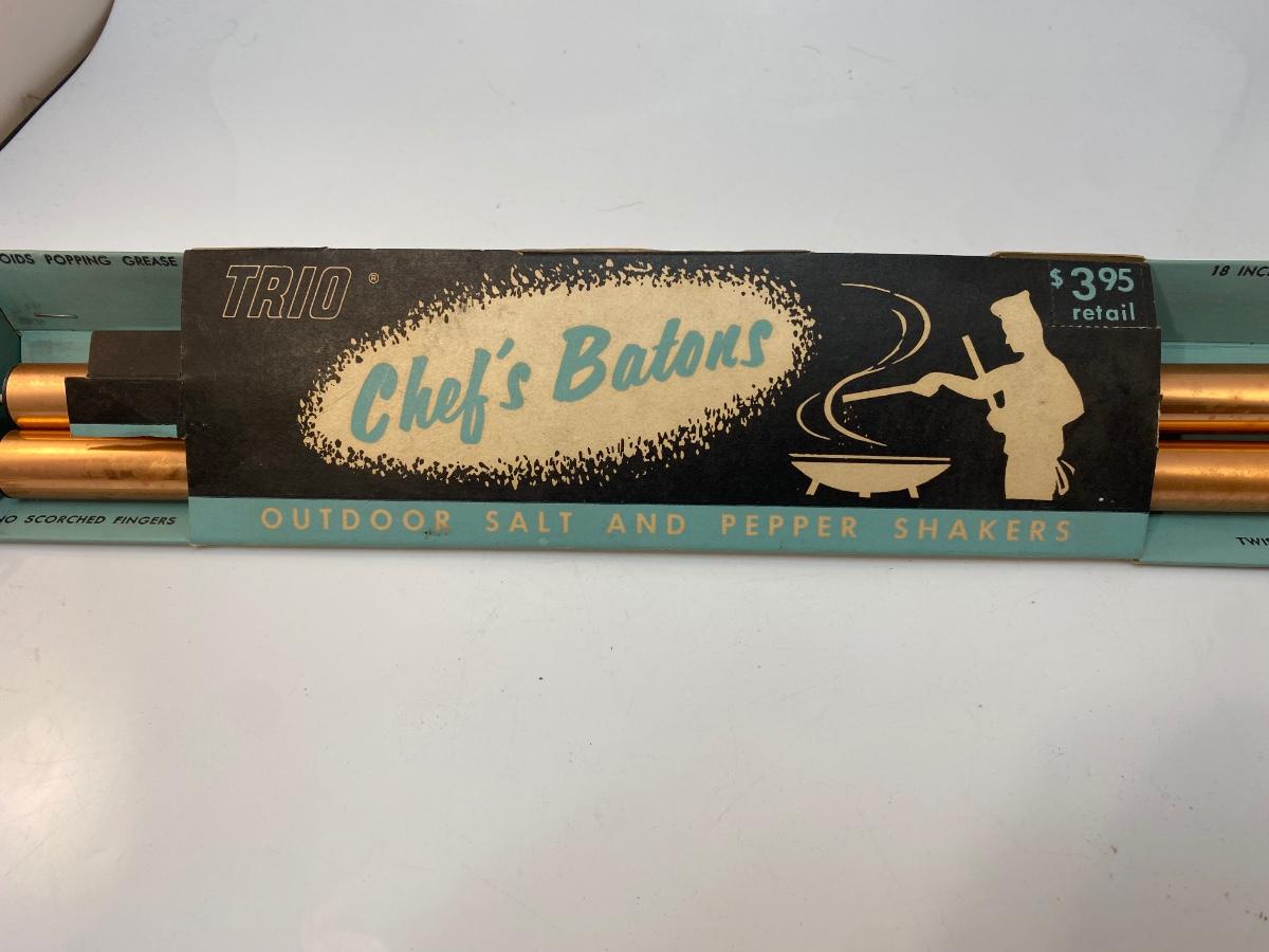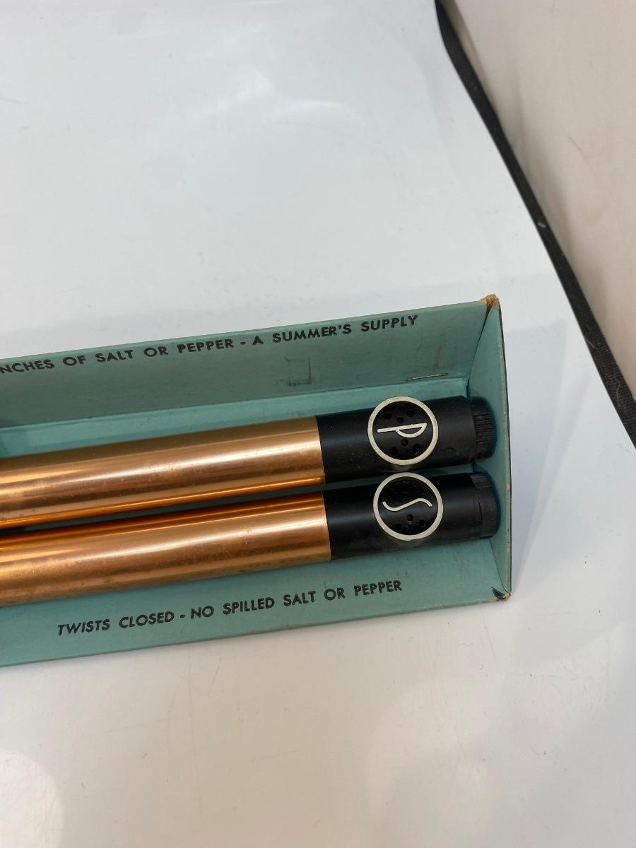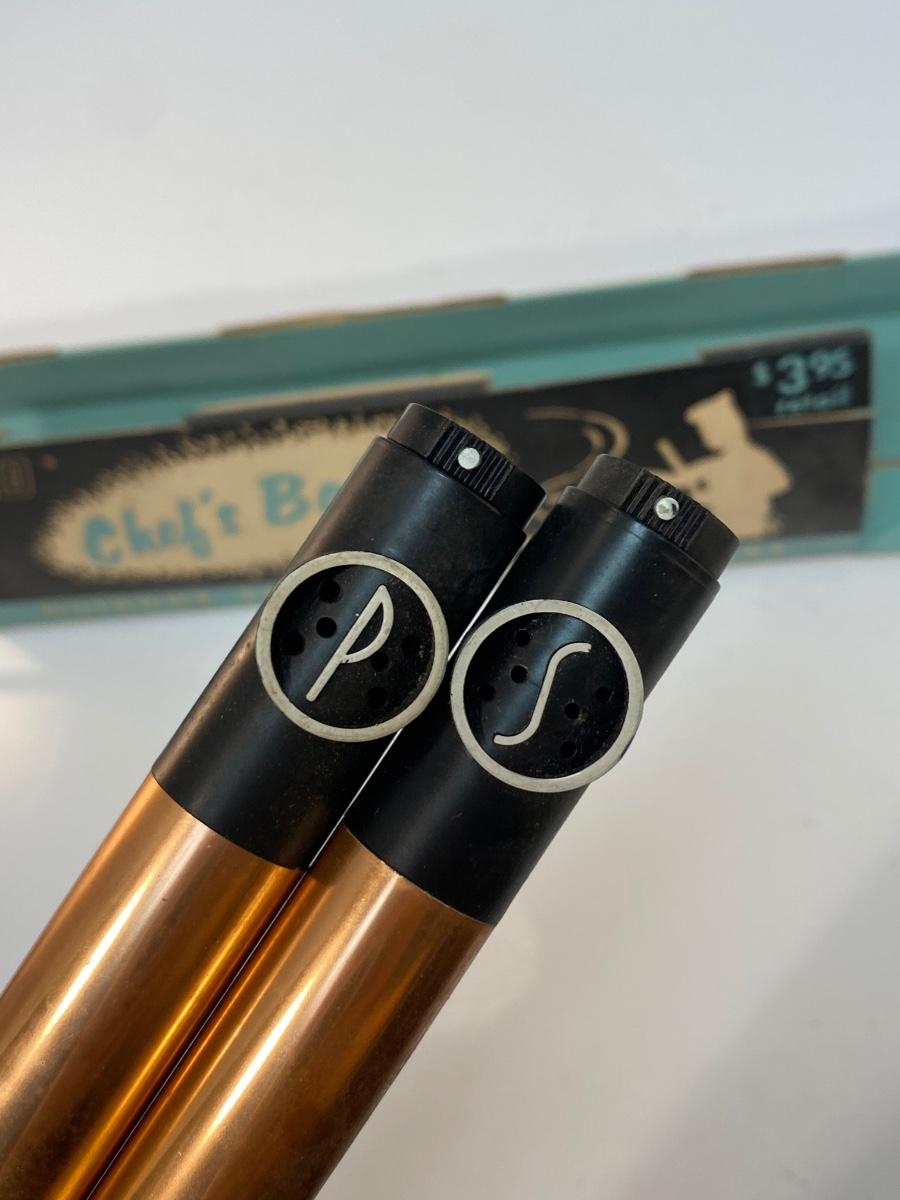 Vintage Midcentury Retro Copper Chef's Batons Outdoor Salt & Pepper Shakers by Trio. In original box. Extra-long for safe open flame cooking.