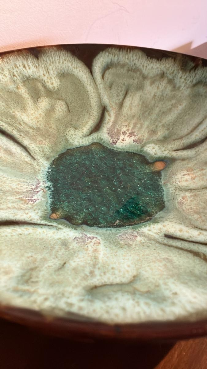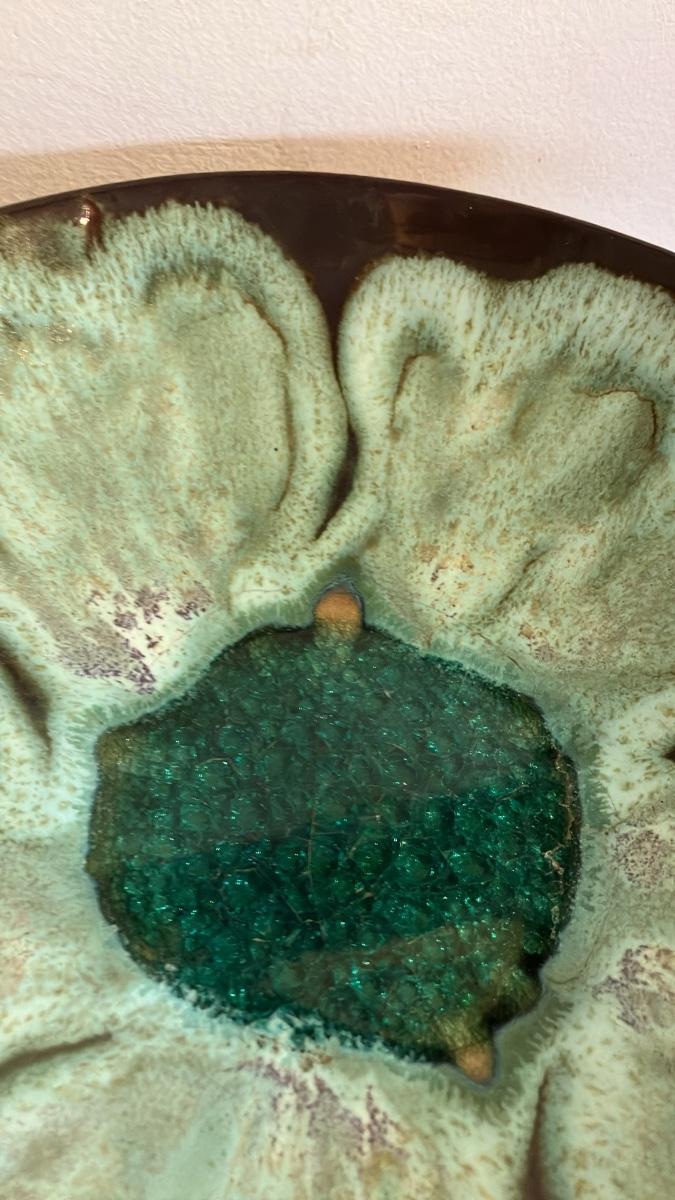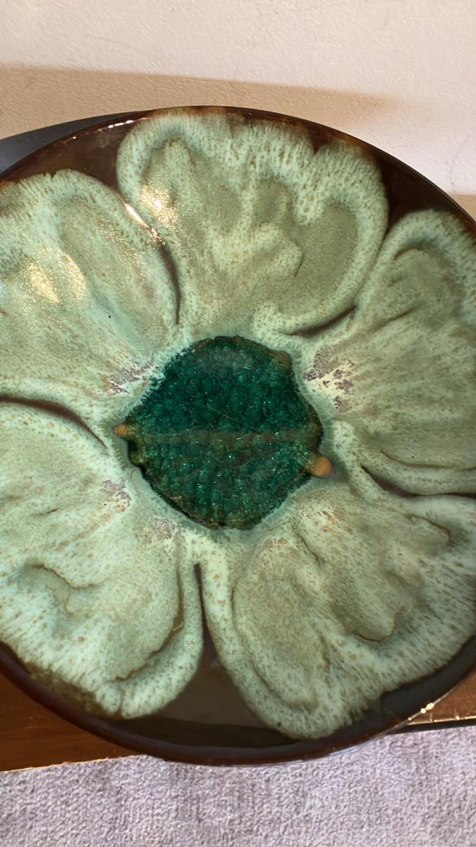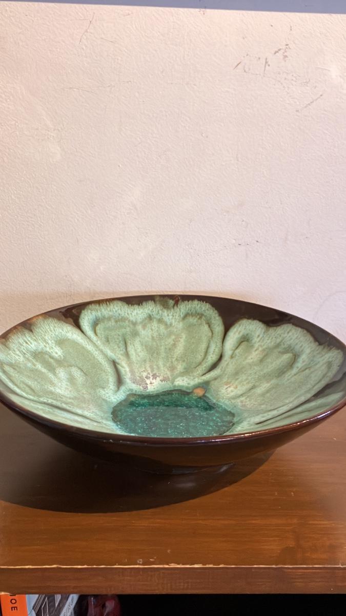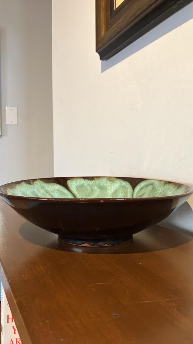 This attractive vintage art pottery bowl measures approximately 10.5 inches in diameter and features a striking drip-glaze design in shades of soft seafoam green flowing into deeper teal and aqua tones at the center, contrasting beautifully against a rich brown exterior and rim. The organic, petal-like glaze pattern evokes mid-20th-century studio pottery aesthetics, with crystalline effects and subtle textural variations typical of handcrafted ceramic glazes. The interior bottom shows a deeper pooled glaze with minor speckling, adding to its artisanal character.