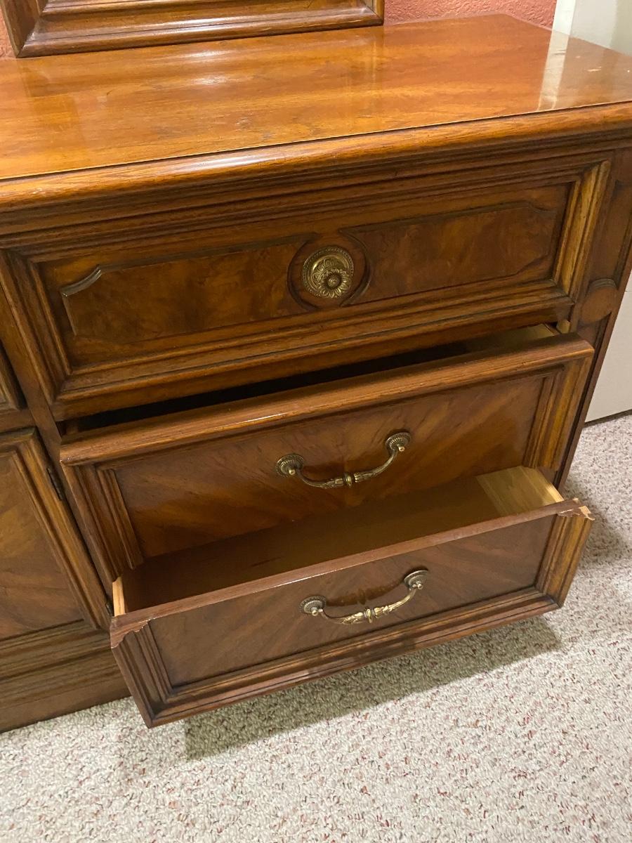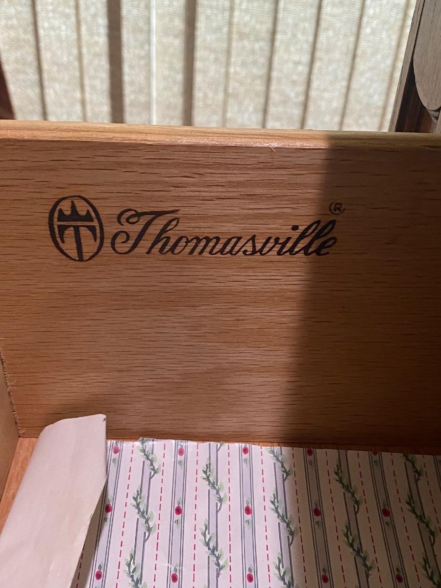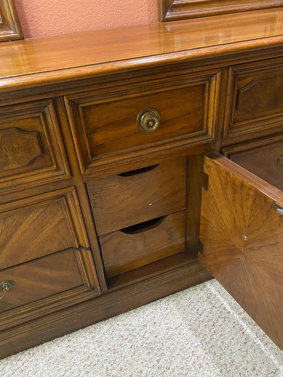 Vintage Midcentury Thomasville Long Dresser with Mirrors. 9 drawer dresser, two center drawers are hidden by cabinet door. In good condition.