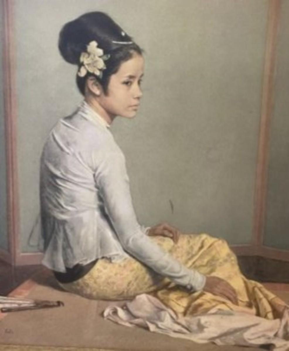 Vintage Mid-Century Young Asian Girl Print on Board in a Wooden Frame Size 25.5" x 32".