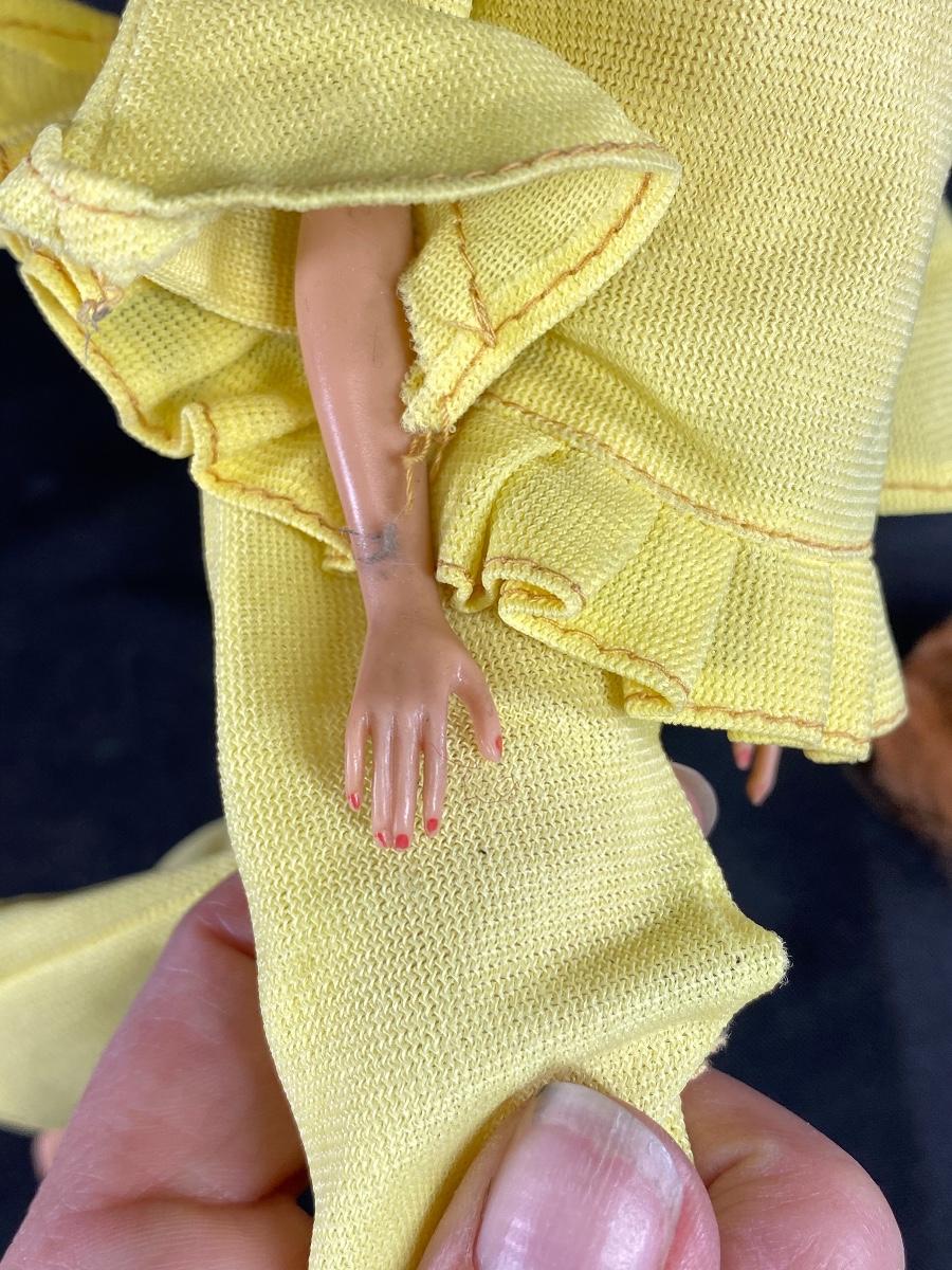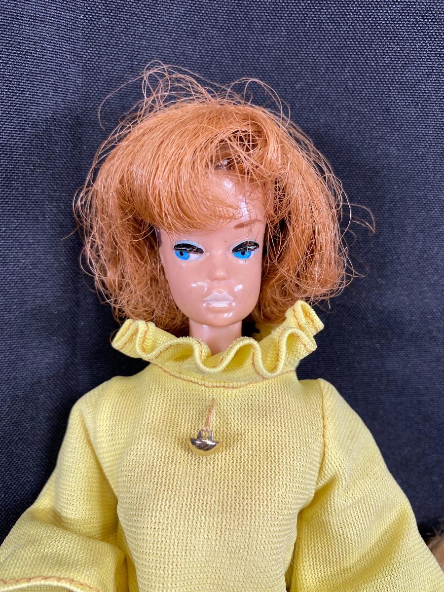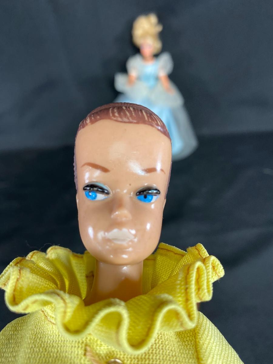 Vintage Midge doll. This Midge was a wig doll, comes with the one wig. Lips have paled from age. Hands are in good condition. Not sure if it is an original outfit, looks vintage, does have a hole in the thigh. Cinderella Barbie is newer, mini size.