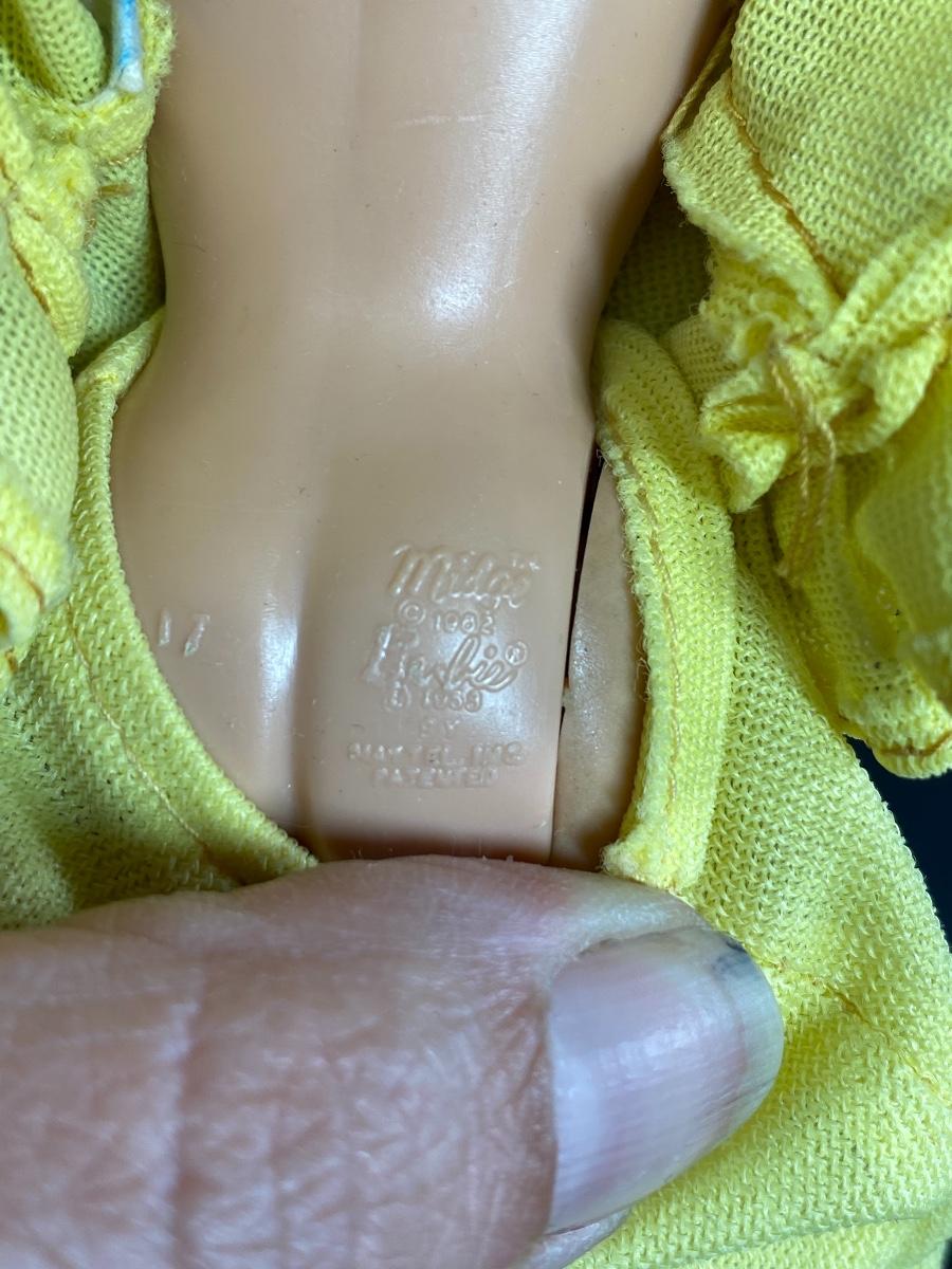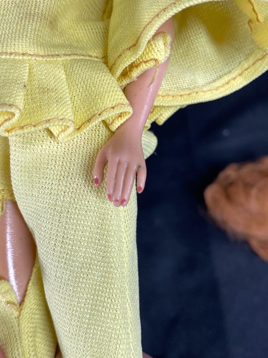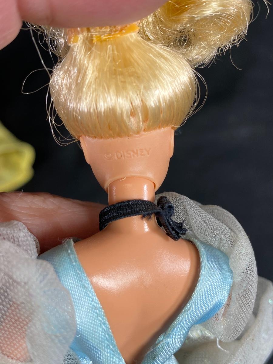 Vintage Midge doll. This Midge was a wig doll, comes with the one wig. Lips have paled from age. Hands are in good condition. Not sure if it is an original outfit, looks vintage, does have a hole in the thigh. Cinderella Barbie is newer, mini size.
