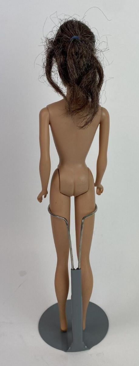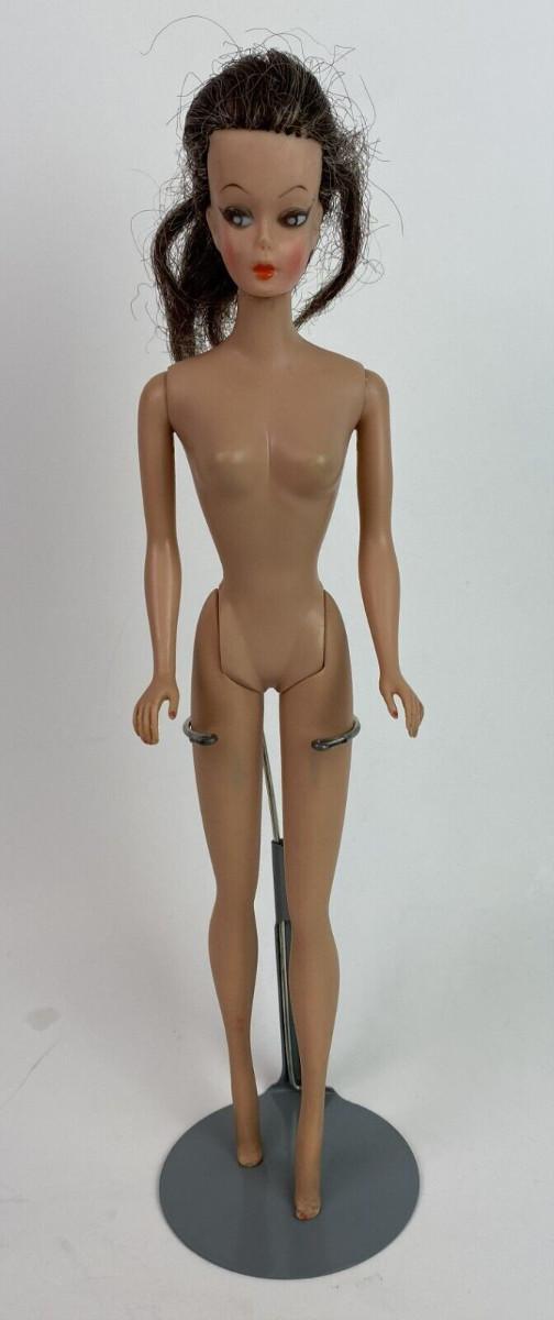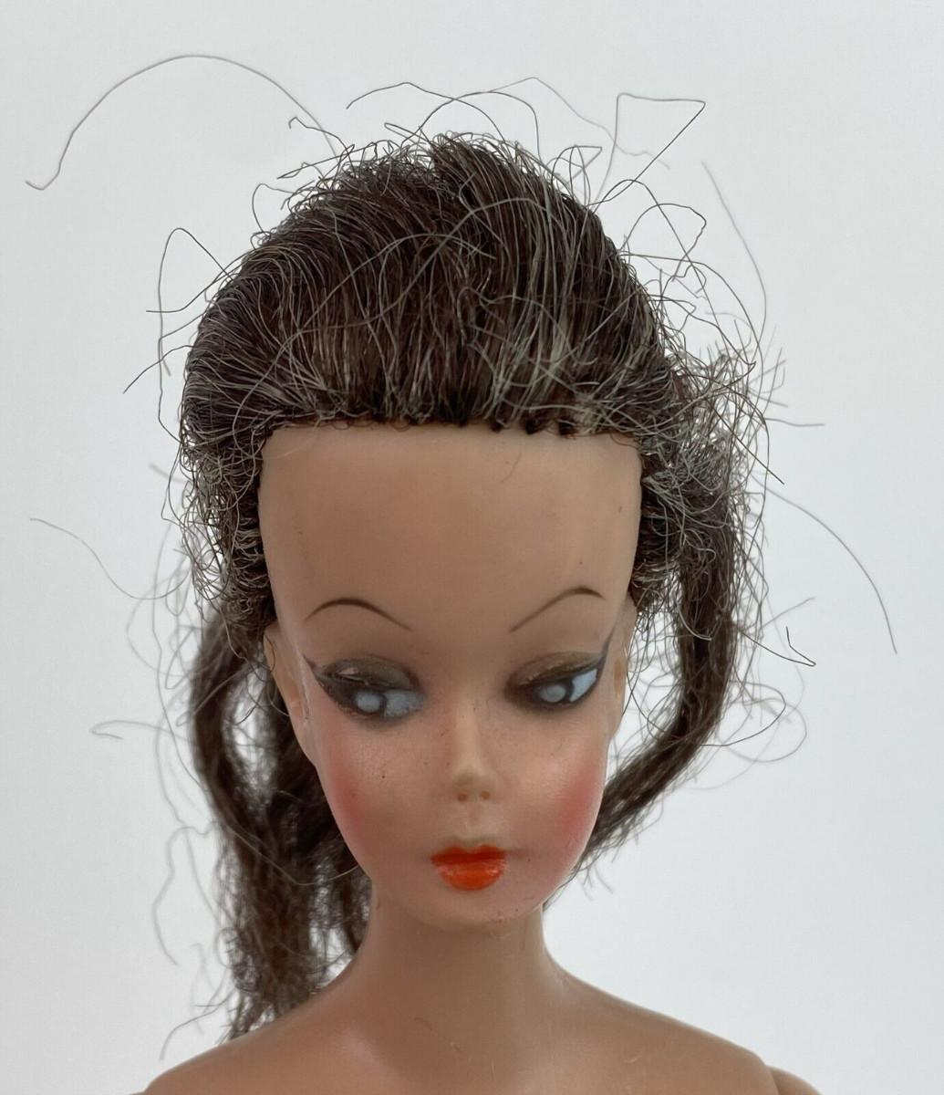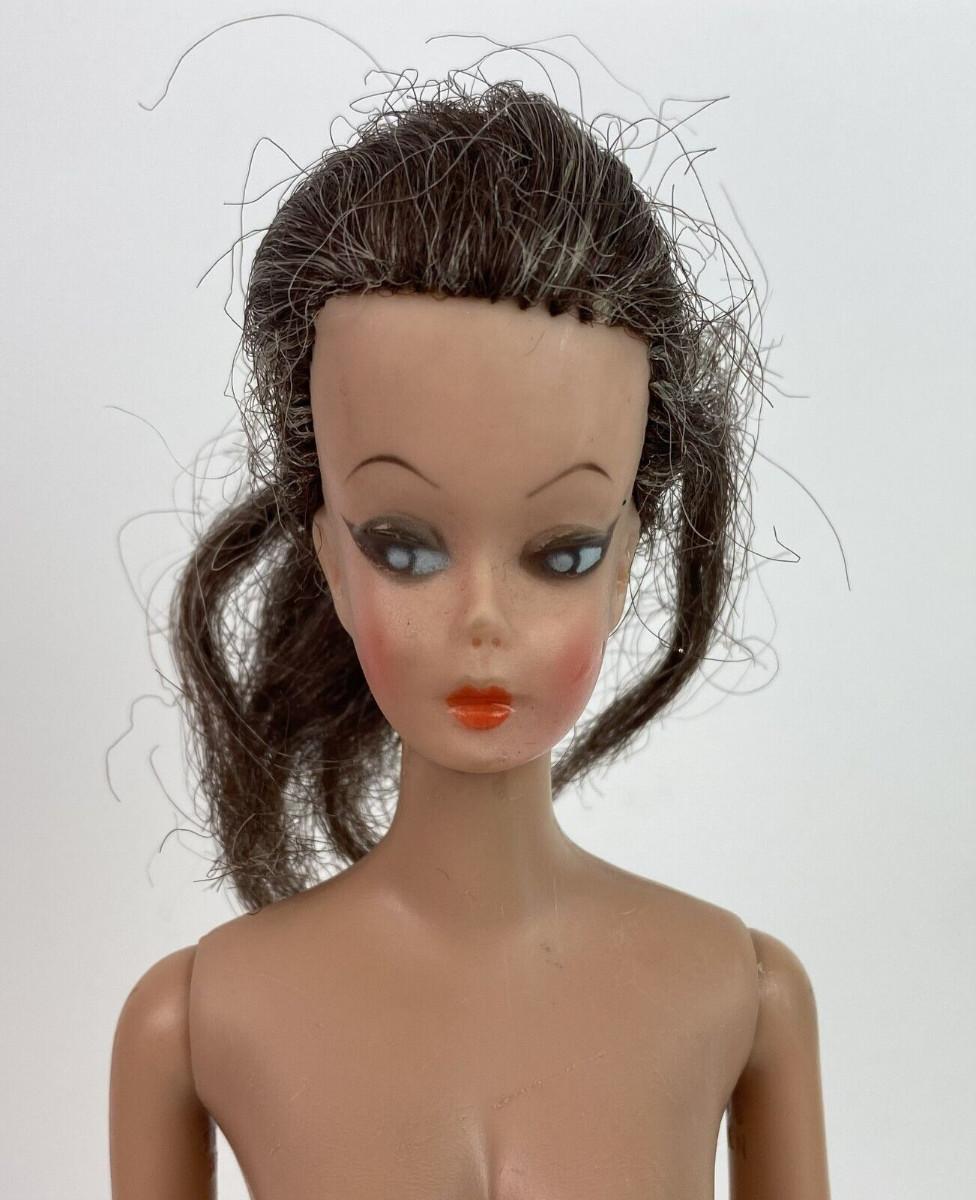 Straight leg 11 1/2" Midge doll body with the 1964-1965 markings...but the head confuses me? Side looking eyes..unusual coloring? Barbie collector's would know if this is a variation? as shown..Salt and pepper medium brown hair.