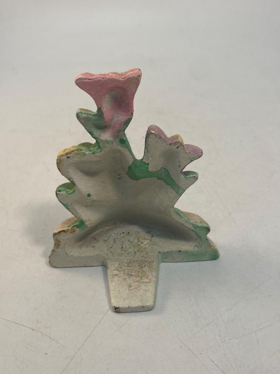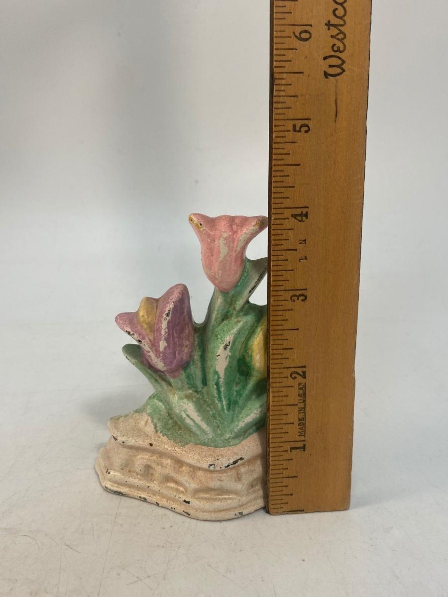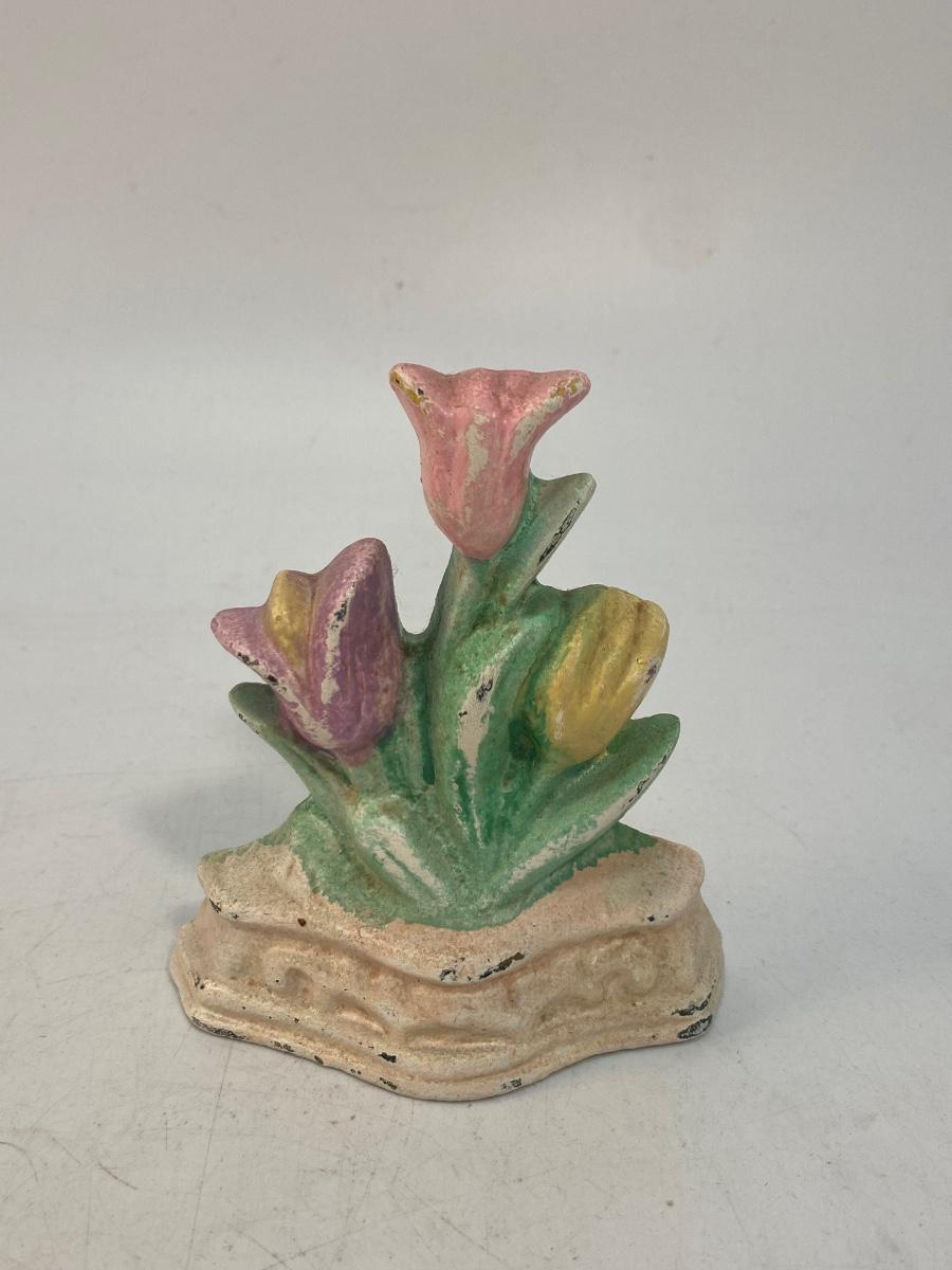 Vintage Midwest Imports Painted Cast Metal Tulips Doorstop. Paint is worn from age. Could be repainted if desired. Small about 4" size.
