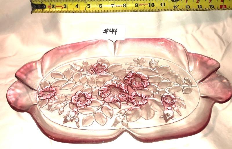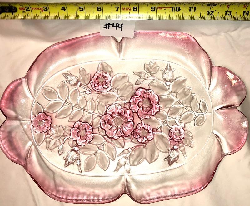 Vintage Mikasa pink floral serving platter party tray 1980s glass pre-owned original mint condition dimensions 13.5”W x 19”D x 1”h