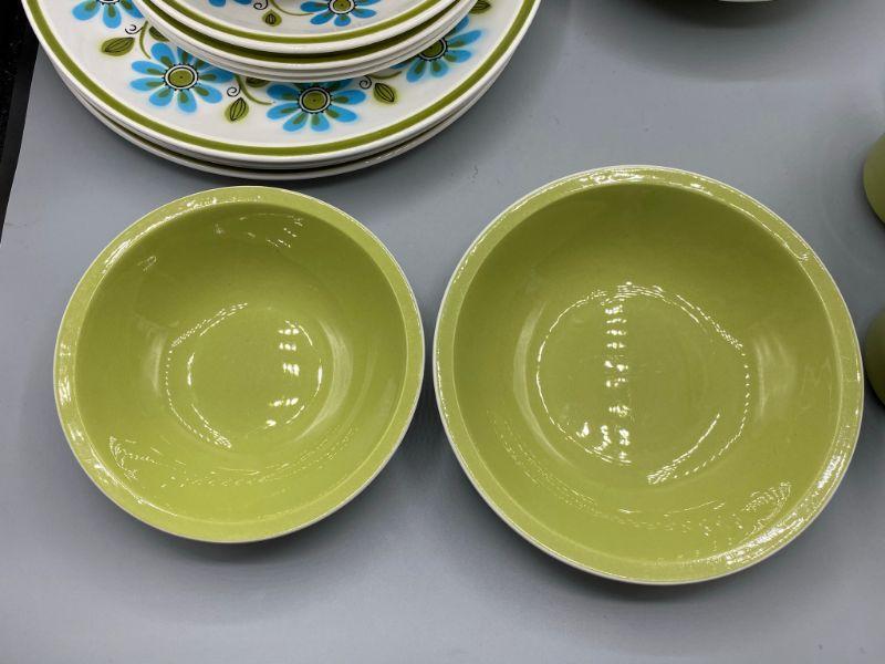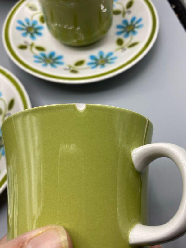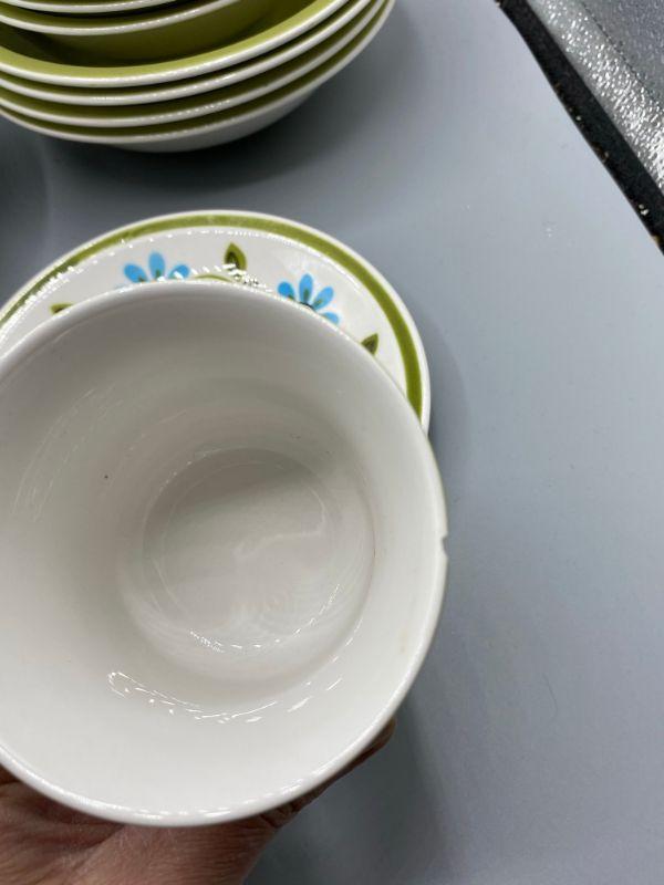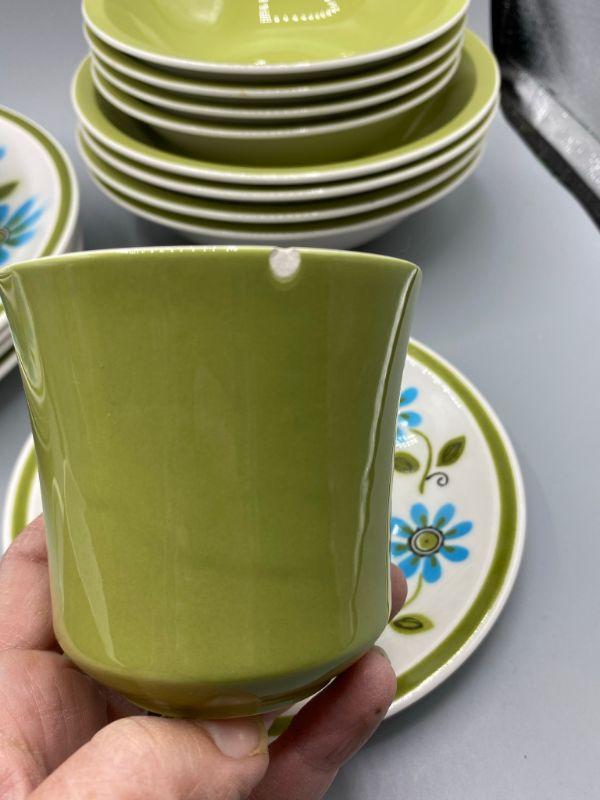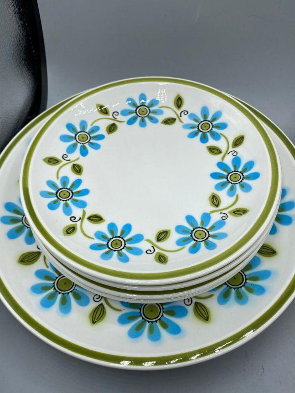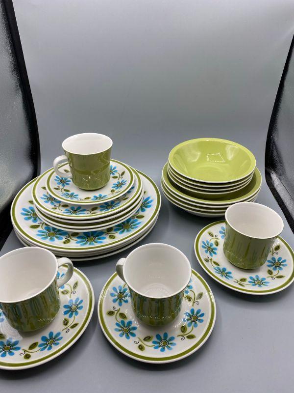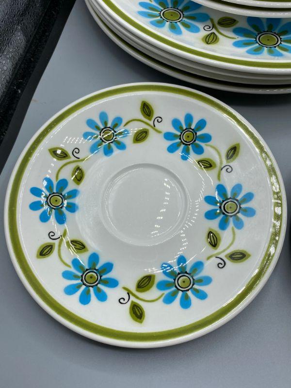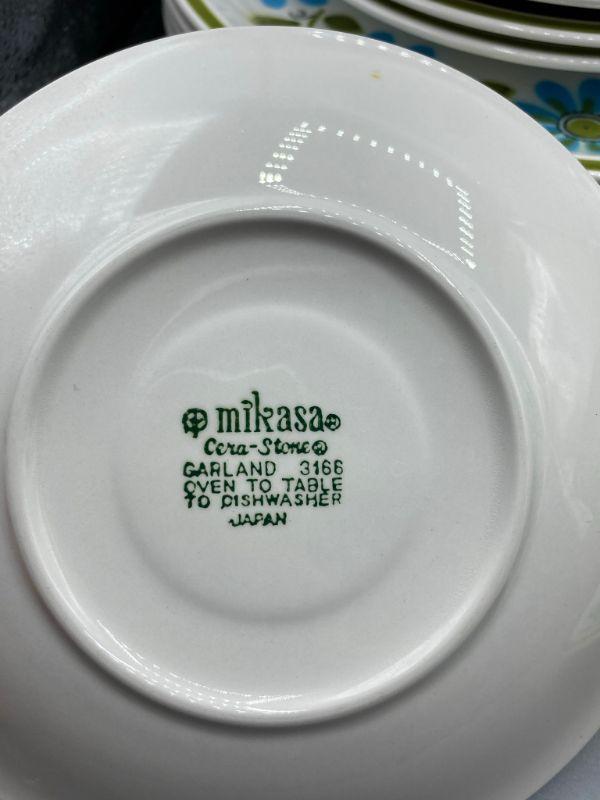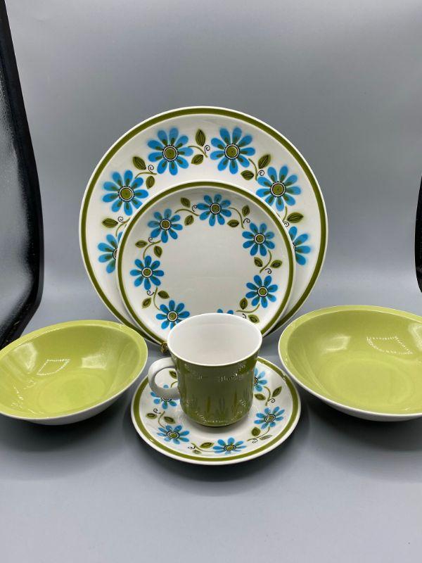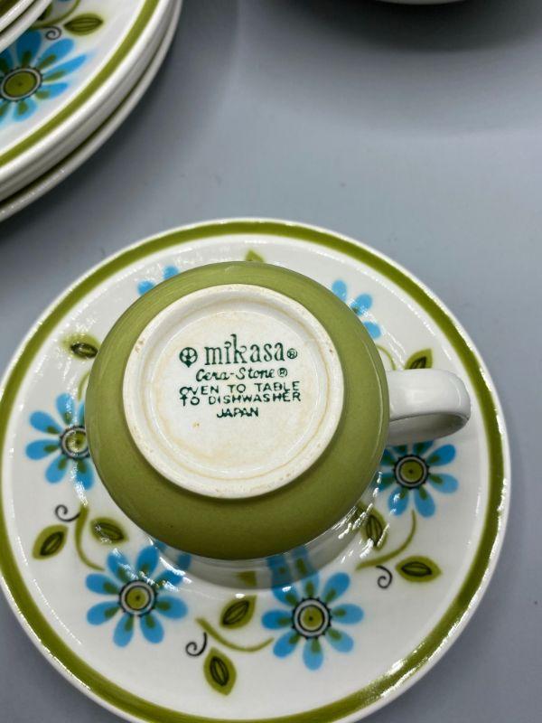 Vintage Mikasa "Garland" Cera-Stone Dishware Set. 6 piece setting, service for 4. Blue daisy flowers with green accent. Two of the cups have small chips, the rest are in good condition.